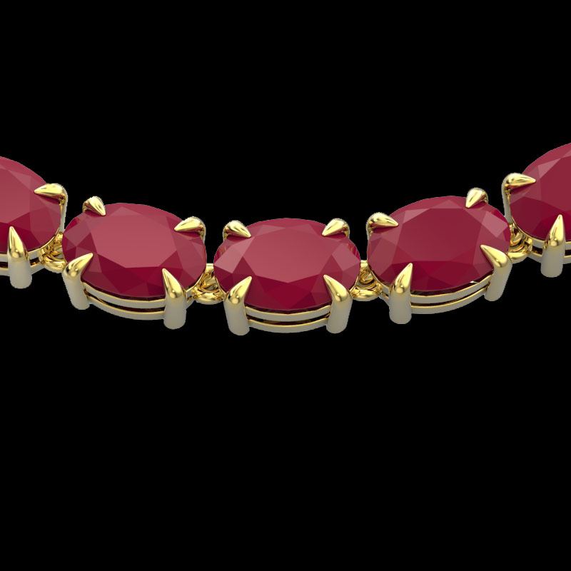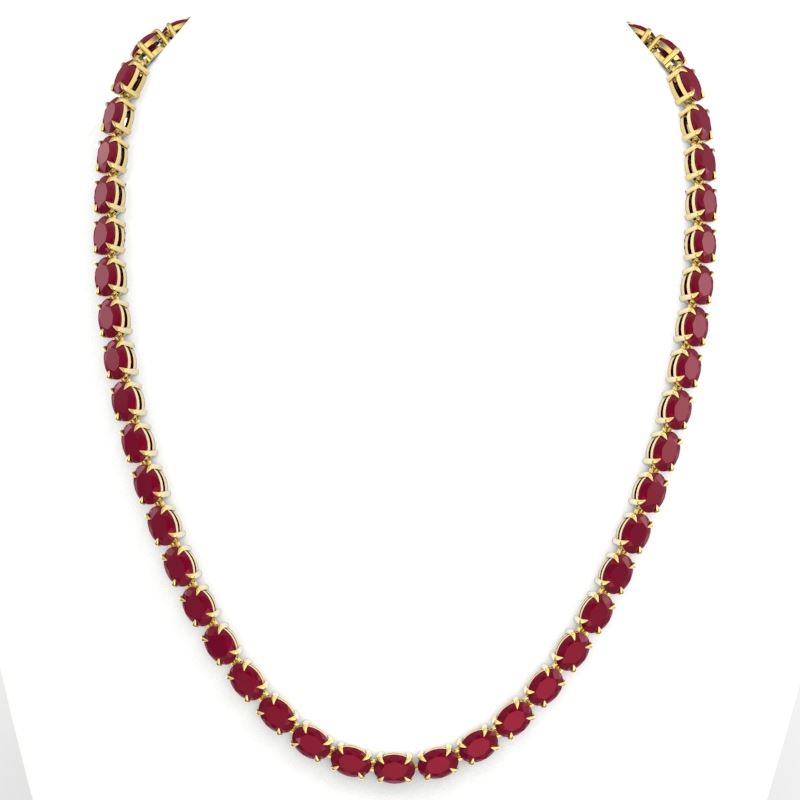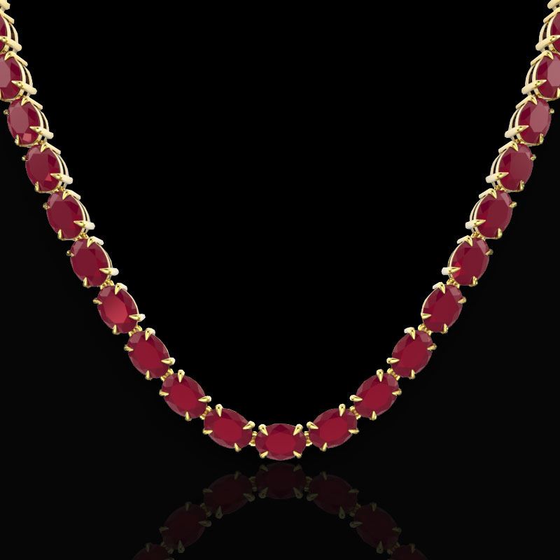 REF-234H9A -23408 ---- 68 CTW Ruby Eternity Designer Inspired Tennis Necklace 14K Yellow Gold ---- Luxury Designer Brand Necklace Appraised at $18,100 Certificate Number US23408 14k Yellow gold, Necklace Size is 16 Incehs, Necklace measuring approx. 9 mm x 16 INCHES, weighing in total approx. 24 grams. Made in the USA and is stamped 14k, Main stone 68 carat total weight containing 56 pieces of Mid-Opaque-Deep Red color with AAA quality Oval shape cut Ruby , Stone #2 carat total weight containing pieces of color with quality shape cut