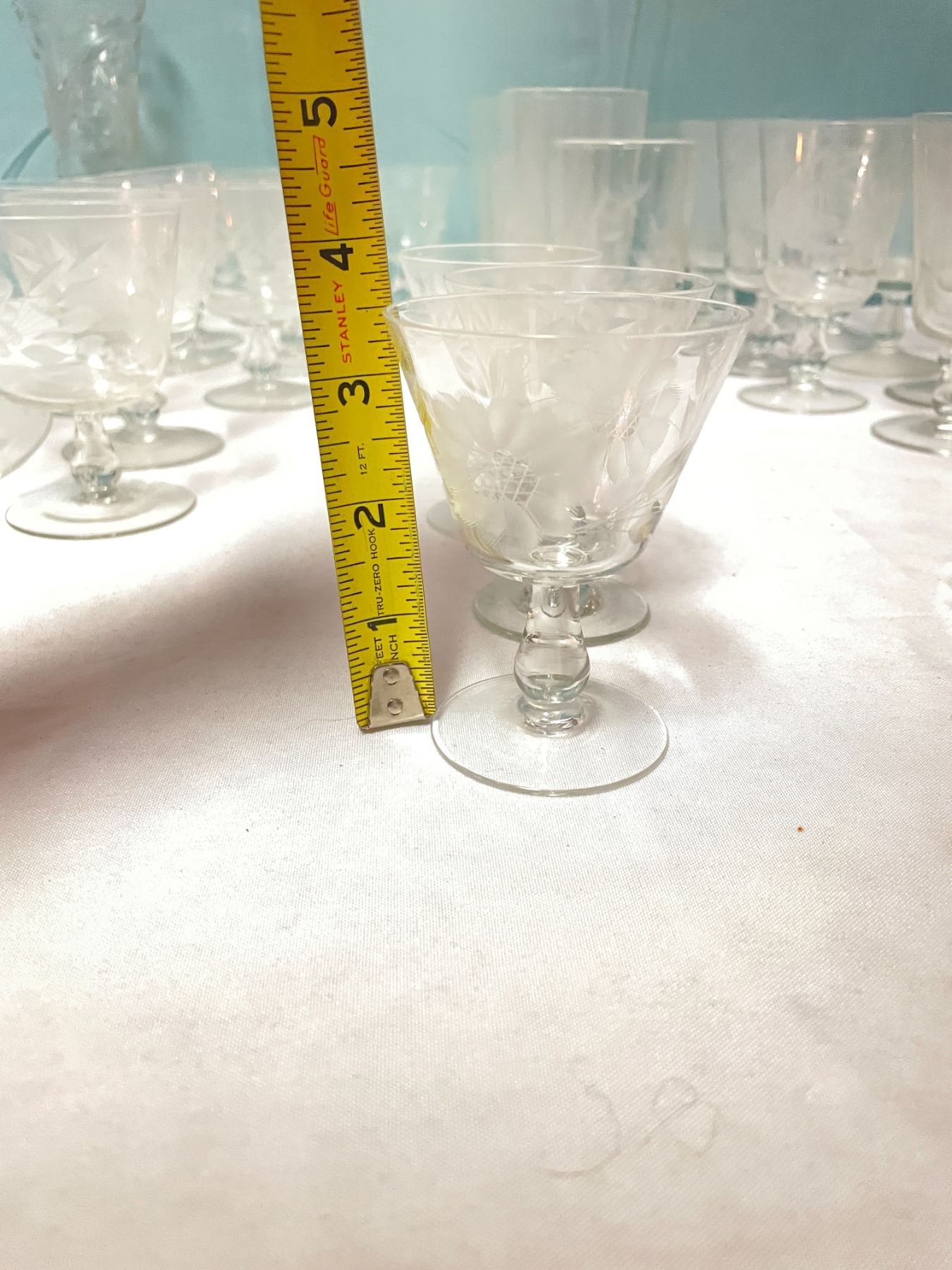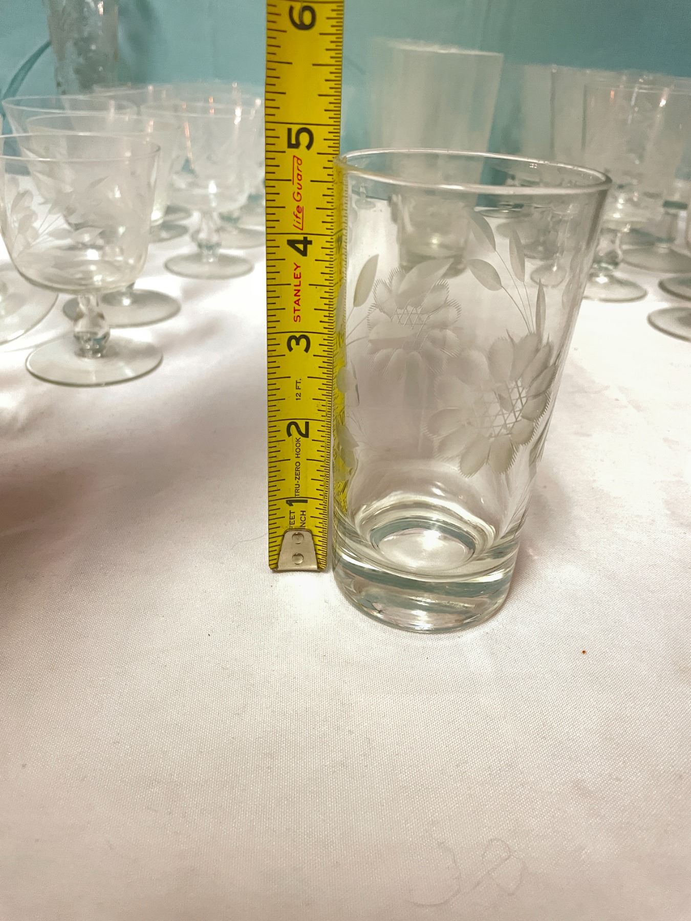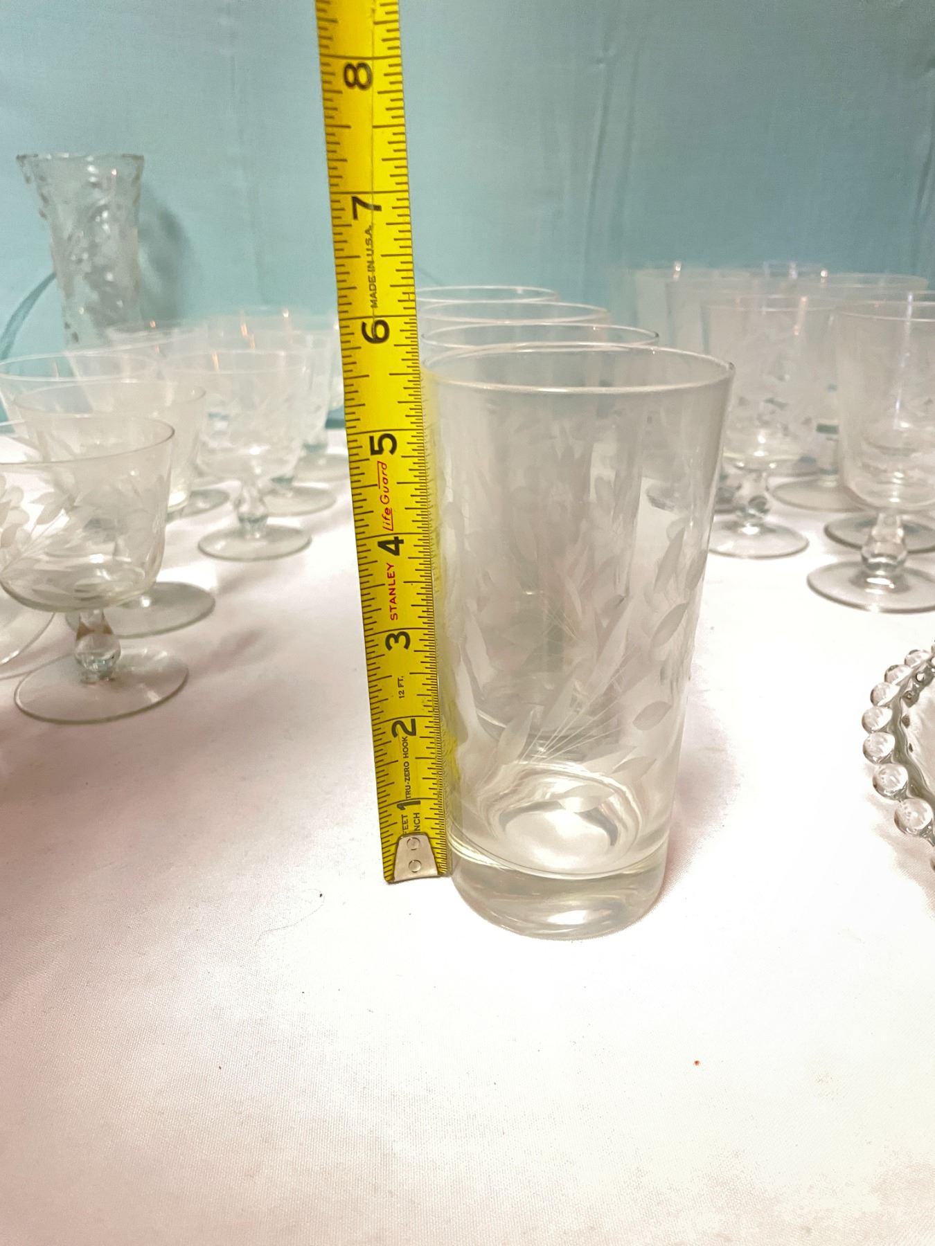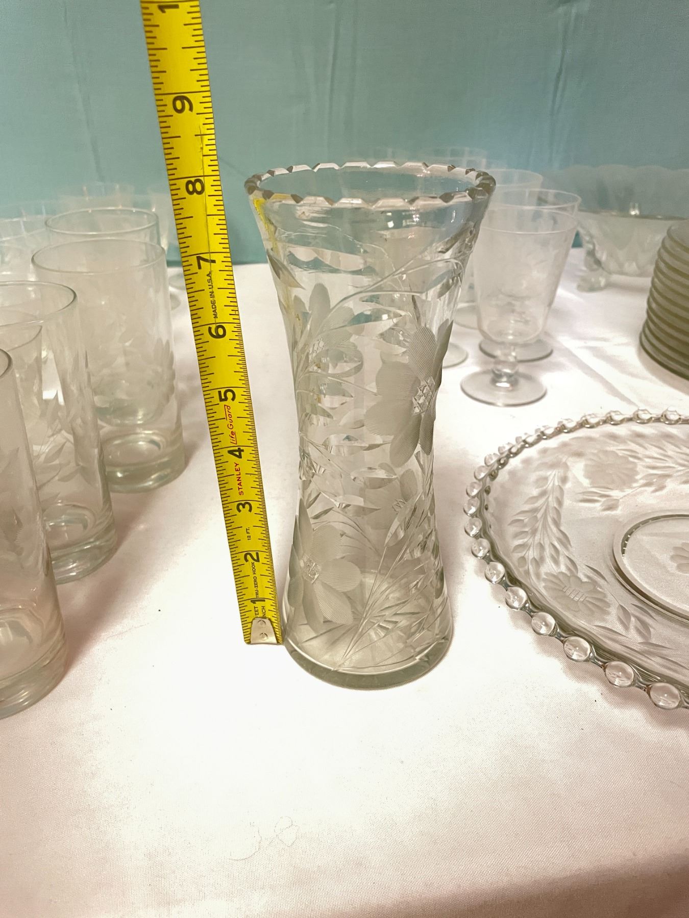 Includes 12 glasses @ 12" tall x 2 1/4" wide - 12 glasses @ 4" tall x 3" wide - 3 glasses @ 3.5" tall x 2.5" wide - `1 glass @ 5" tall x 2.5" wide - 4 glasses @ 5.5" tall x 2 3/4" wide - 9 glasses @ 5" tall x 3" wide - 3 bowls 3.5" diameter - 1 platter 10 1/4" diameter - 7 plates 6.5" diameter - 12 plates 8" diameter - Bowl 10.5" diameter - 1 Vase 8" tall - Cream and Sugar bowl