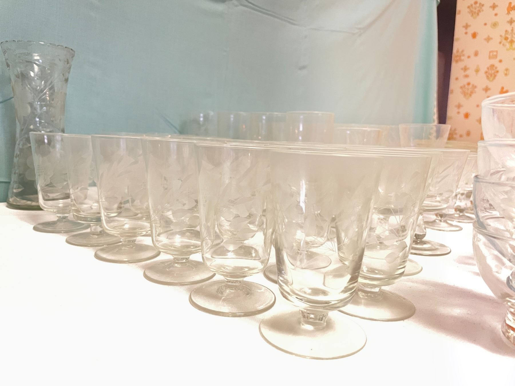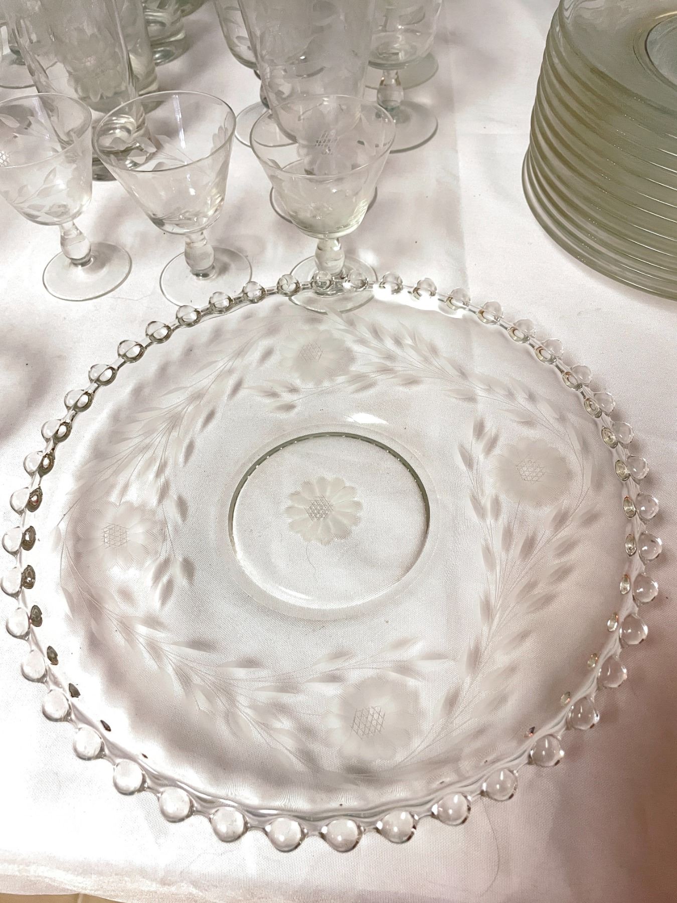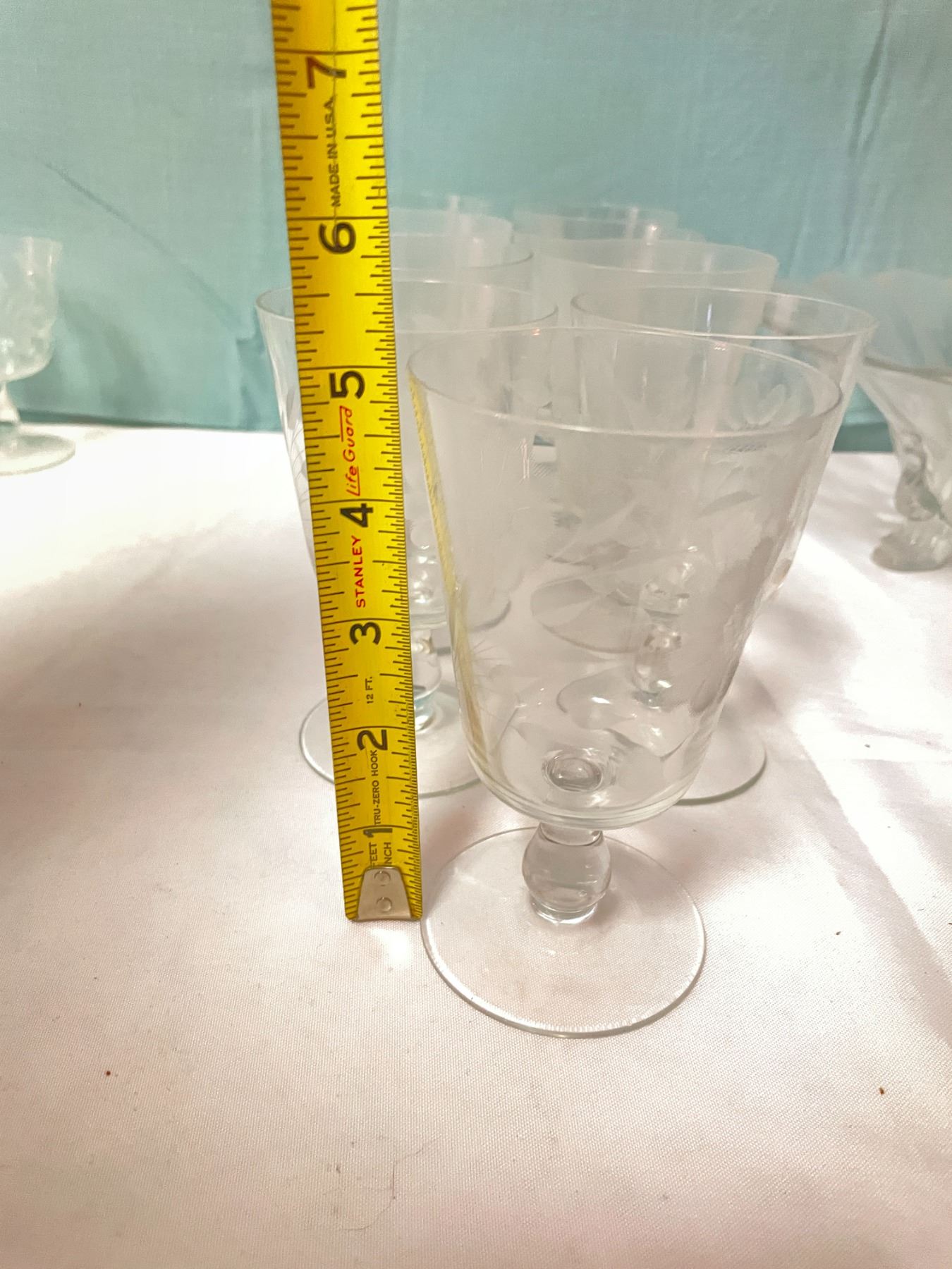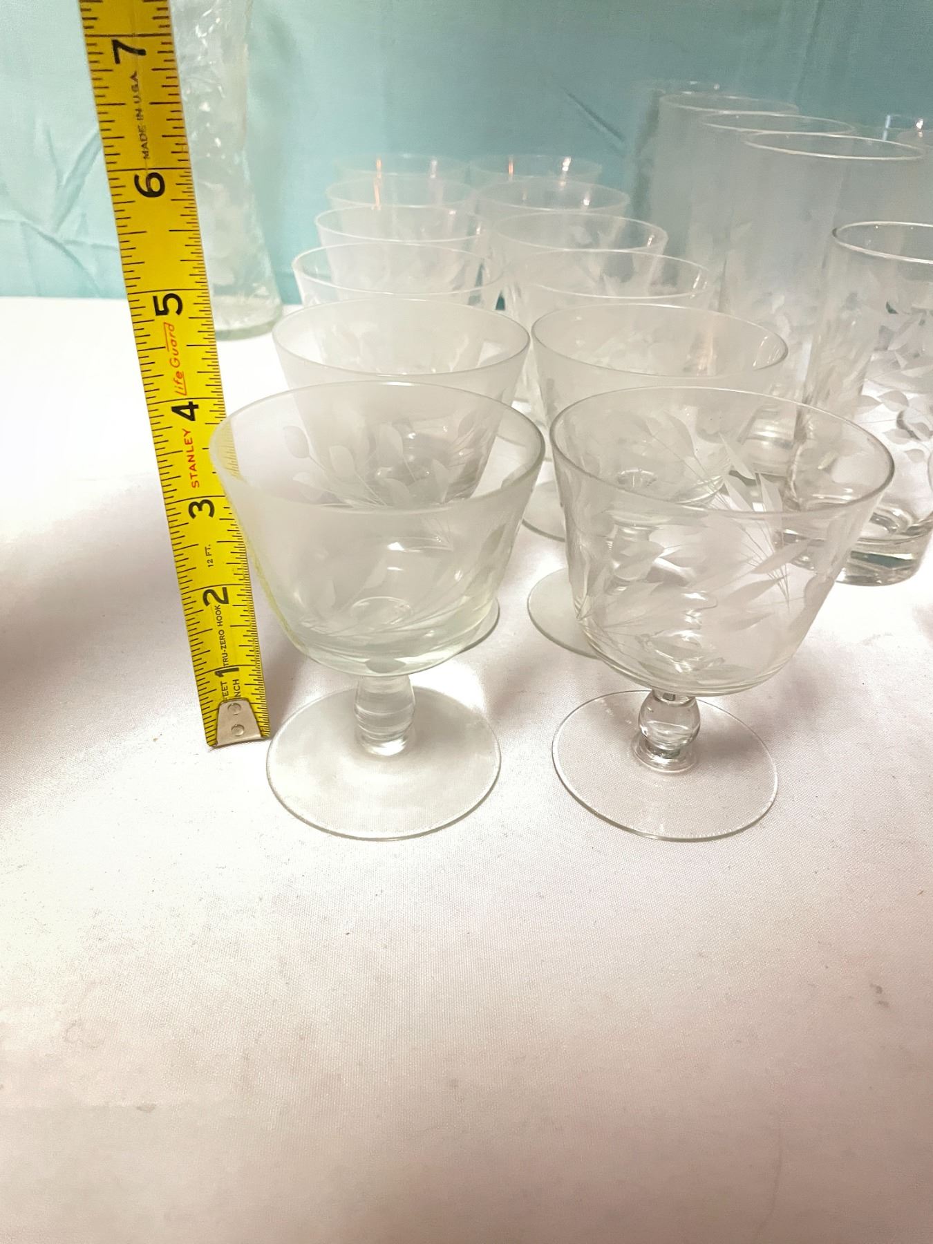 Includes 12 glasses @ 12" tall x 2 1/4" wide - 12 glasses @ 4" tall x 3" wide - 3 glasses @ 3.5" tall x 2.5" wide - `1 glass @ 5" tall x 2.5" wide - 4 glasses @ 5.5" tall x 2 3/4" wide - 9 glasses @ 5" tall x 3" wide - 3 bowls 3.5" diameter - 1 platter 10 1/4" diameter - 7 plates 6.5" diameter - 12 plates 8" diameter - Bowl 10.5" diameter - 1 Vase 8" tall - Cream and Sugar bowl