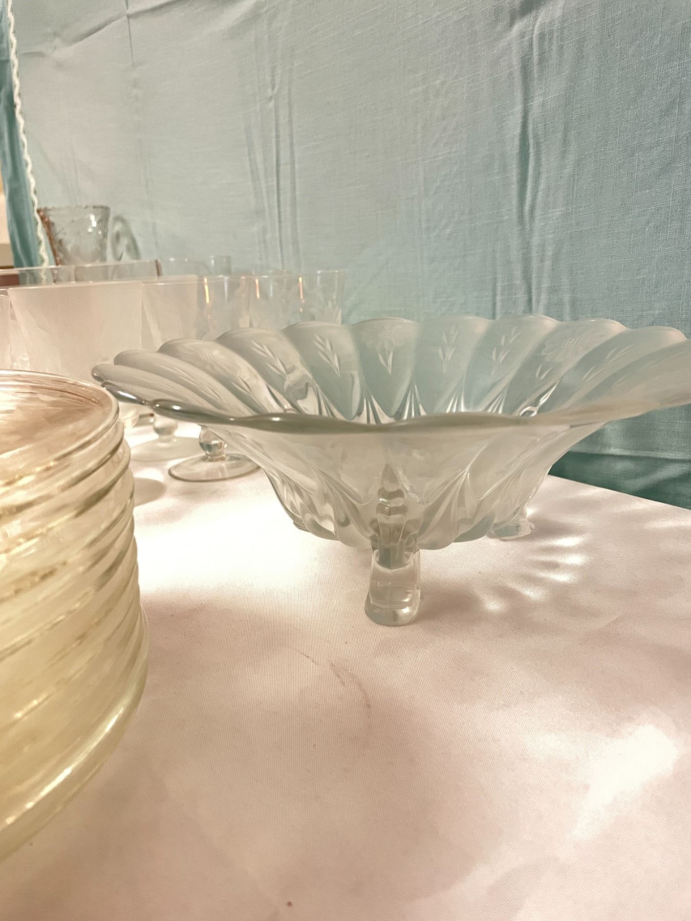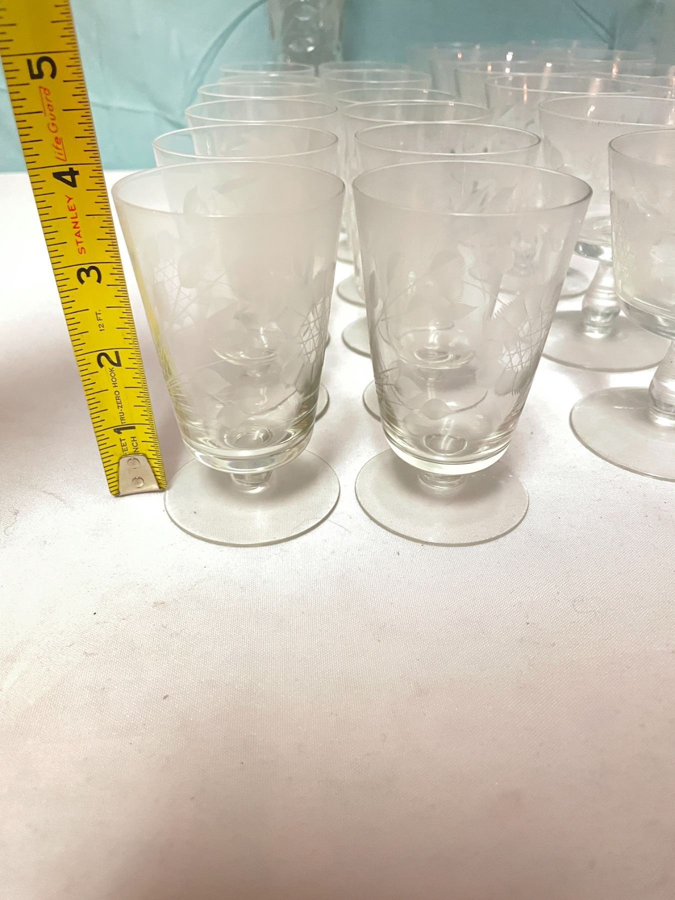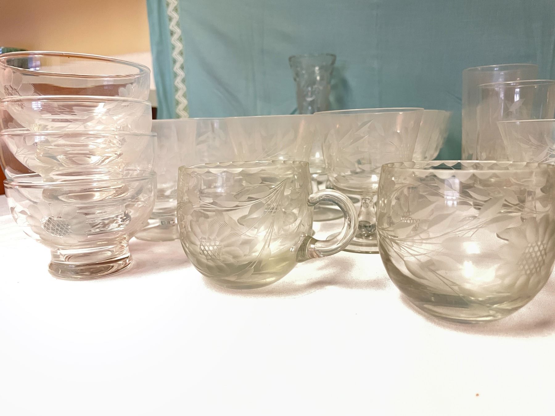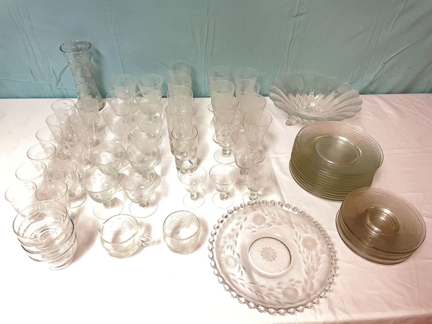Includes 12 glasses @ 12" tall x 2 1/4" wide - 12 glasses @ 4" tall x 3" wide - 3 glasses @ 3.5" tall x 2.5" wide - `1 glass @ 5" tall x 2.5" wide - 4 glasses @ 5.5" tall x 2 3/4" wide - 9 glasses @ 5" tall x 3" wide - 3 bowls 3.5" diameter - 1 platter 10 1/4" diameter - 7 plates 6.5" diameter - 12 plates 8" diameter - Bowl 10.5" diameter - 1 Vase 8" tall - Cream and Sugar bowl
