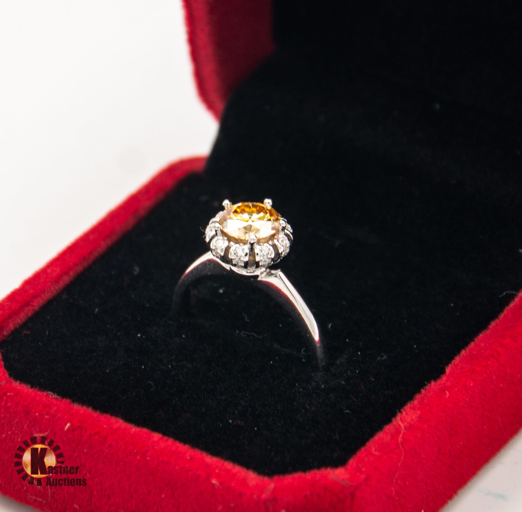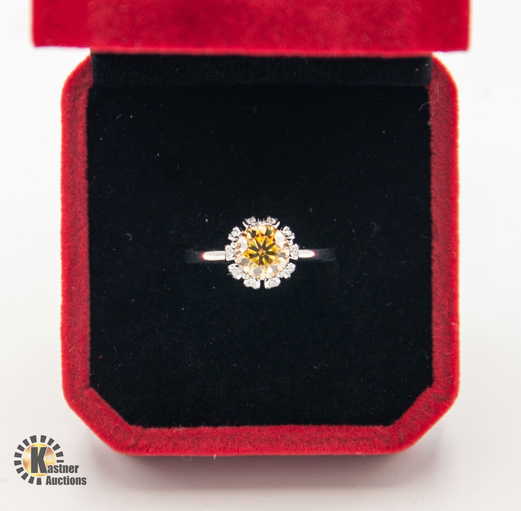 BRILLIANT CUT MOISSANITE STONE VVS CHAMPAGNE COLOR SET IN CENTER IN 925 SILVER RING SIZE ADJUSTABLE **ALL ITEMS MUST BE REMOVED BY 5PM SATURDAY, OCTOBER 5TH 2024. ALL REMAINING ITEMS WILL BE SUBJECT TO A $6.00 PER DAY STORAGE CHARGE. ANY ITEMS REMAINING AFTER MONDAY, OCTOBER 21ST 2024 WILL BE CONSIDERED FORFEITED. NO REFUNDS WILL BE ISSUED FOR FORFEITED ITEMS. TO SCHEDULE A PICK UP APPOINTMENT CLICK HERE