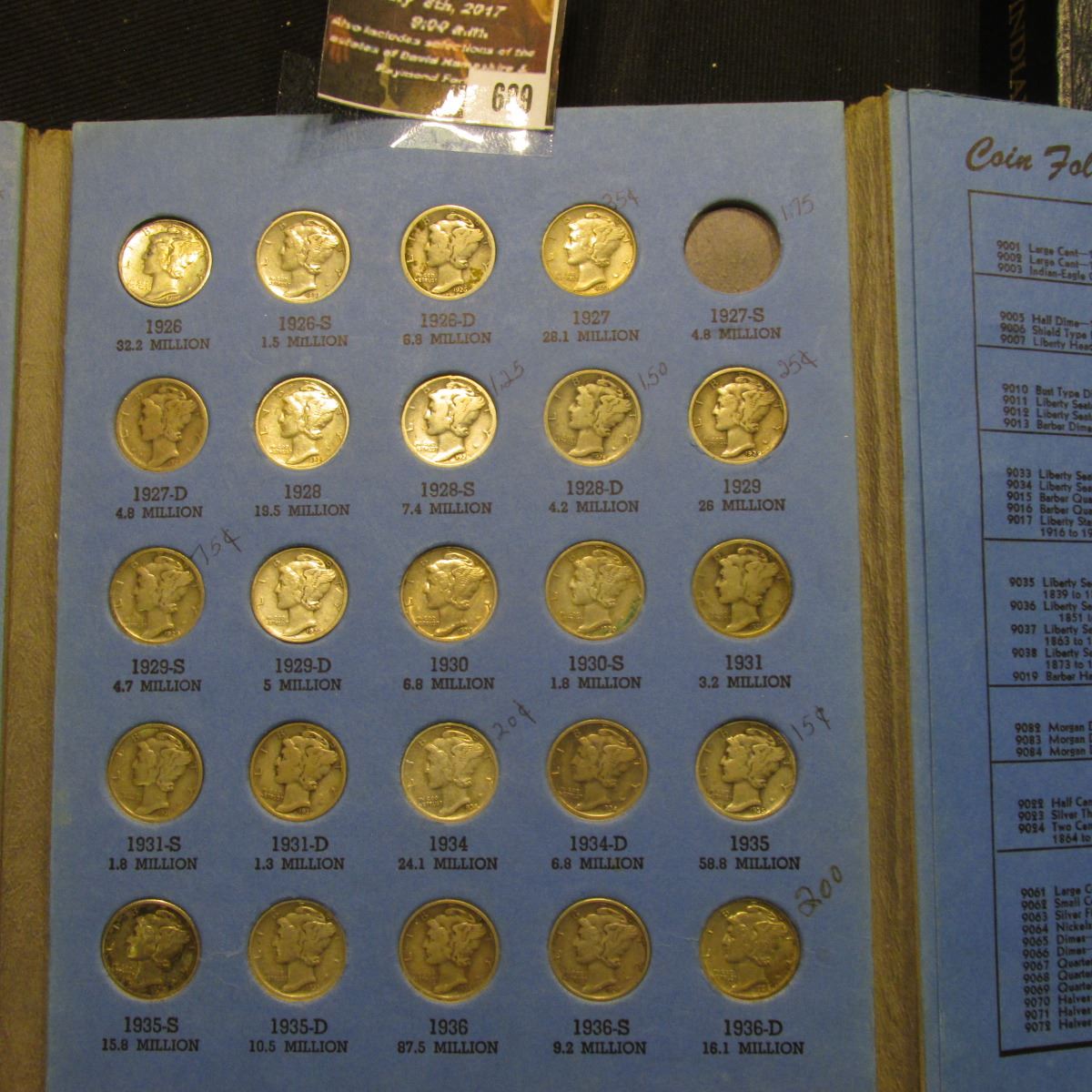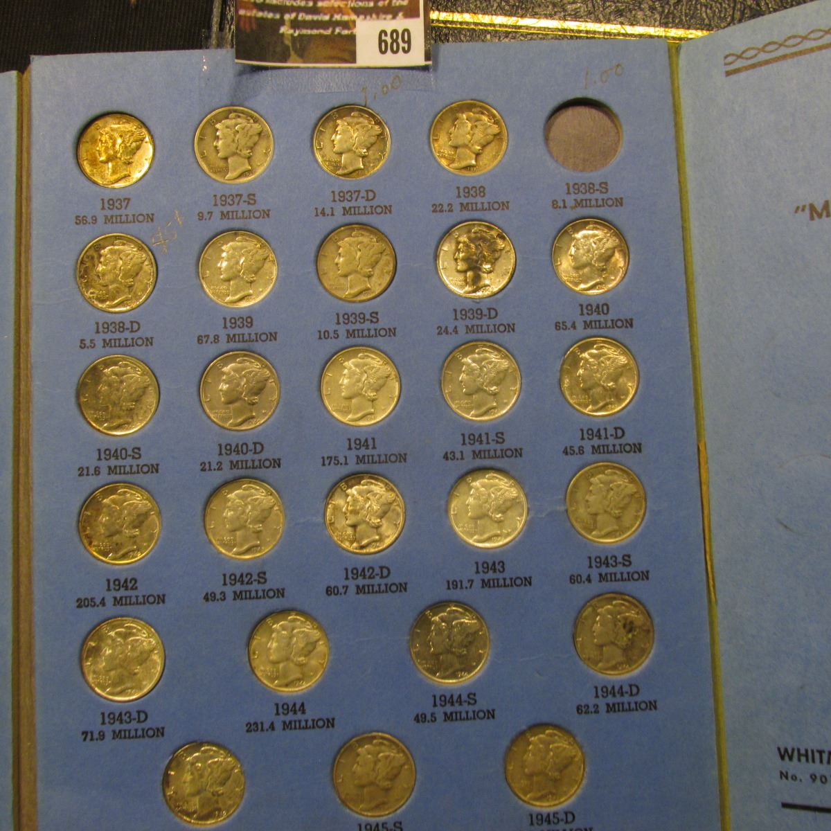 689.1916-45 Nearly Complete Set of Mercury Dimes, the 1916 D is too low a grade to consider its genuiness, the 1921 P in Good with moderate toning; missing the 1921 D, 27 S, & 38 S, Many of the coins are AU to Uncirculated.