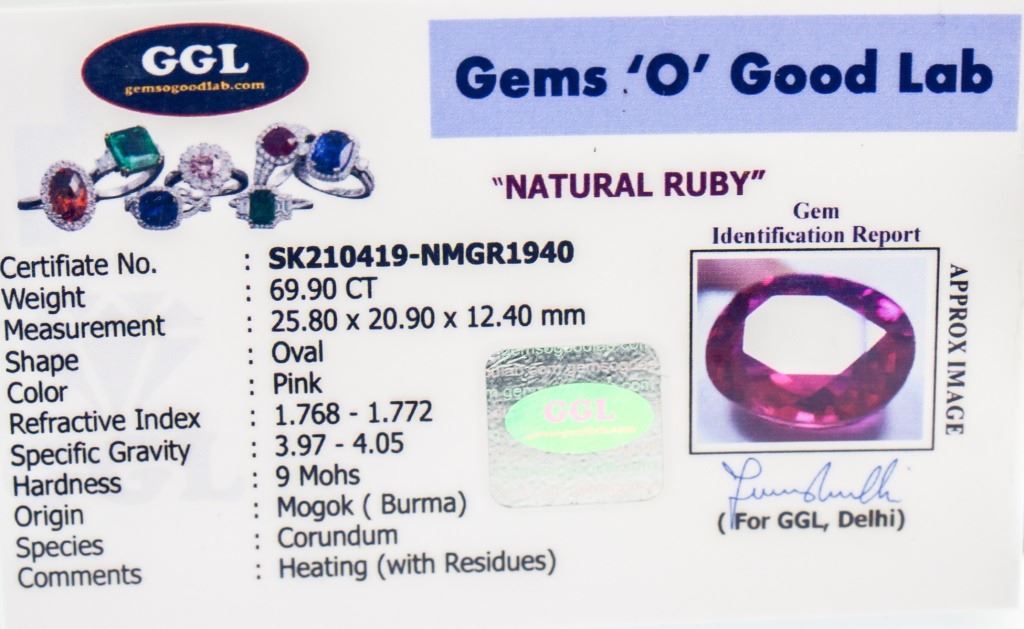 One (1) 69.90 ct oval cut pink "NATURAL RUBY". Origin: Burma. Accompanied with a GGL certificate. 25.80 x 20.90 x 12.40 mm