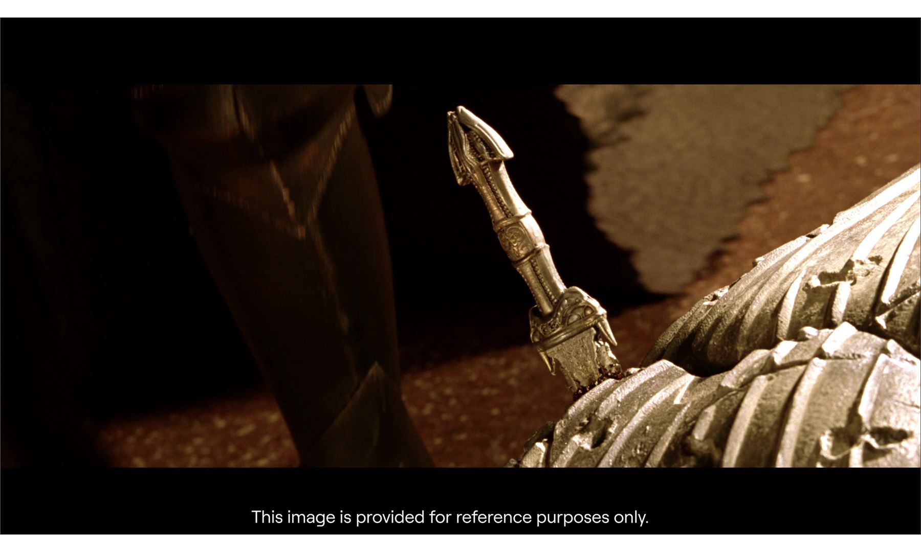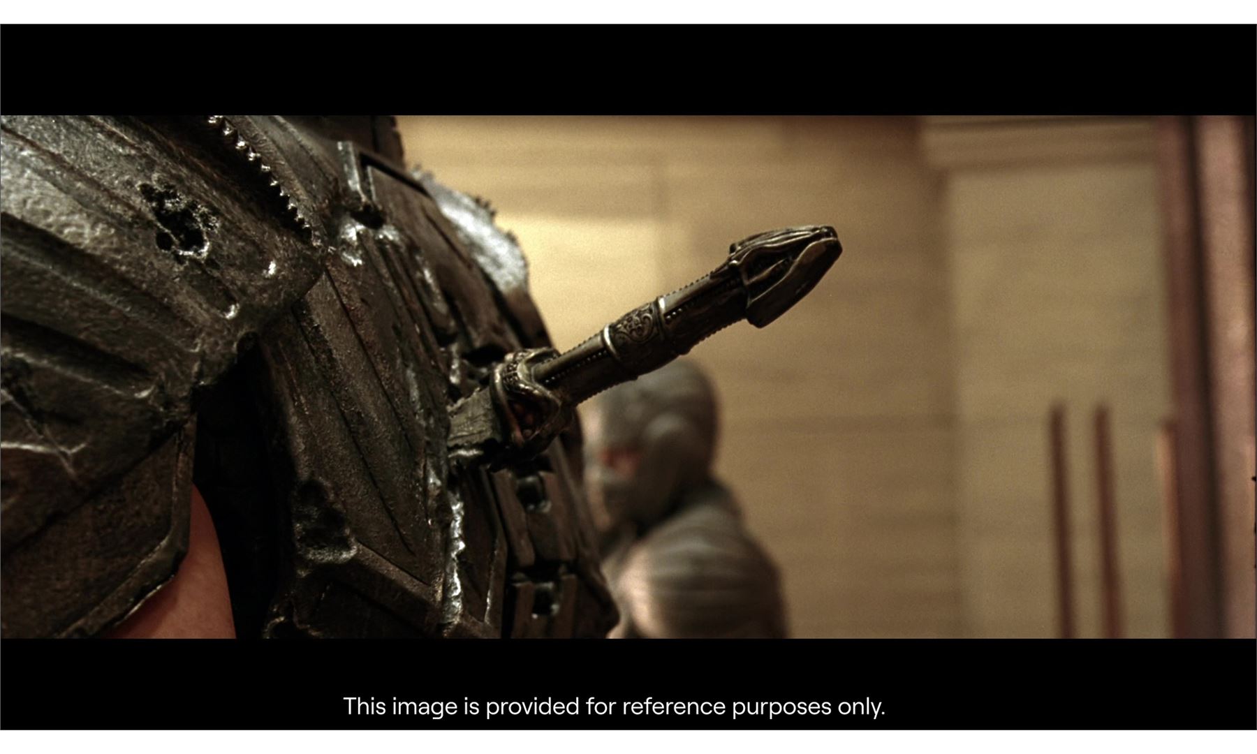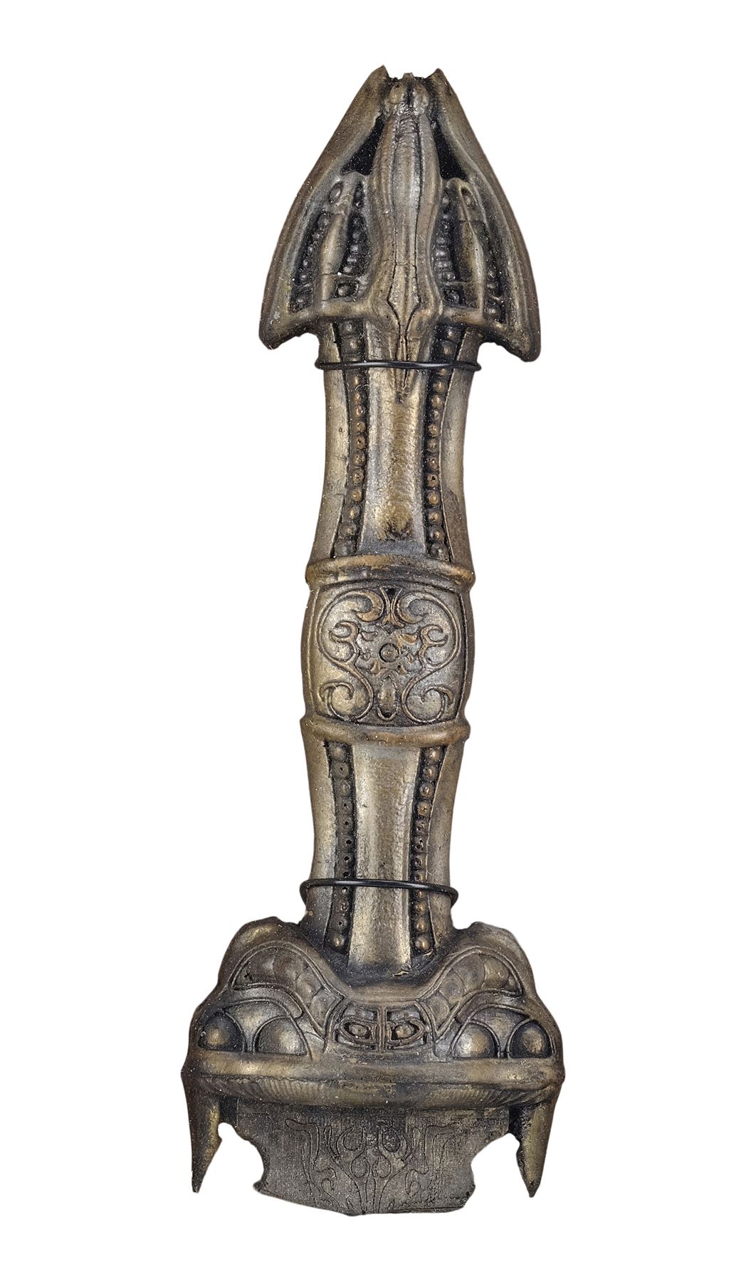 This ornately detailed knife hilt with Necromonger style designs is made of rubber that is painted a bronze color to resemble metal. It comes in a custom-made display with three stills from the scene. This lot exhibits pitting in the display frame, and a buildup of grime in the fine crevices. Dimensions: (displayed) 13.75" x 16.5" x 2.5" (35 cm x 42 cm x 6.5 cm)