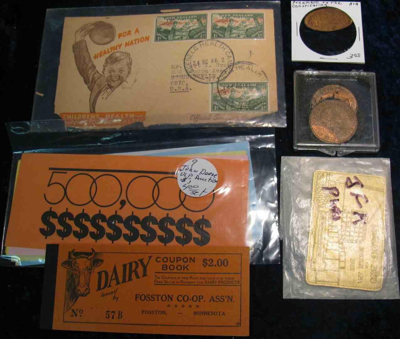 693. (2) Great Britain Large Pennies in a case with old foam; 1982 Boston ANA Metal Library Pass; Fosston, Minnesota Dairy Coupon booklet (unused); Preamble to the Constitution elongated cent; 9-Piece Set John Deere Currency; & Children's Health Cover with stamps.