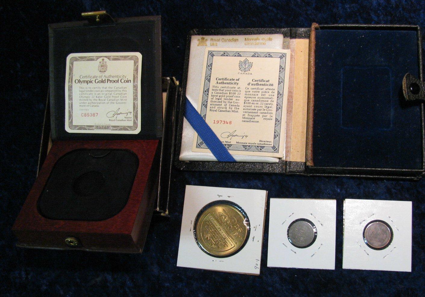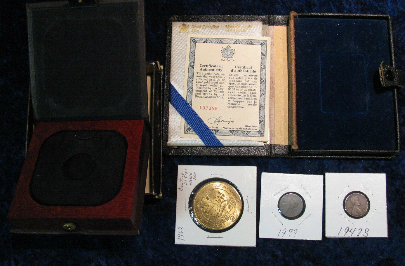 696. (2) Empty Boxes for Canada Gold Coins, 1962 Seattle World's Fair Medal; & (2) Old Wheat Cents.