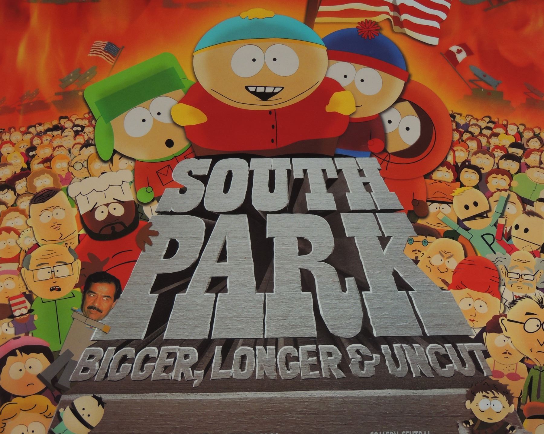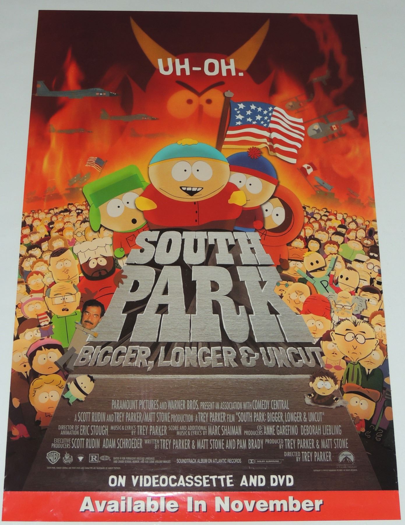 SOUTH PARK THE MOVIE: BIGGER LONGER AND UNCUT 42X27 INCHES IN SIZE FROM BUYOUT PURCHASE OF CANADIAN VHS STORE OLD STOCK ADVERTISING DISPLAY