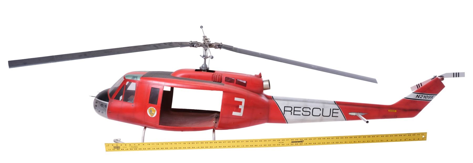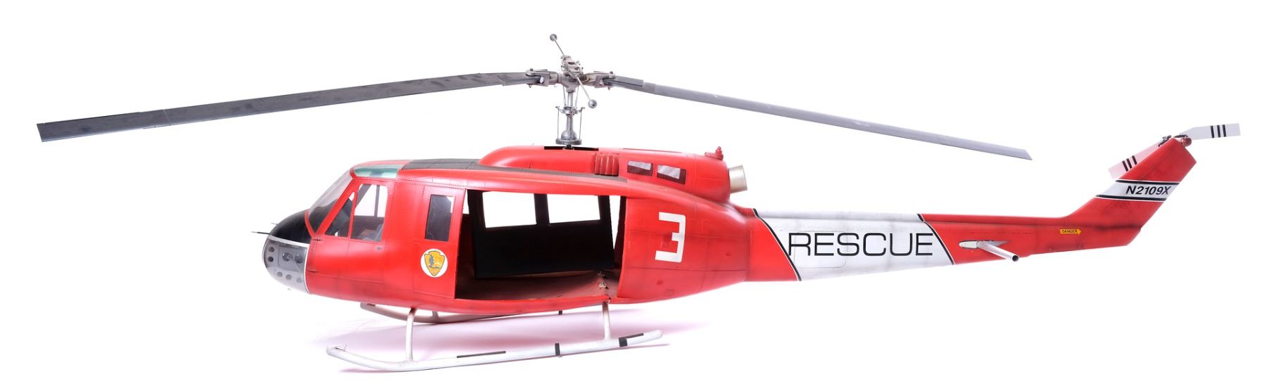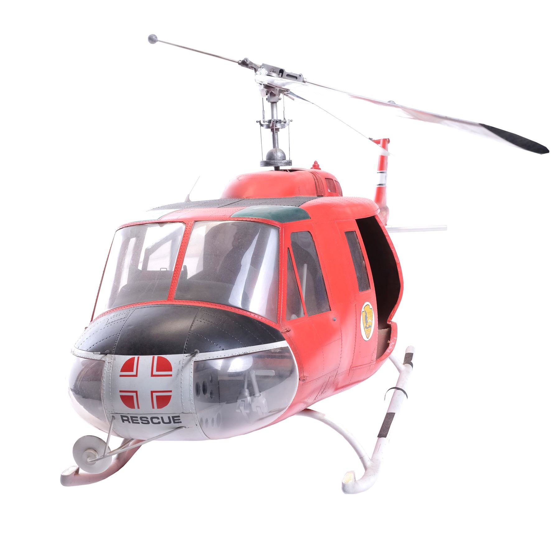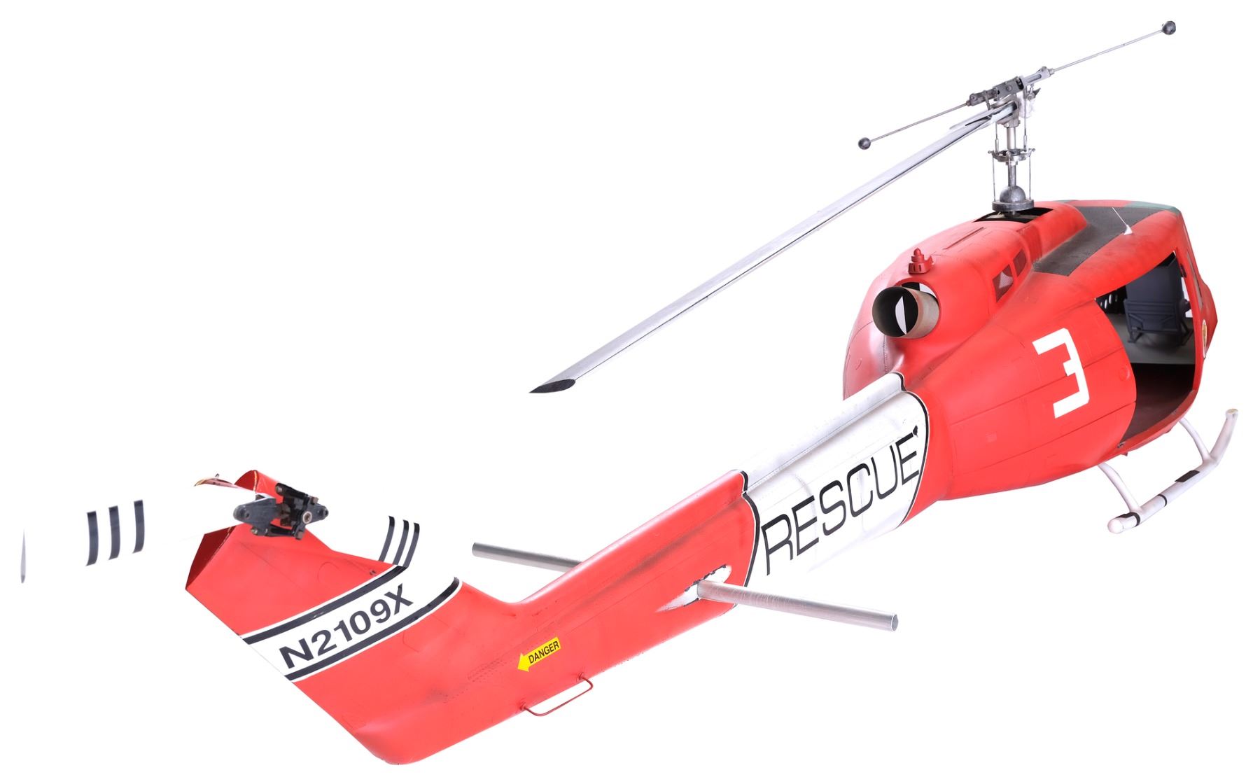 This miniature, a replica modeled on a production original and numbered "N2109X," is constructed from fiberglass-backed resin with acrylic windows, a plywood cockpit painted gray, and plastic and metal detailing. The helicopter is painted white and orange, labeled "RESCUE" on both sides, and applied with vinyl pinstriping as well as the number "3" and a ranger logo on its doors. A metal armature and two removable doors are affixed to the tail. The model exhibits grime build up, chipped paint, and discoloration from adhesives. Dimensions: 87" x 24" x 30" (221 cm x 61 cm x 76.25 cm)