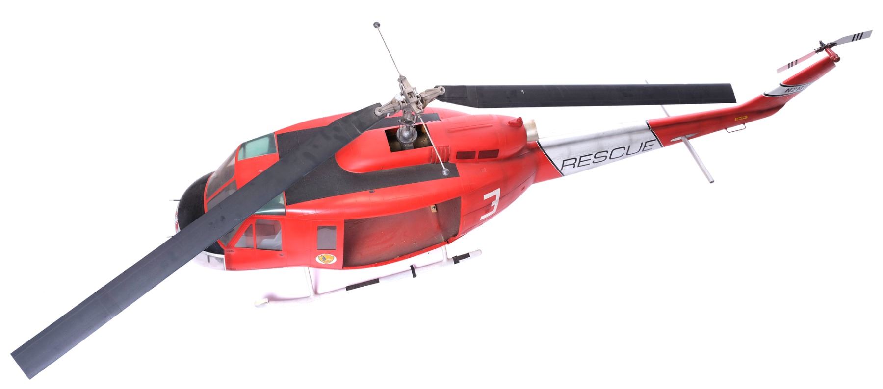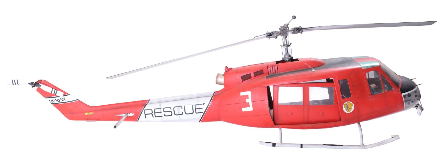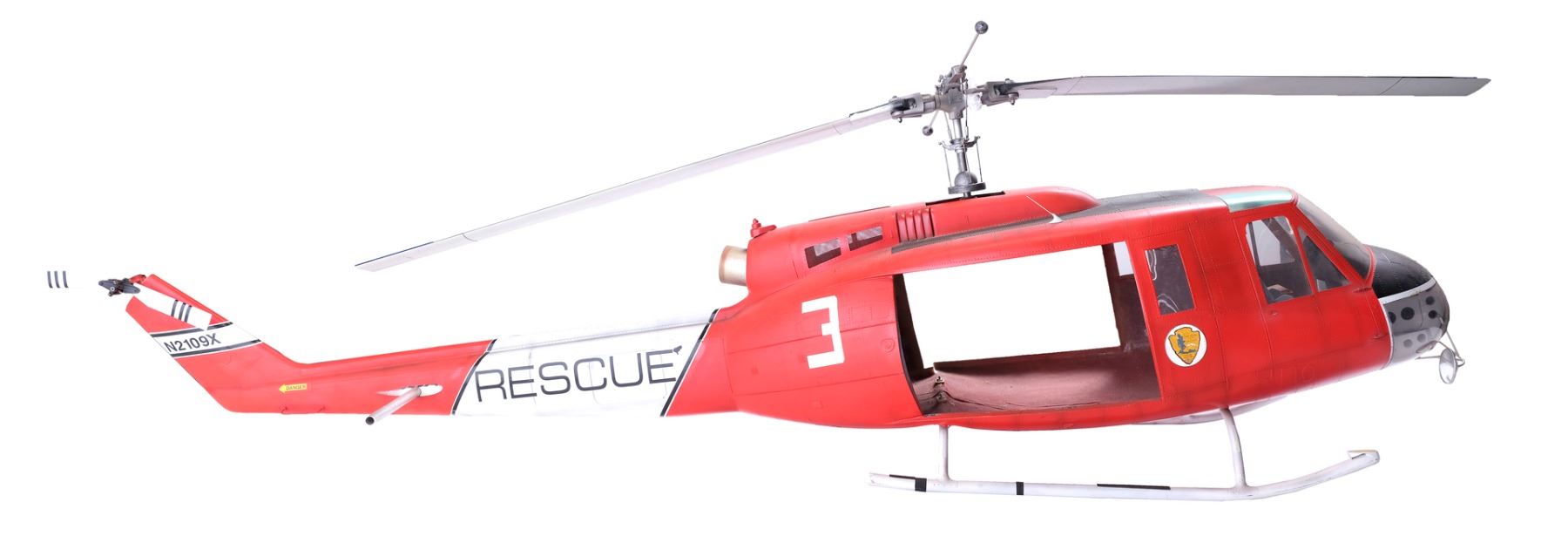 This miniature, a replica modeled on a production original and numbered "N2109X," is constructed from fiberglass-backed resin with acrylic windows, a plywood cockpit painted gray, and plastic and metal detailing. The helicopter is painted white and orange, labeled "RESCUE" on both sides, and applied with vinyl pinstriping as well as the number "3" and a ranger logo on its doors. A metal armature and two removable doors are affixed to the tail. The model exhibits grime build up, chipped paint, and discoloration from adhesives. Dimensions: 87" x 24" x 30" (221 cm x 61 cm x 76.25 cm)