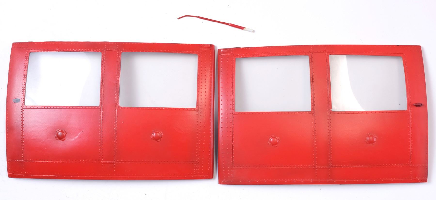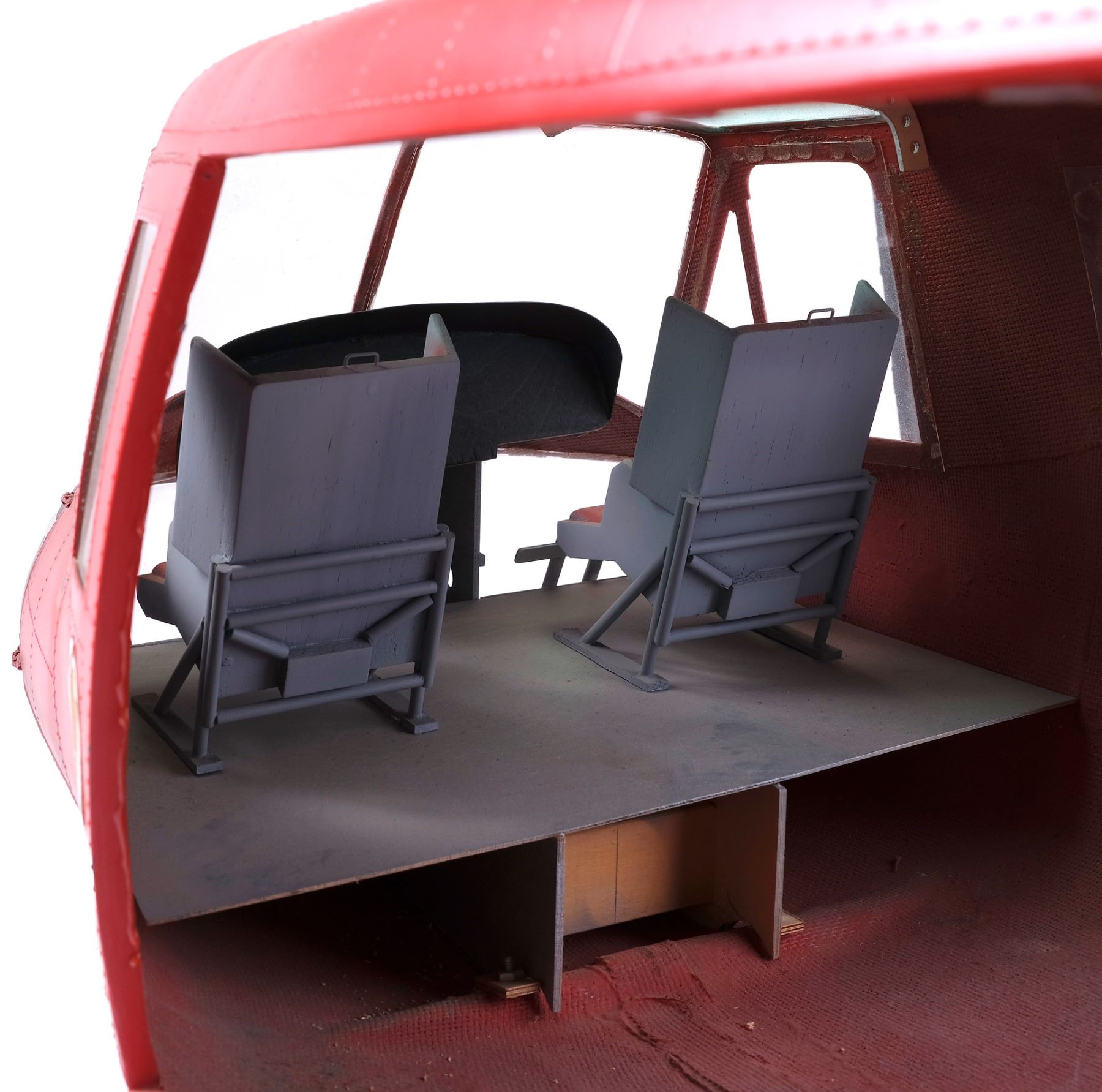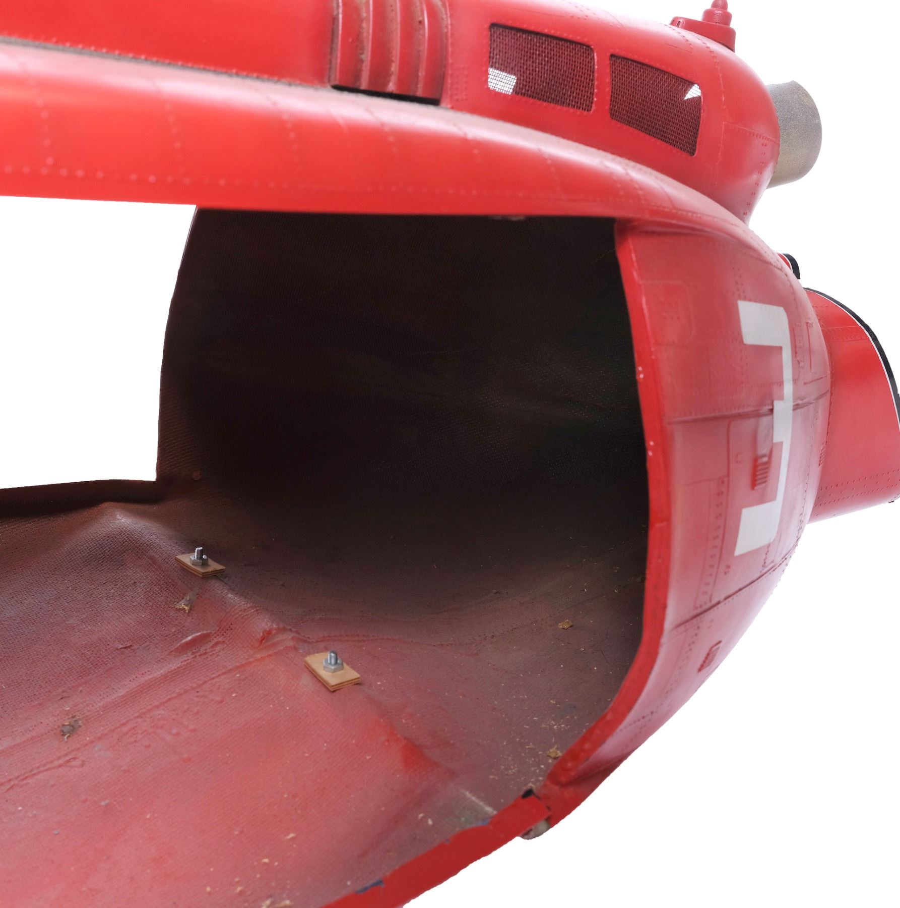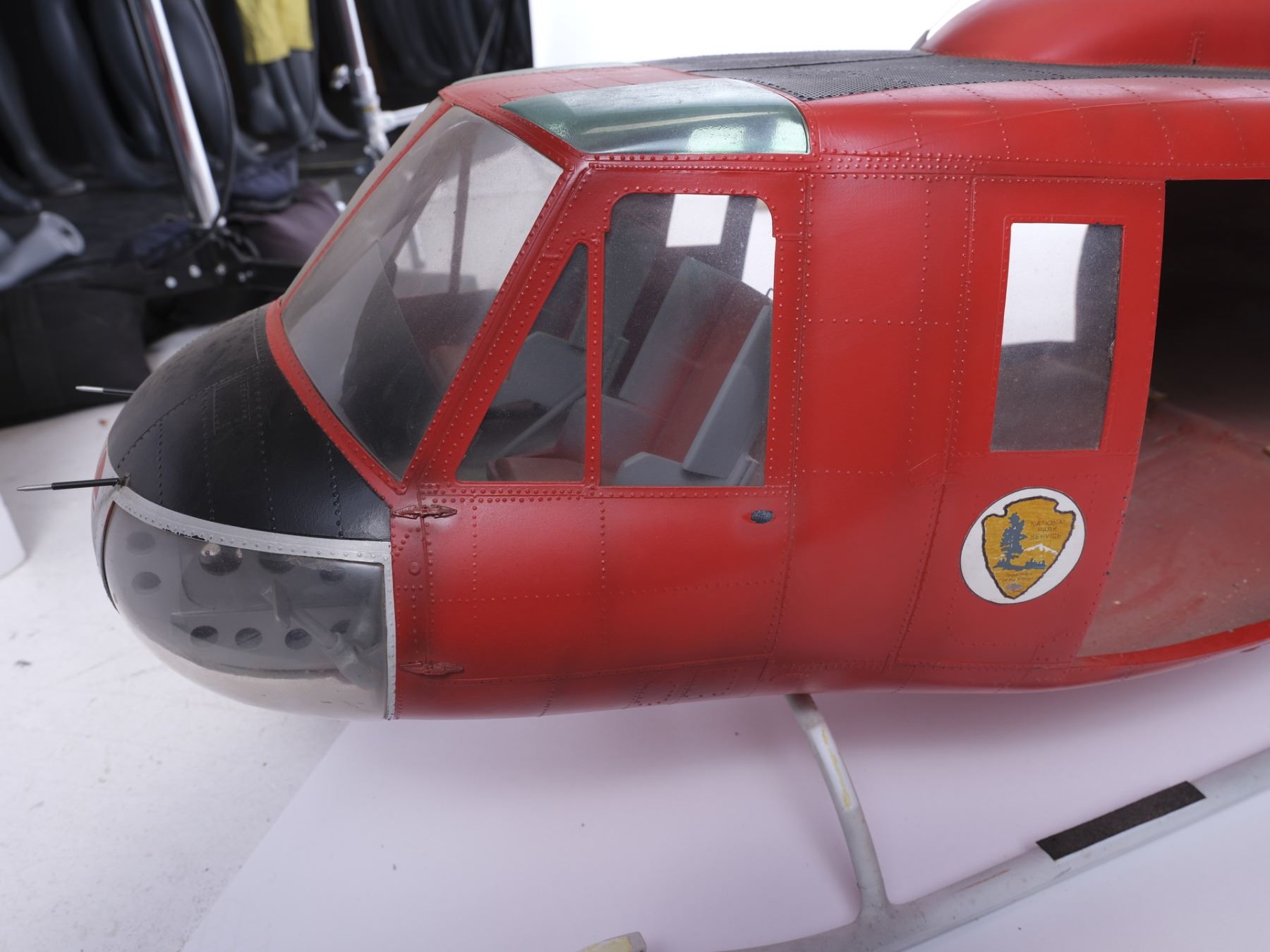 This miniature, a replica modeled on a production original and numbered "N2109X," is constructed from fiberglass-backed resin with acrylic windows, a plywood cockpit painted gray, and plastic and metal detailing. The helicopter is painted white and orange, labeled "RESCUE" on both sides, and applied with vinyl pinstriping as well as the number "3" and a ranger logo on its doors. A metal armature and two removable doors are affixed to the tail. The model exhibits grime build up, chipped paint, and discoloration from adhesives. Dimensions: 87" x 24" x 30" (221 cm x 61 cm x 76.25 cm)