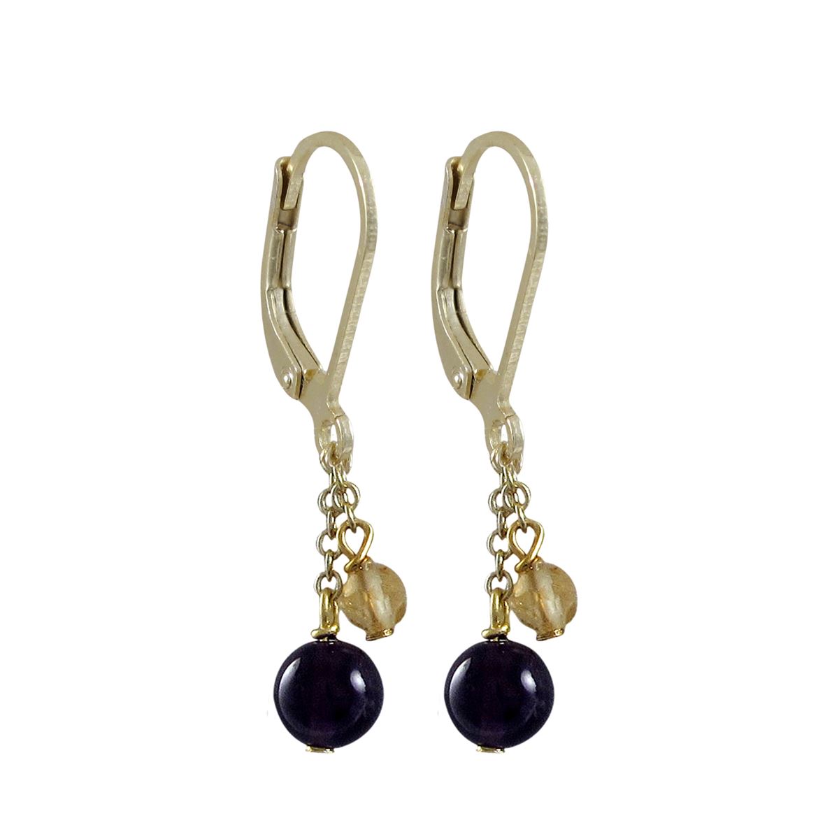6Mm Amy And 4Mm Citrine Semi Precious Balls On Gold Plated Sterling Silver Lever Back Earrings, 1.18"