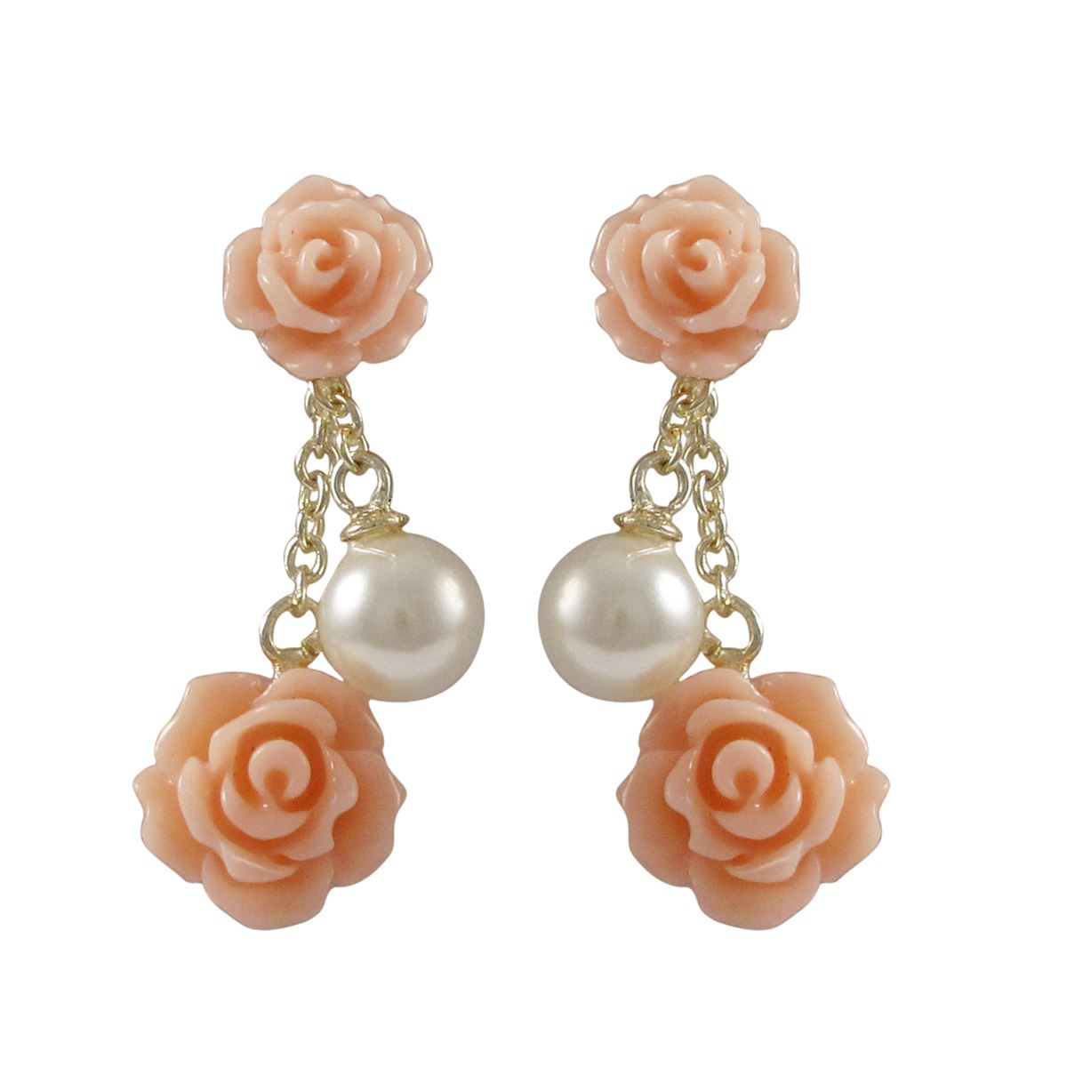 6Mm And 8Mm Peach Rose Flower With 7Mm White Pearl Dangling, Gold Plated Sterling Silver Post Earrings, 0.94"
