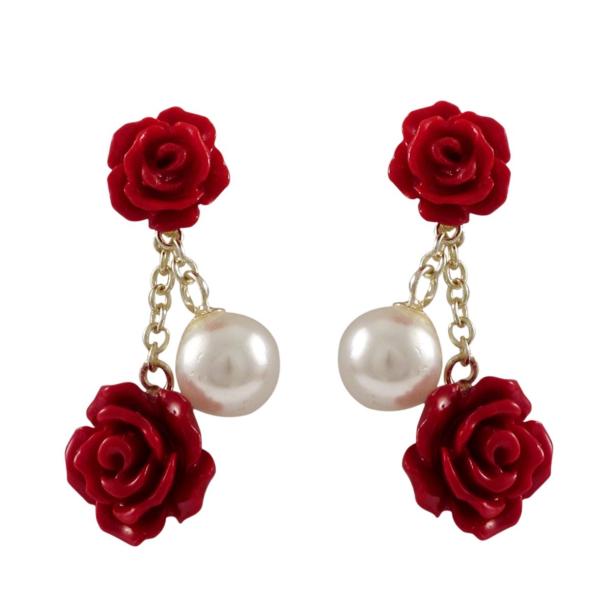 6Mm And 8Mm Red Rose Flower With 5Mm White Pearl Dangling, Gold Plated Sterling Silver Post Earrings, 0.94"