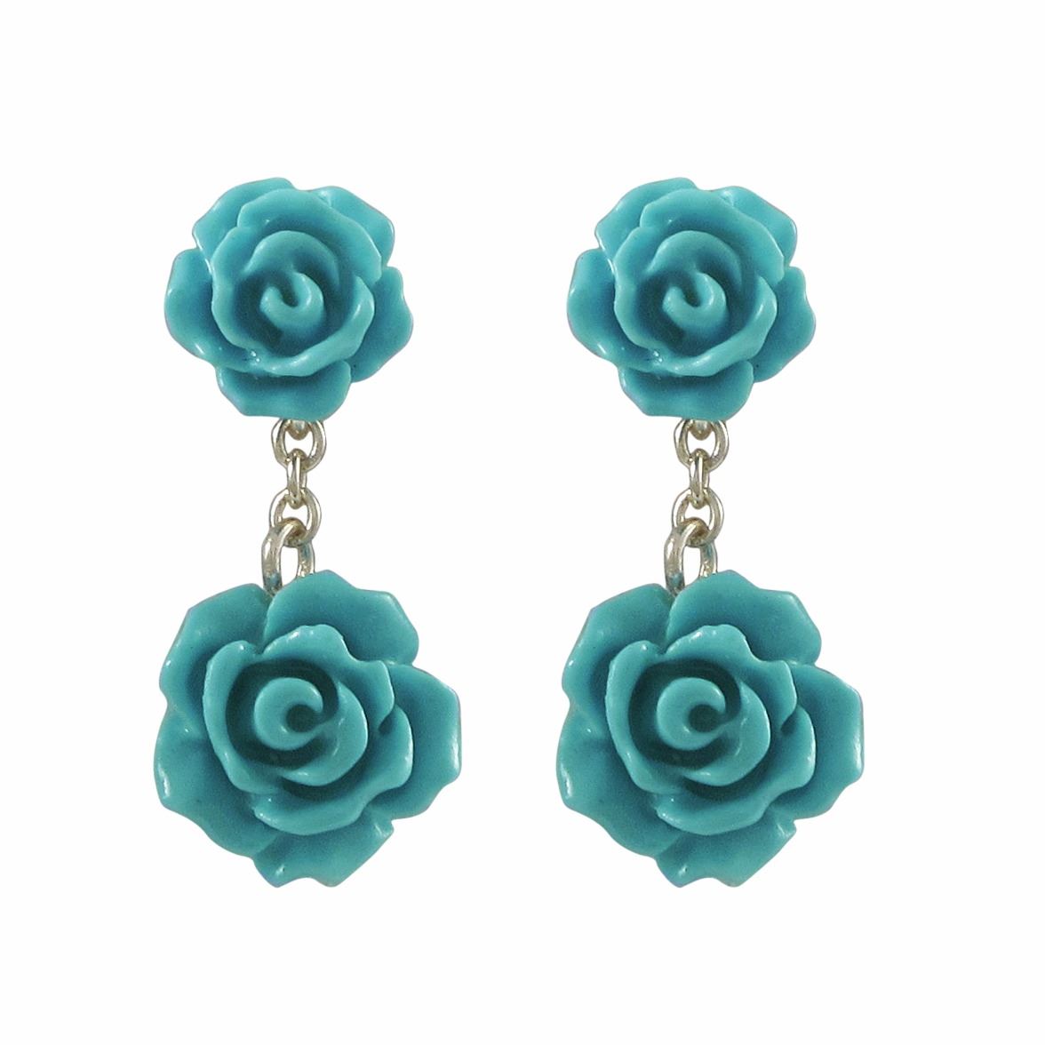 6Mm And 8Mm Turquoise Rose Flower Dangling, Gold Plated Sterling Silver Post Earrings, 0.79