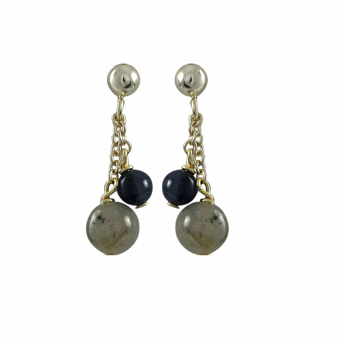 6Mm Labradorite(Grey) And 4Mm Lapis Semi Precious Ball On Gold Tone Sterling Silver Ball Post Earrings -0.75"