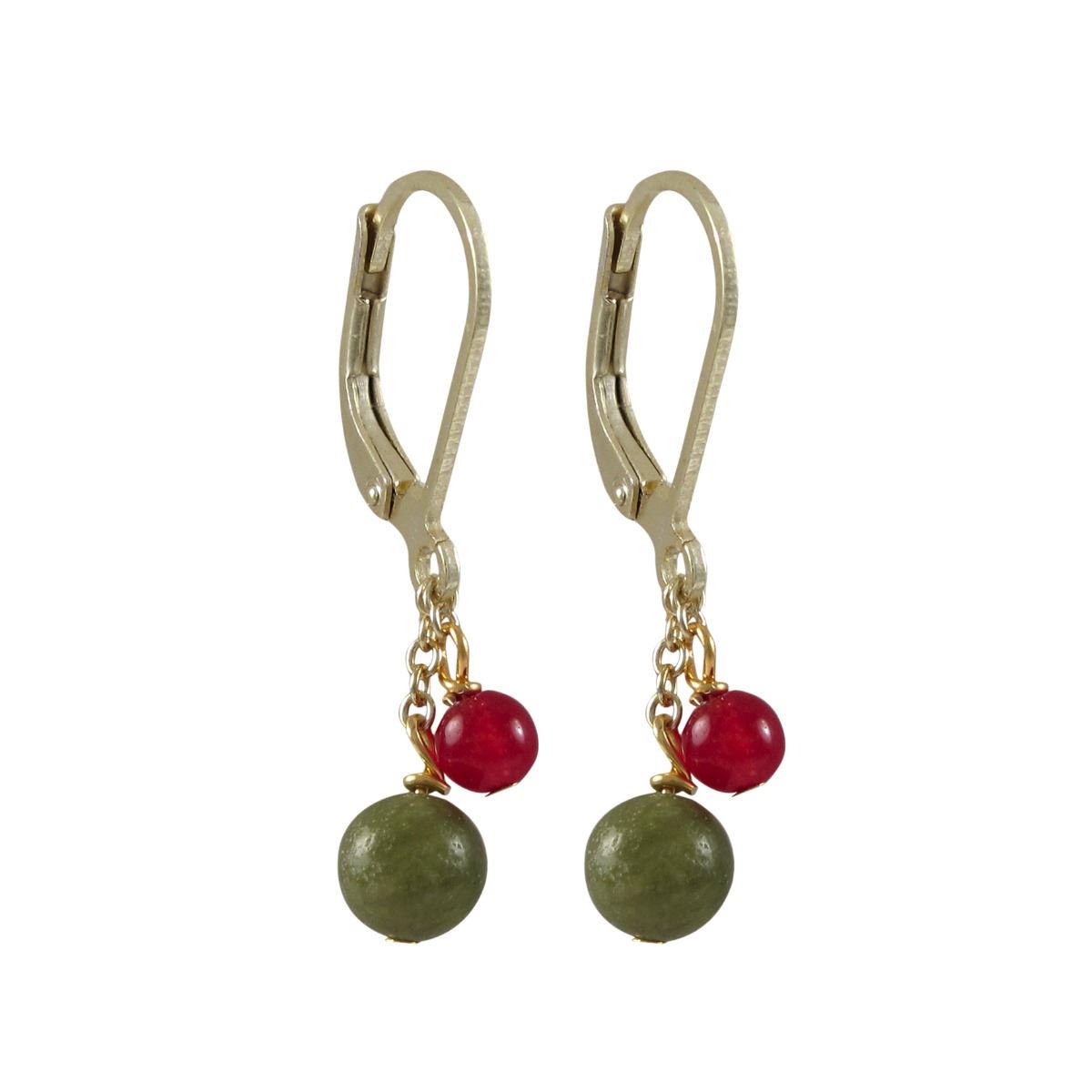 6Mm Olive Jade And 4Mm Red Carnelian Semi Precious Balls On Gold Plated Sterling Silver Lever Back Earrings, 1.18"