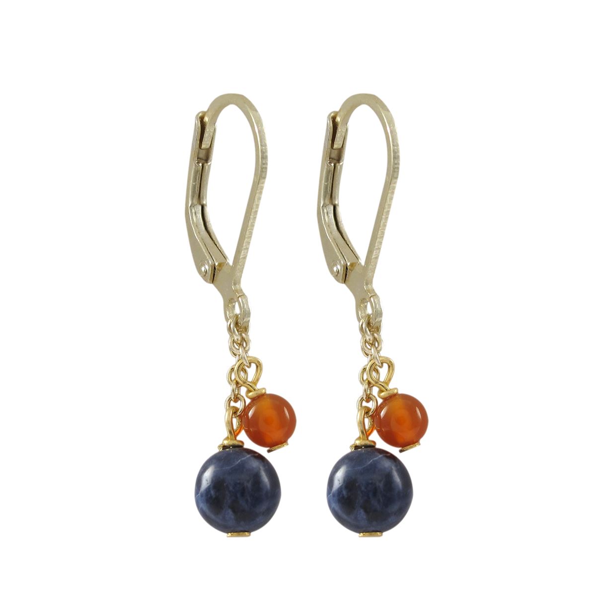 6Mm Sodalite(Blue) And 4Mm Carnelian Semi Precious Balls On Gold Plated Sterling Silver Lever Back Earrings, 1.18"