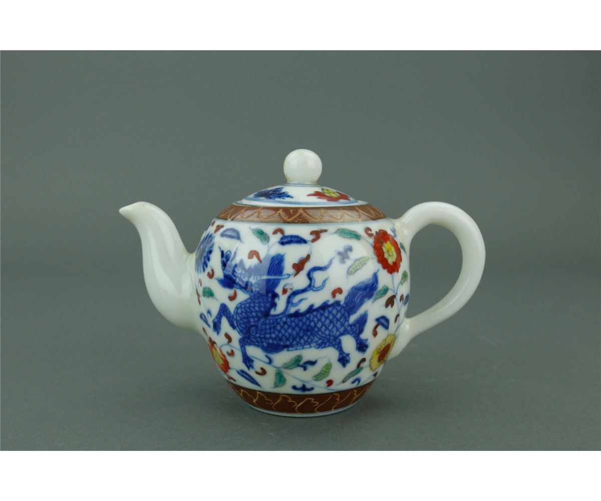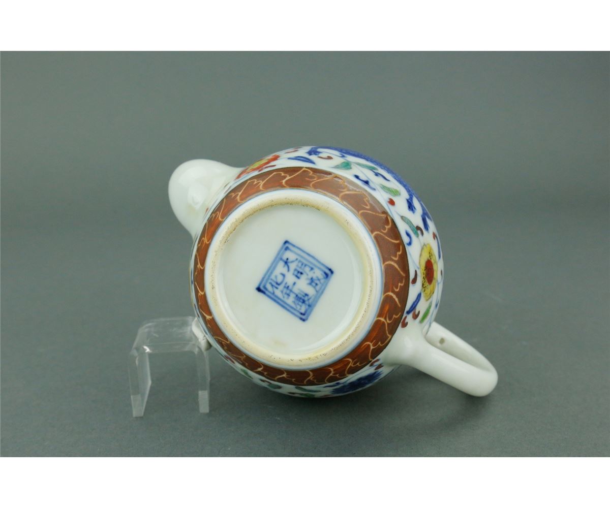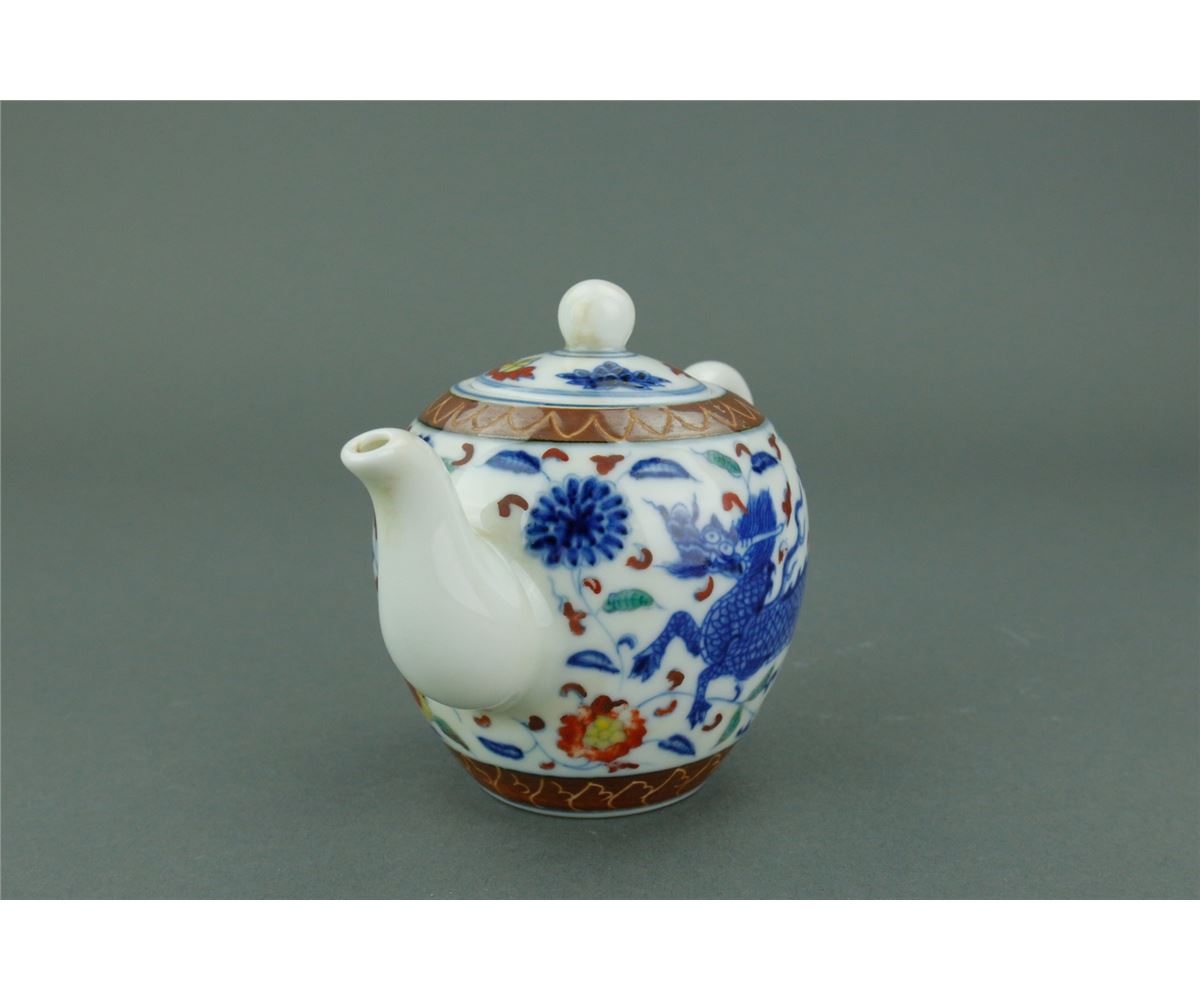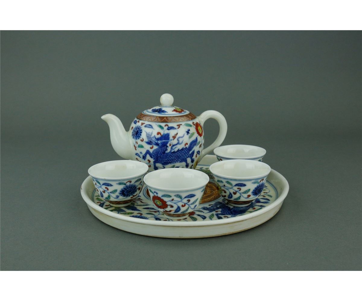 Six pieces of Chinese Famille Rose porcelain tea set; comprised of a globular teapot, four tea cups and one tea tray; featuring Qilin and scrolling flower on body; six-character Ming Chenghua mark on base; D: 24 cm (plate), H: 1.5 cm (plate) 759 grams (total)