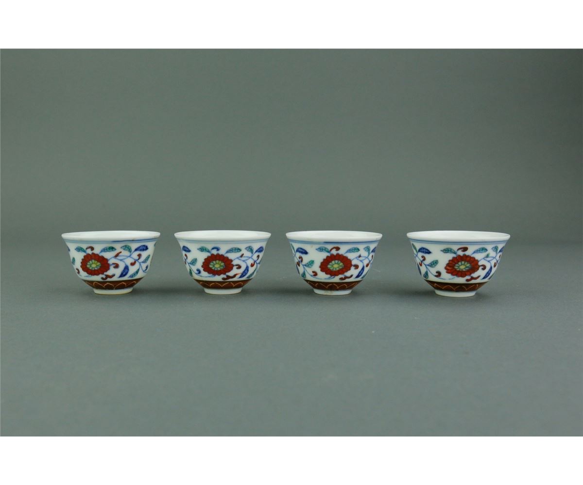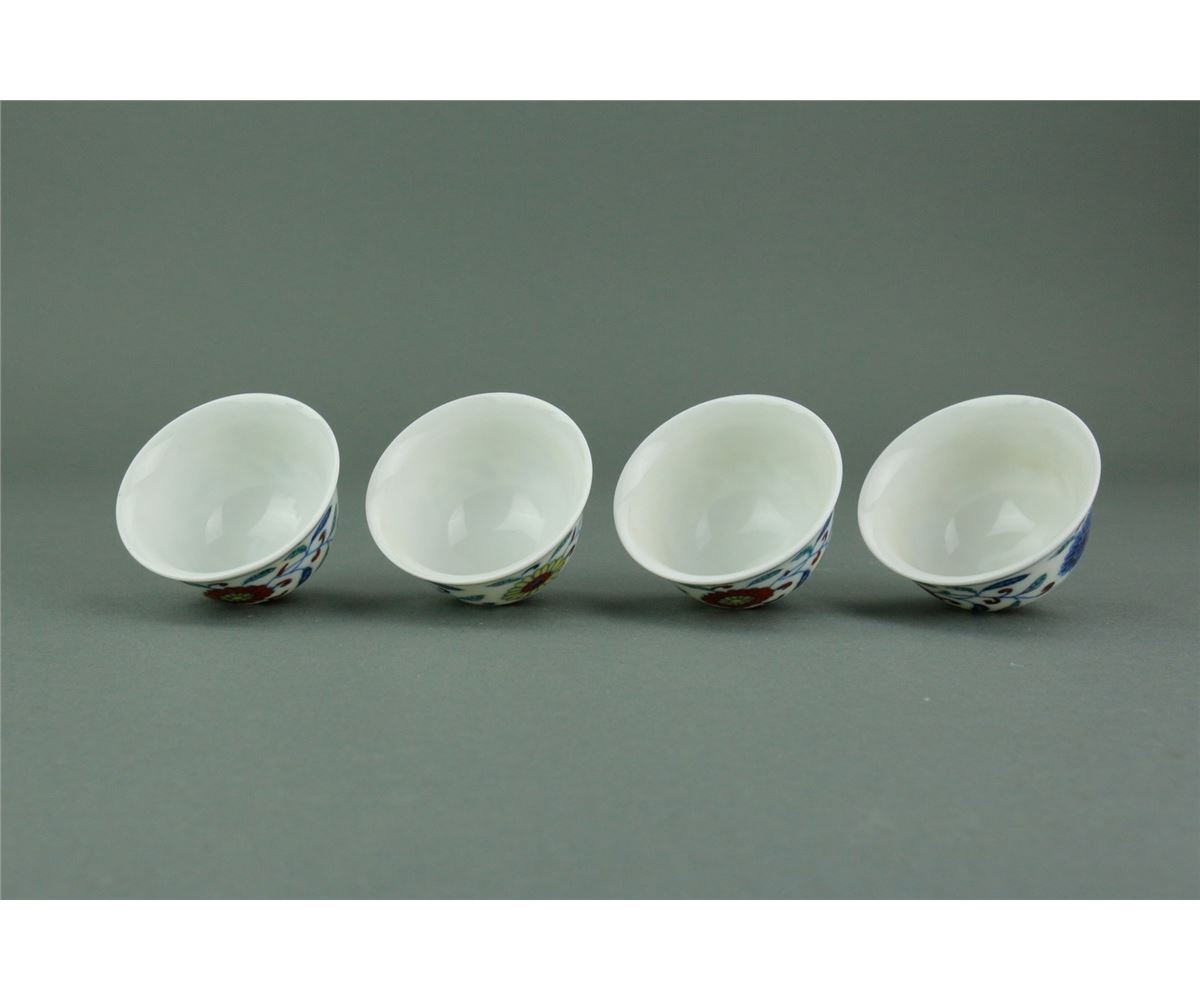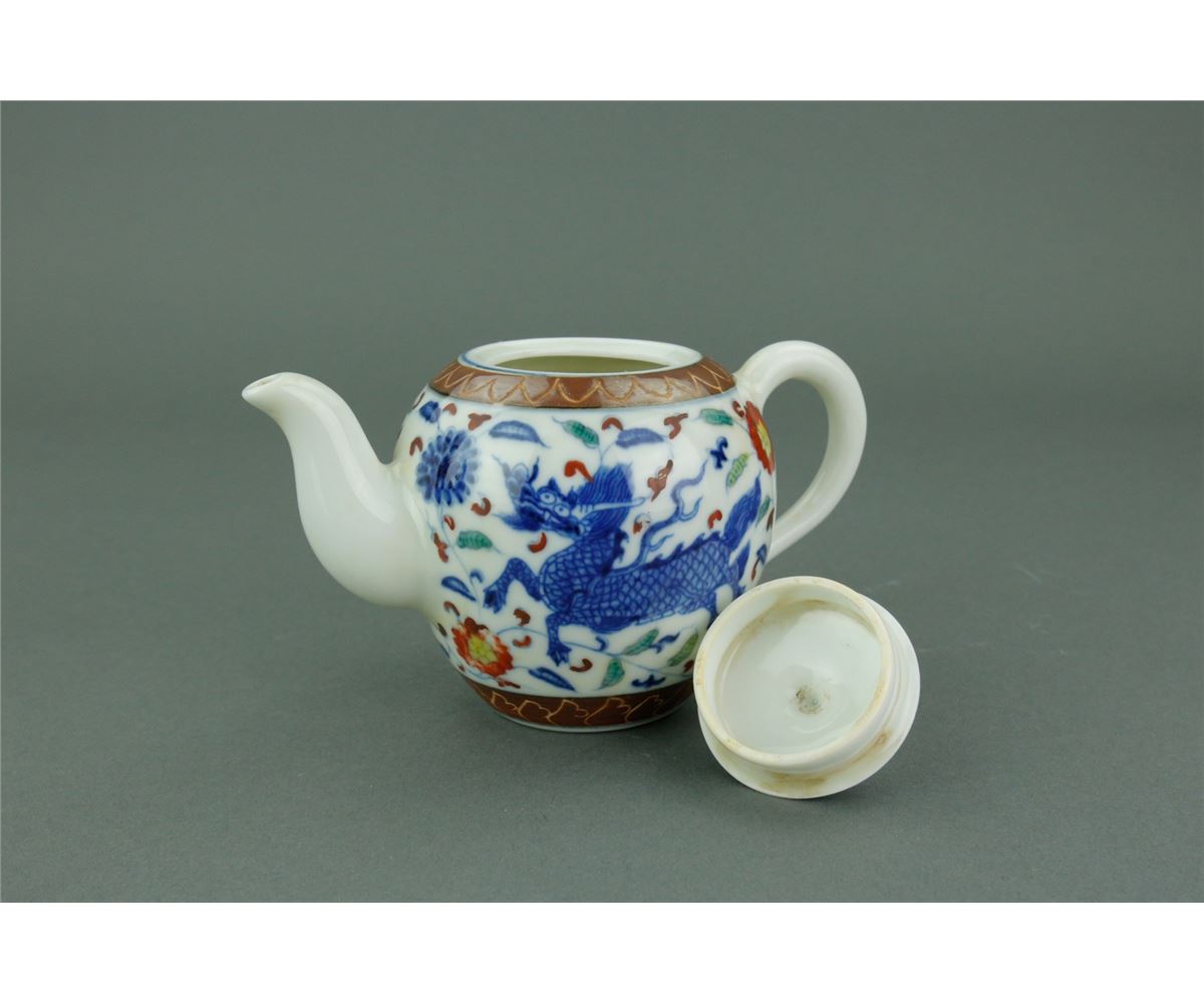 Six pieces of Chinese Famille Rose porcelain tea set; comprised of a globular teapot, four tea cups and one tea tray; featuring Qilin and scrolling flower on body; six-character Ming Chenghua mark on base; D: 24 cm (plate), H: 1.5 cm (plate) 759 grams (total)