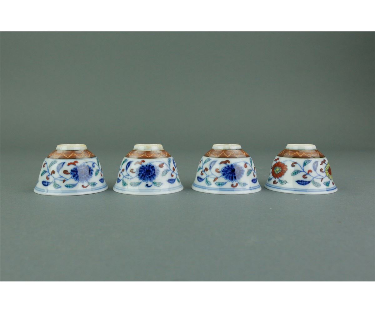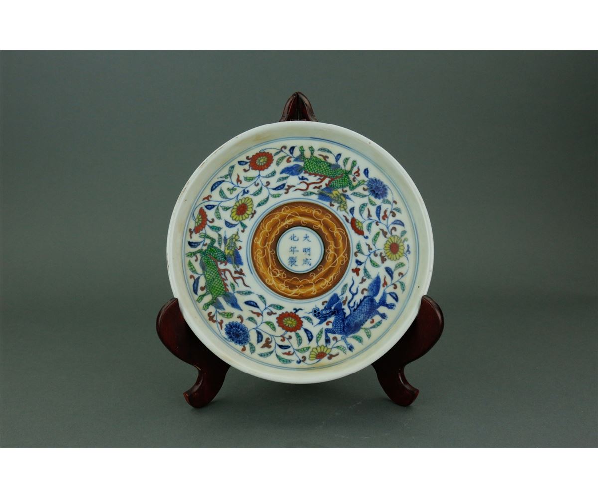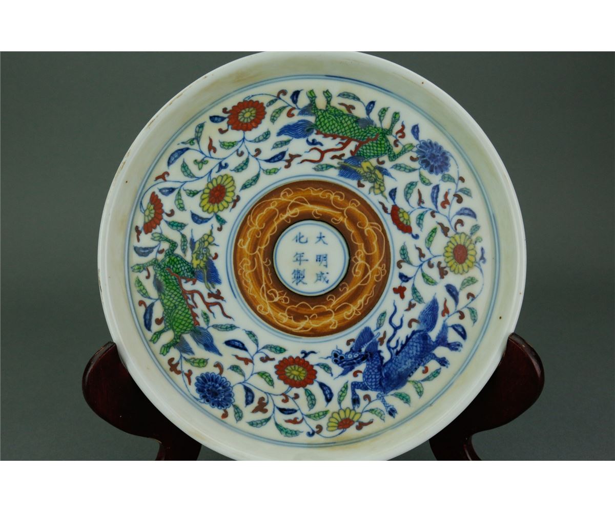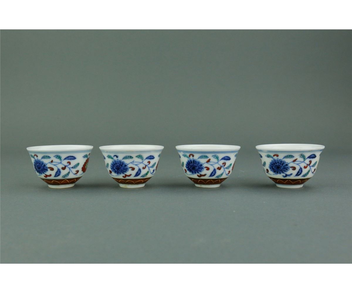 Six pieces of Chinese Famille Rose porcelain tea set; comprised of a globular teapot, four tea cups and one tea tray; featuring Qilin and scrolling flower on body; six-character Ming Chenghua mark on base; D: 24 cm (plate), H: 1.5 cm (plate) 759 grams (total)