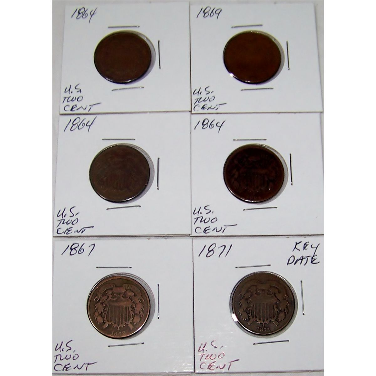 (6X$) RARE U.S TWO CENT PIECES (3) 1864,1869,1867, KEY DATE 1871