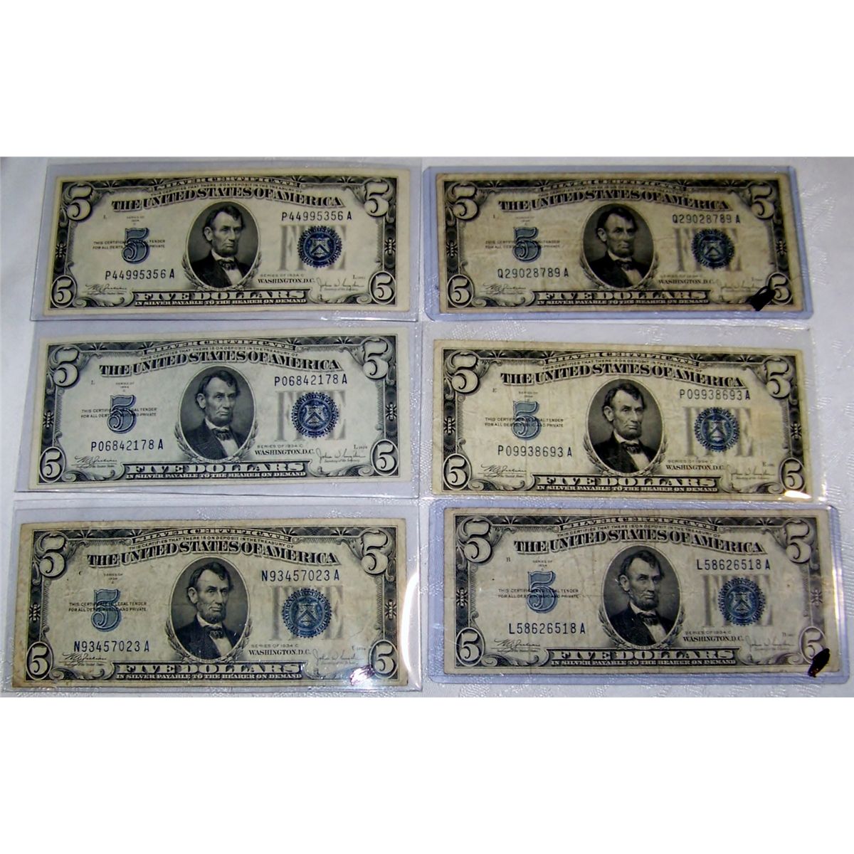 (6X The Bid) 1934-C $5 SIlver Certificates, Mixed Grades.