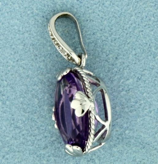 In 14k white gold. Contains a 10x14mm natural high quality amethyst gemstone with a bright purple color and excellent clarity. Also contains a .005ct high quality diamond on bale. 1" long with bale. 3.0g.