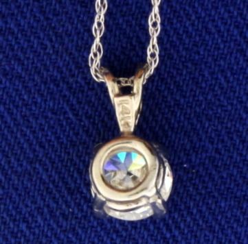 In 14k white gold. Contains a high quality .6ct diamond with excellent clarity and lots of sparkle, VS clarity/G color. In a 4 prong basket setting. 18" long chain and 7/8" pendant. .7g.