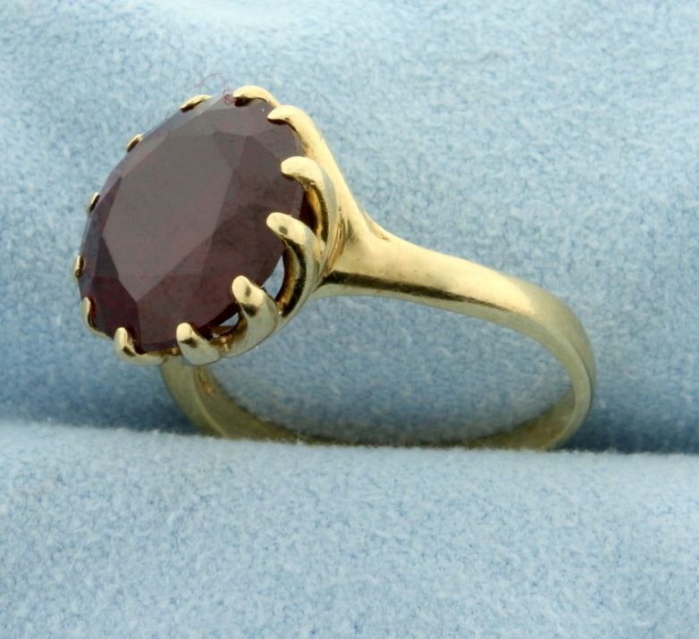 In 10k yellow gold. Contains a lab ruby with excellent deep red color and clarity. Size 6 3/4. 4.7g.