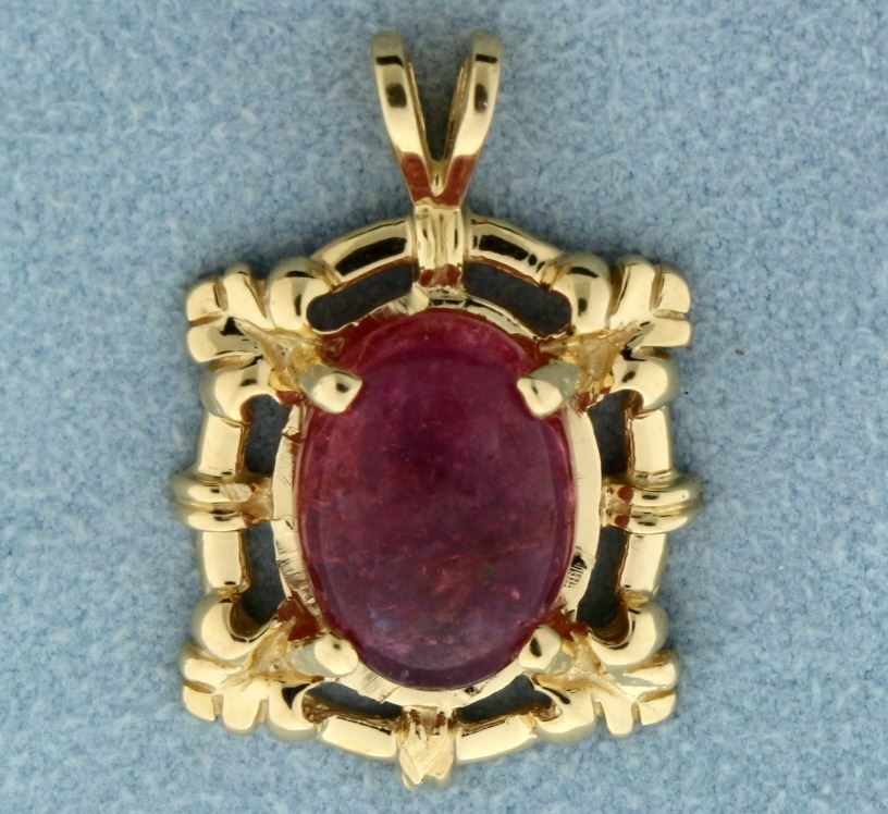 In 14k yellow gold. Contains a 14mm oval cabochon cut Pink Rubellite Pendant with bright pink color. Pendant is 1 inch long. 4.6g.