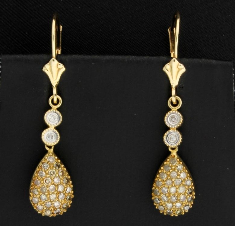 In 14K yellow gold, the earrings are 1 1/4 inches long and contain .6ct total weight of diamonds-.01ct to .02ct each. 2.7g