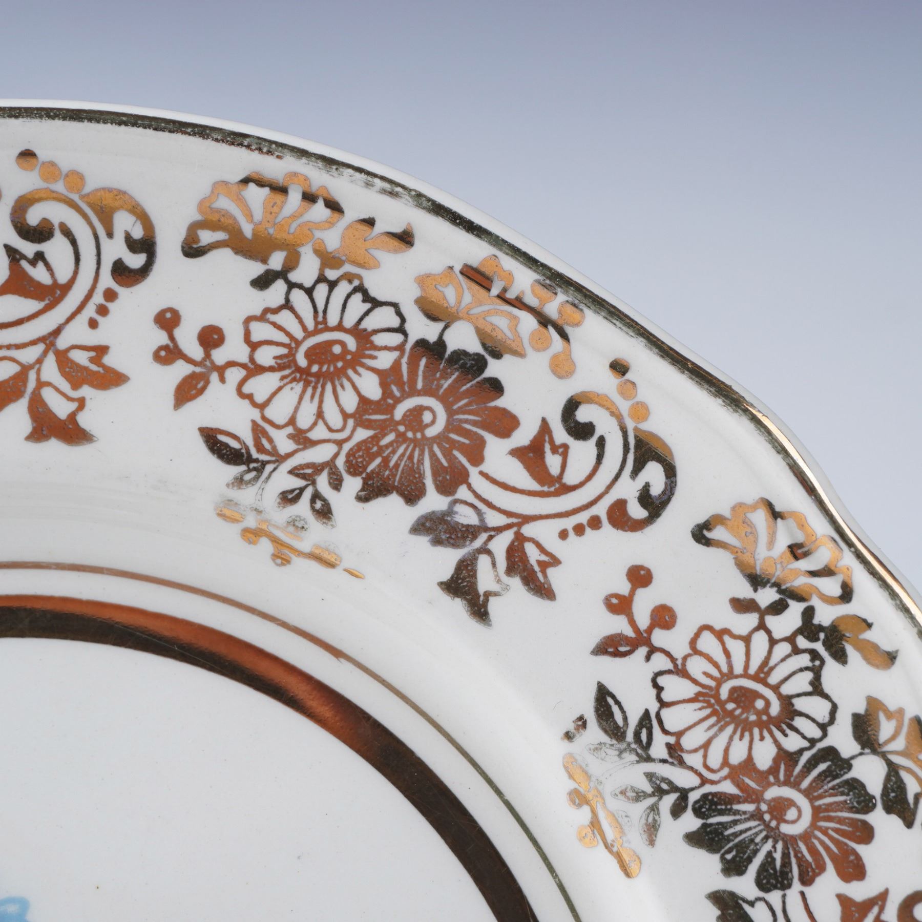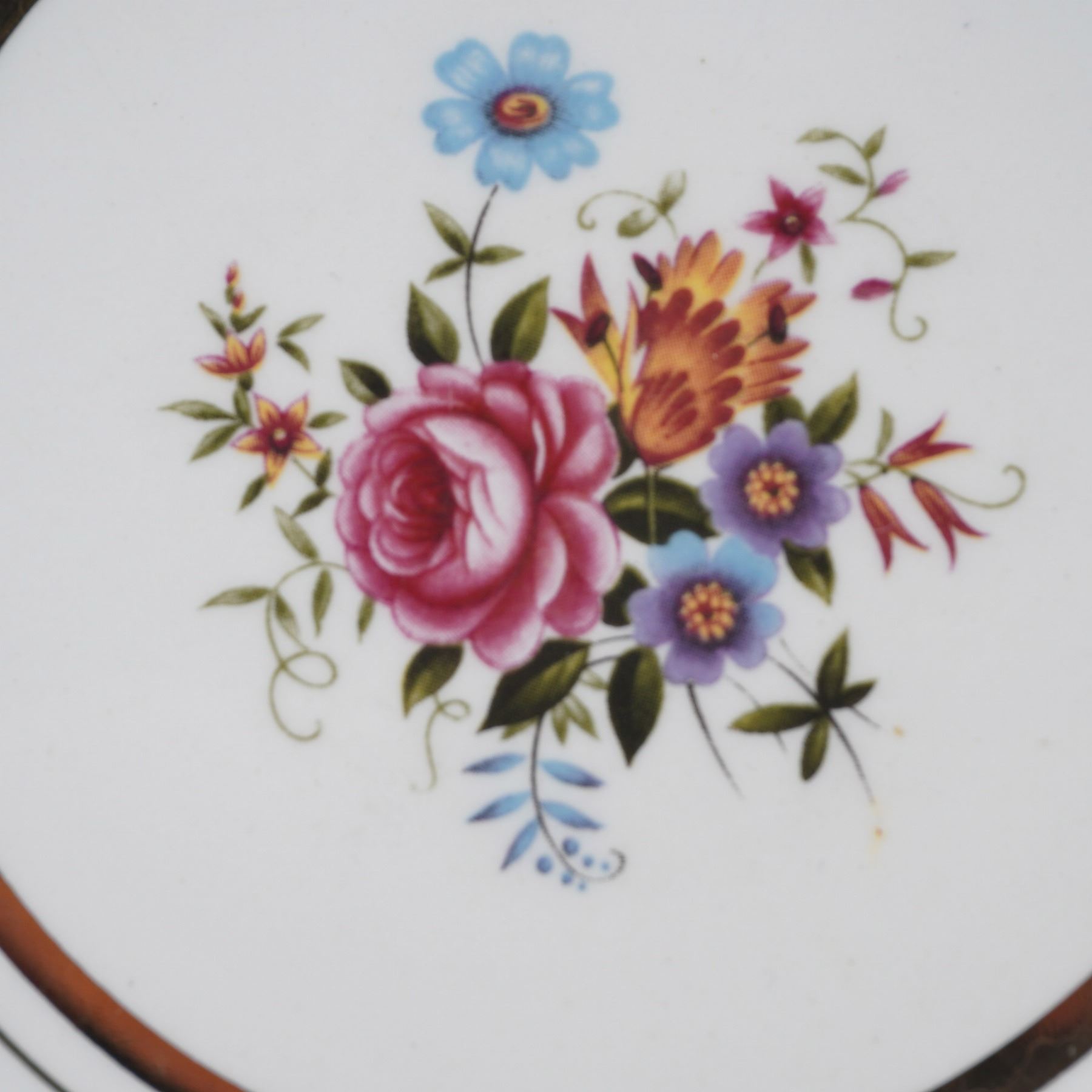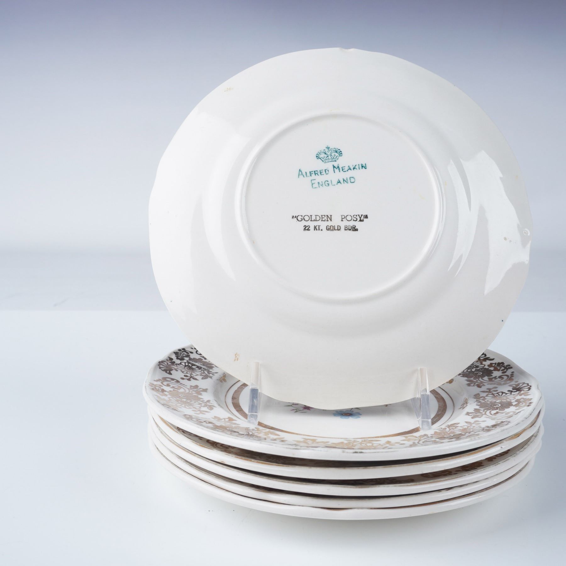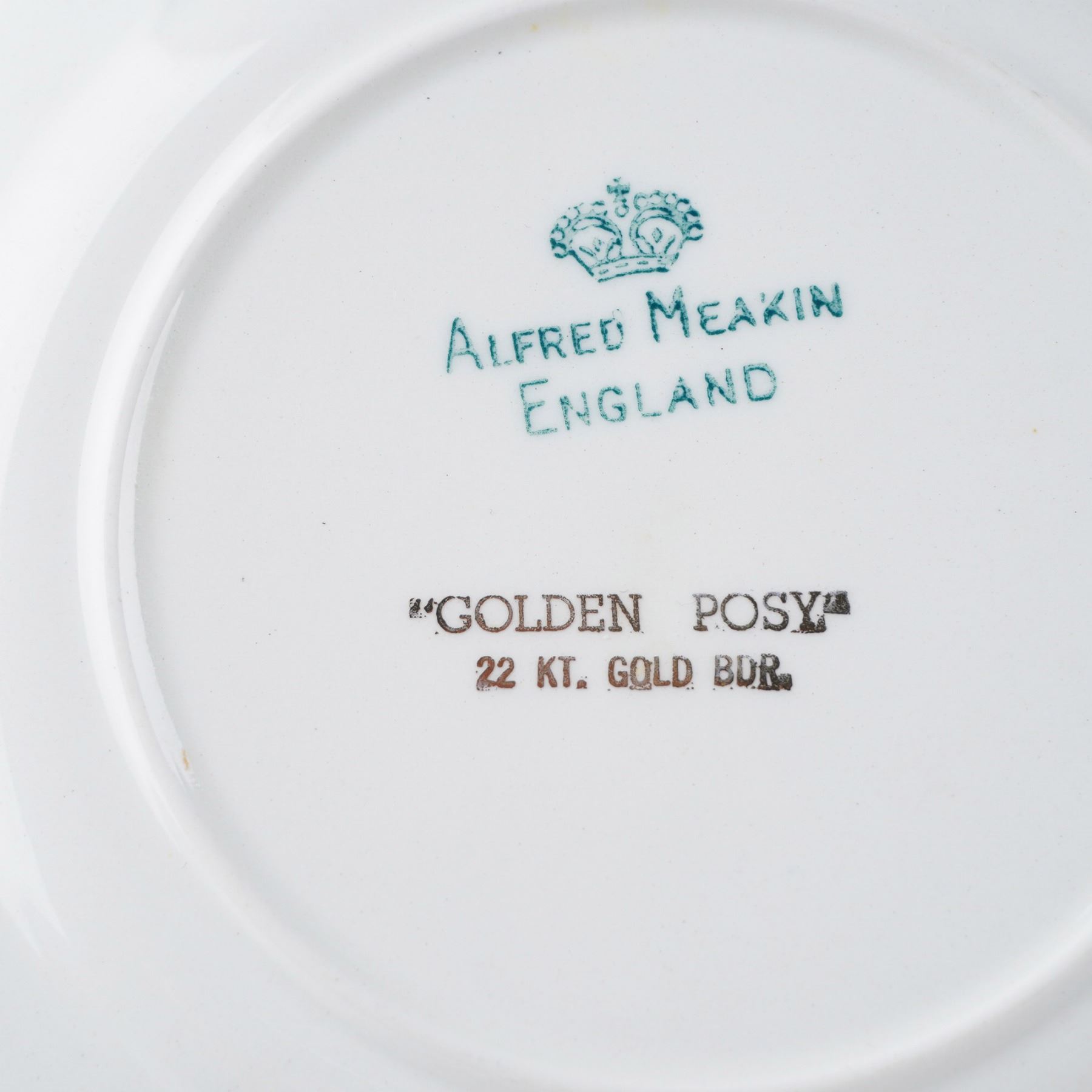 A set of six vintage Alfred Meakin England bread plates in the Golden Posy pattern. Each plate measures 6.5"Dia and features a central floral motif with pink and blue flowers, surrounded by an ornate gold filigree border accented with 22kt gold. The backstamp confirms the Alfred Meakin brand and Golden Posy designation. These elegant plates are perfect for collectors or those looking to add a touch of classic English charm to their table setting.