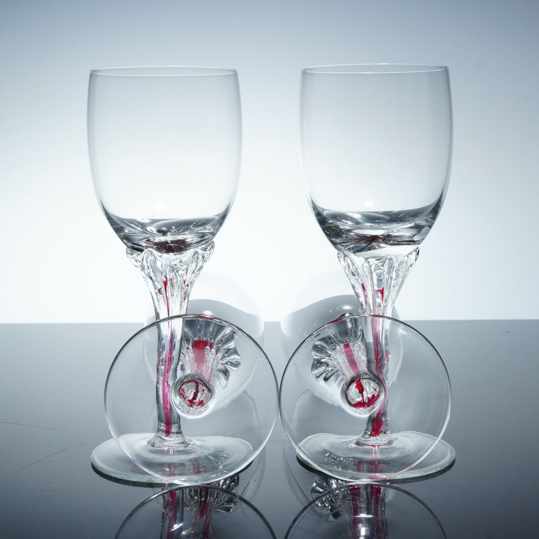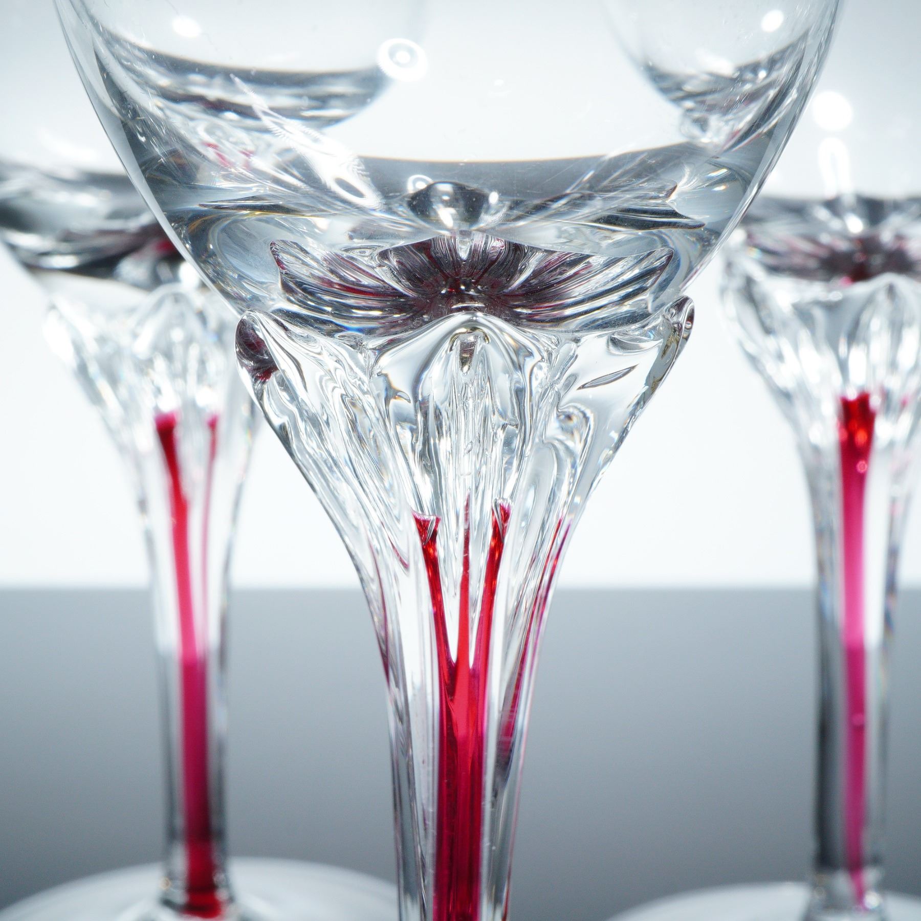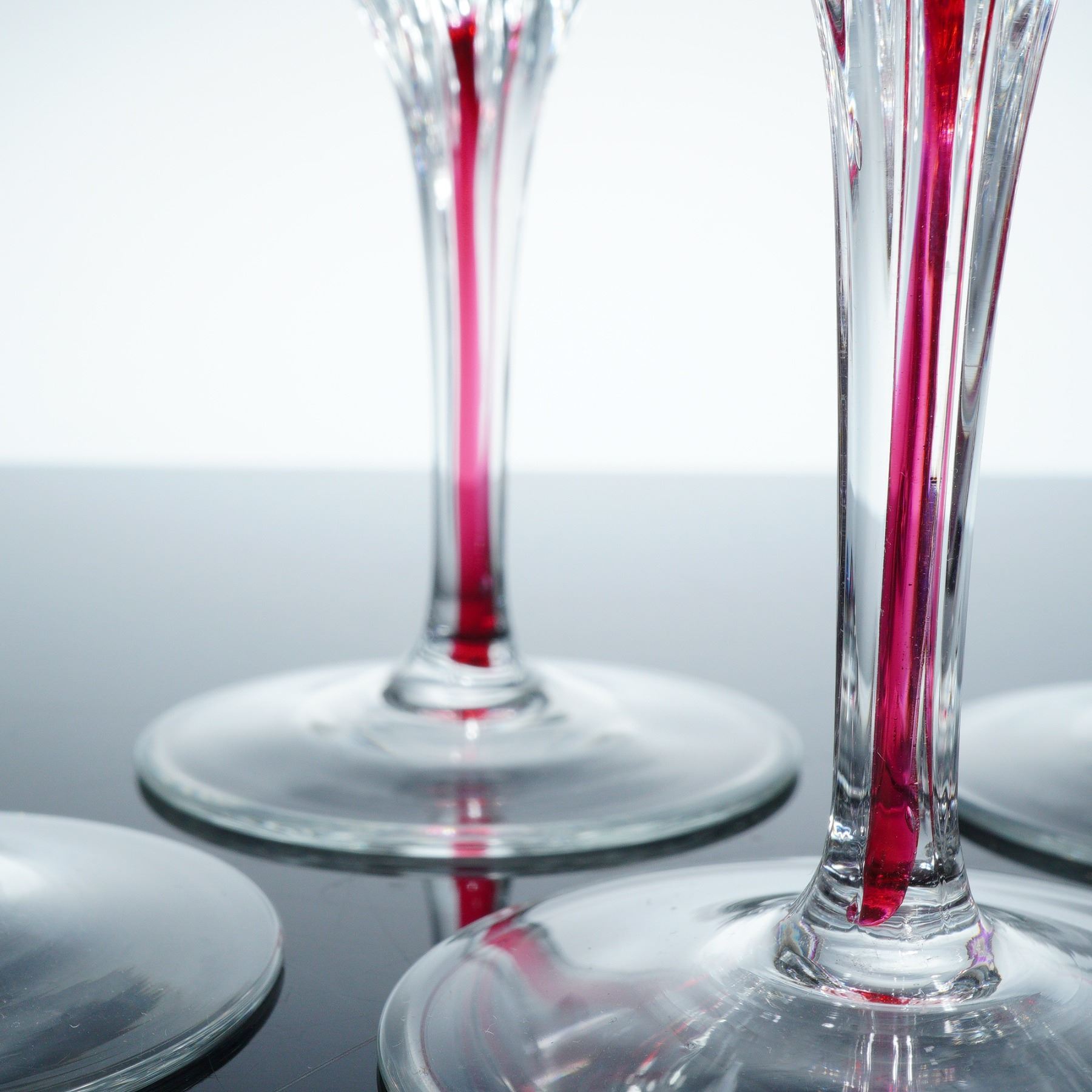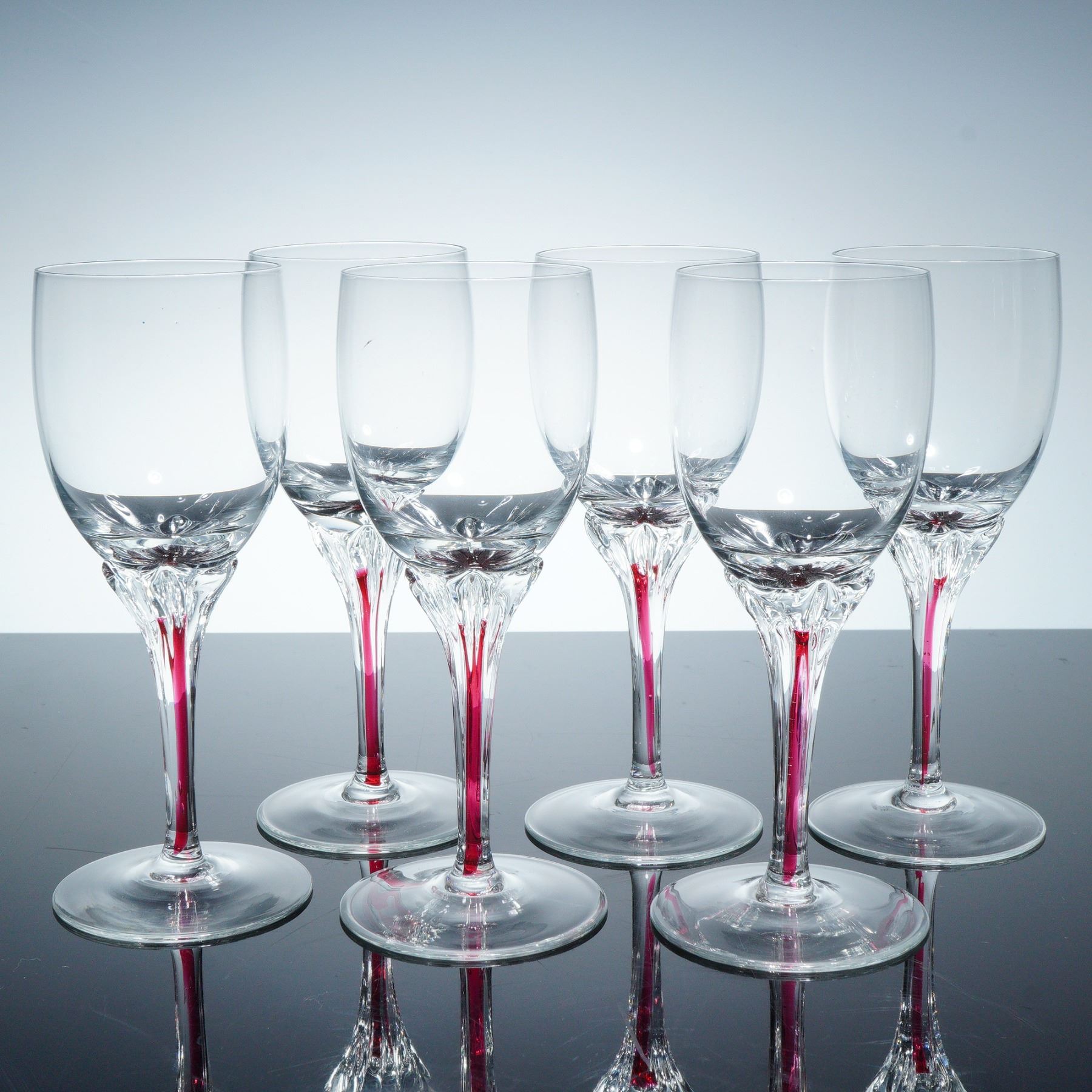 Six cordial glasses characterized by gracefully contoured stems accented with vivid red stripes. Each glass showcases a smoothly rounded bowl and a finely faceted juncture between the bowl and stem.