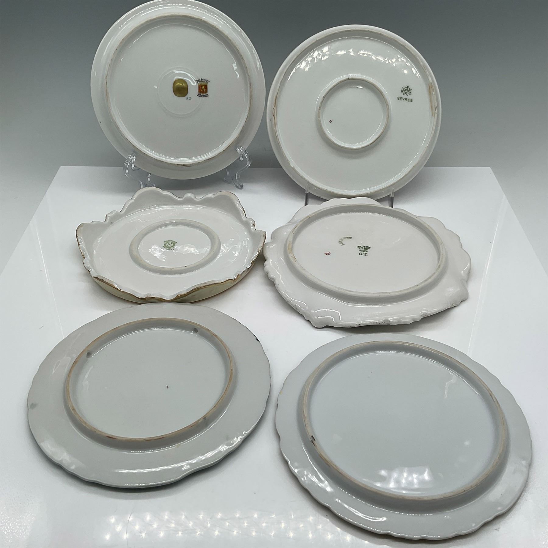 A collection of six antique and vintage porcelain trivet plates ranging from 5" - 7.5" dia., featuring a variety of intricate hand-painted and transfer designs. Each plate is uniquely decorated, including floral patterns, scenic landscapes, classical portraiture, and European-style motifs. The set includes pieces with scalloped and embossed edges, adding to their decorative appeal. Some plates bear identifiable maker's marks, including Royal Bavarian, Sevres, CT Porcelain and Noritake backstamps, indicating their European and Asian origin.