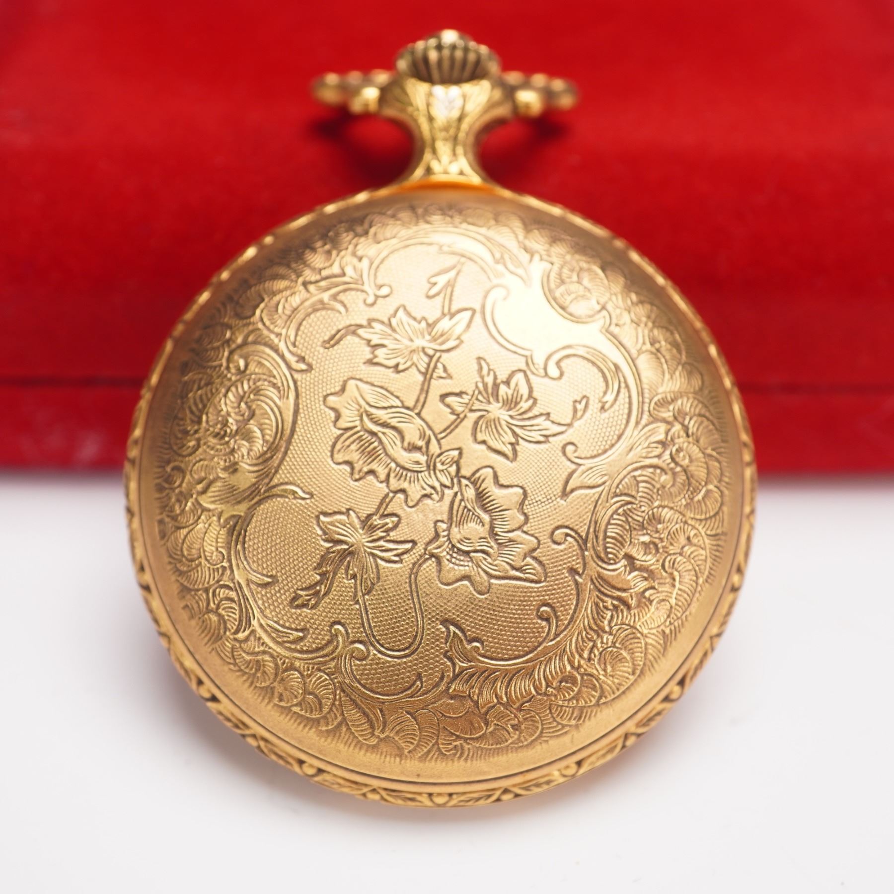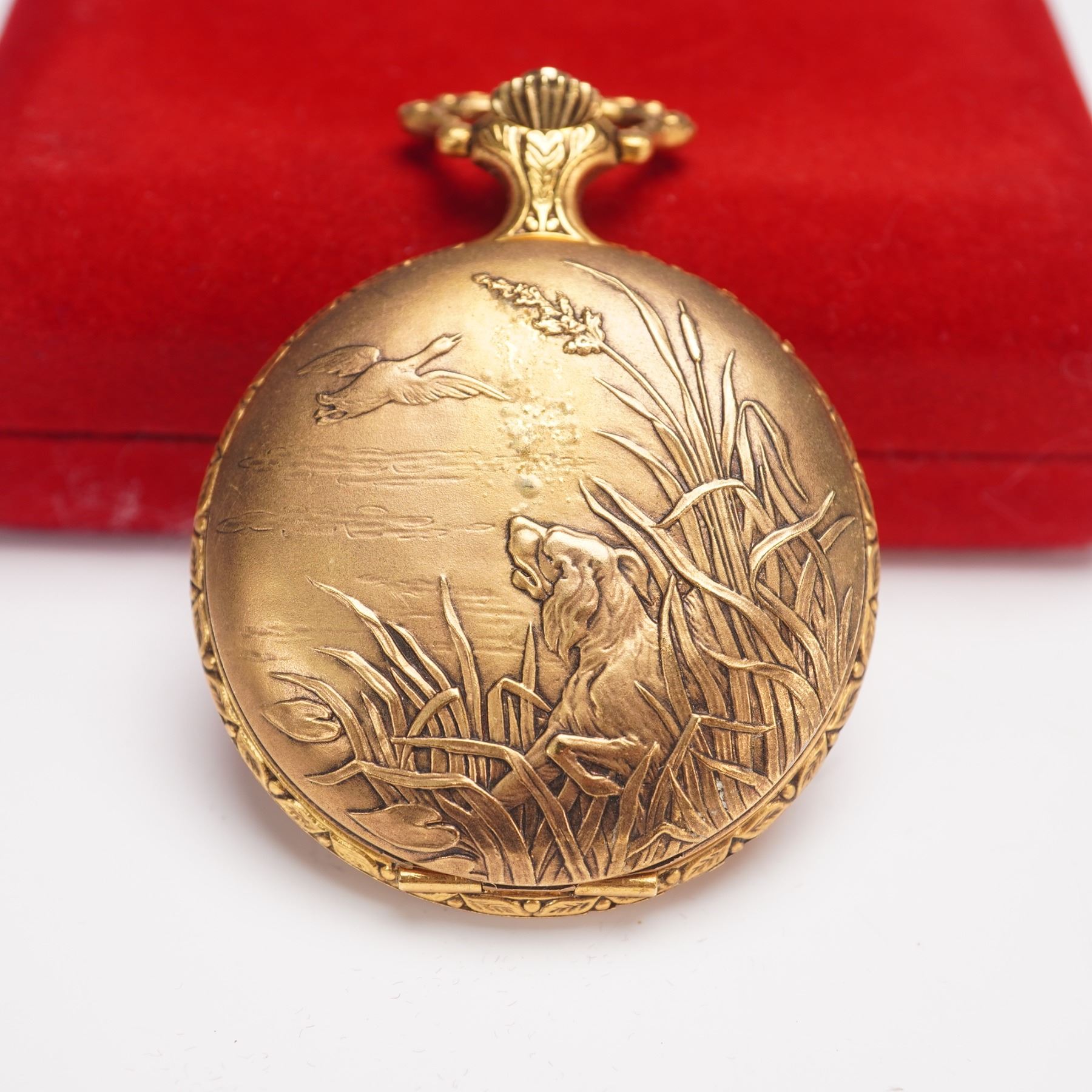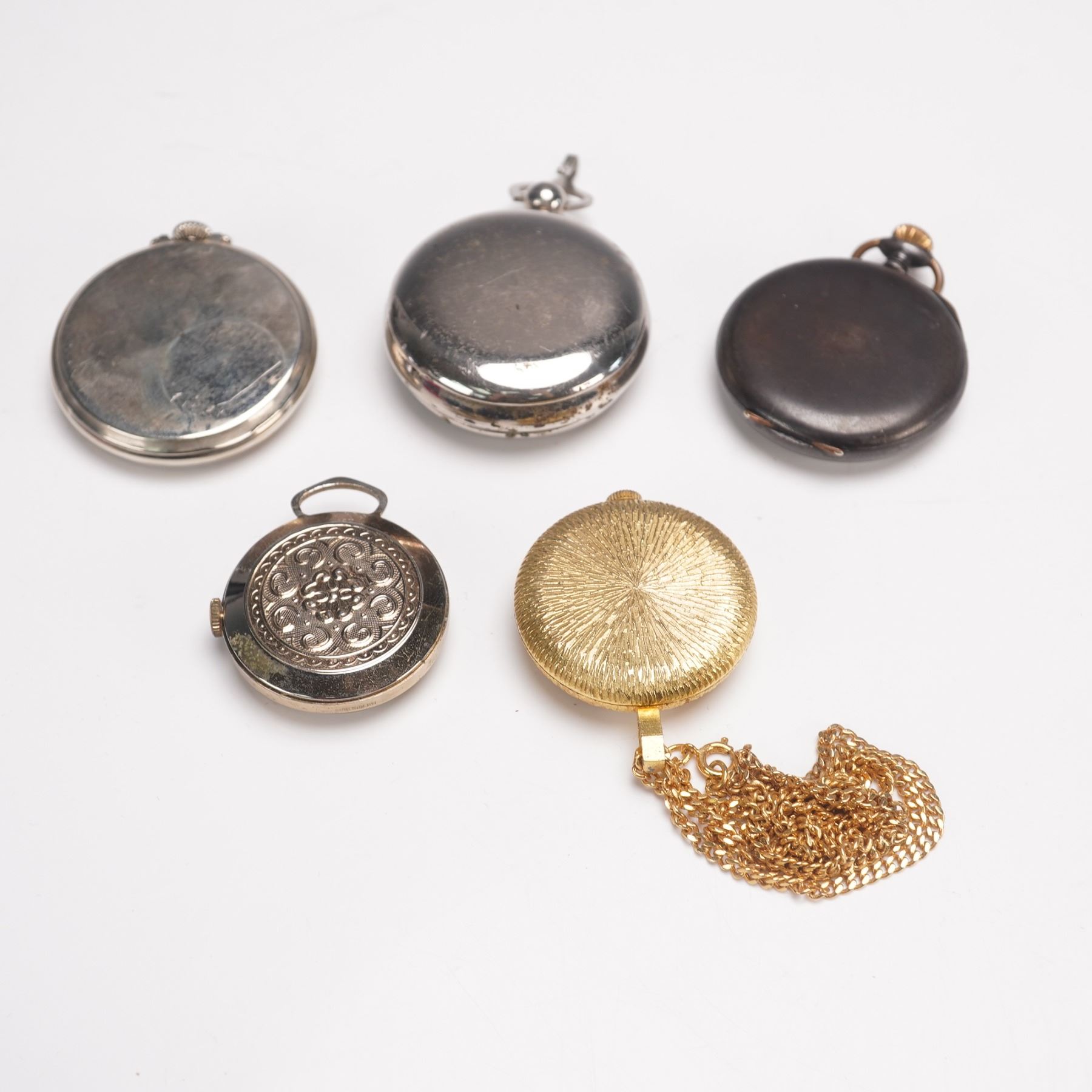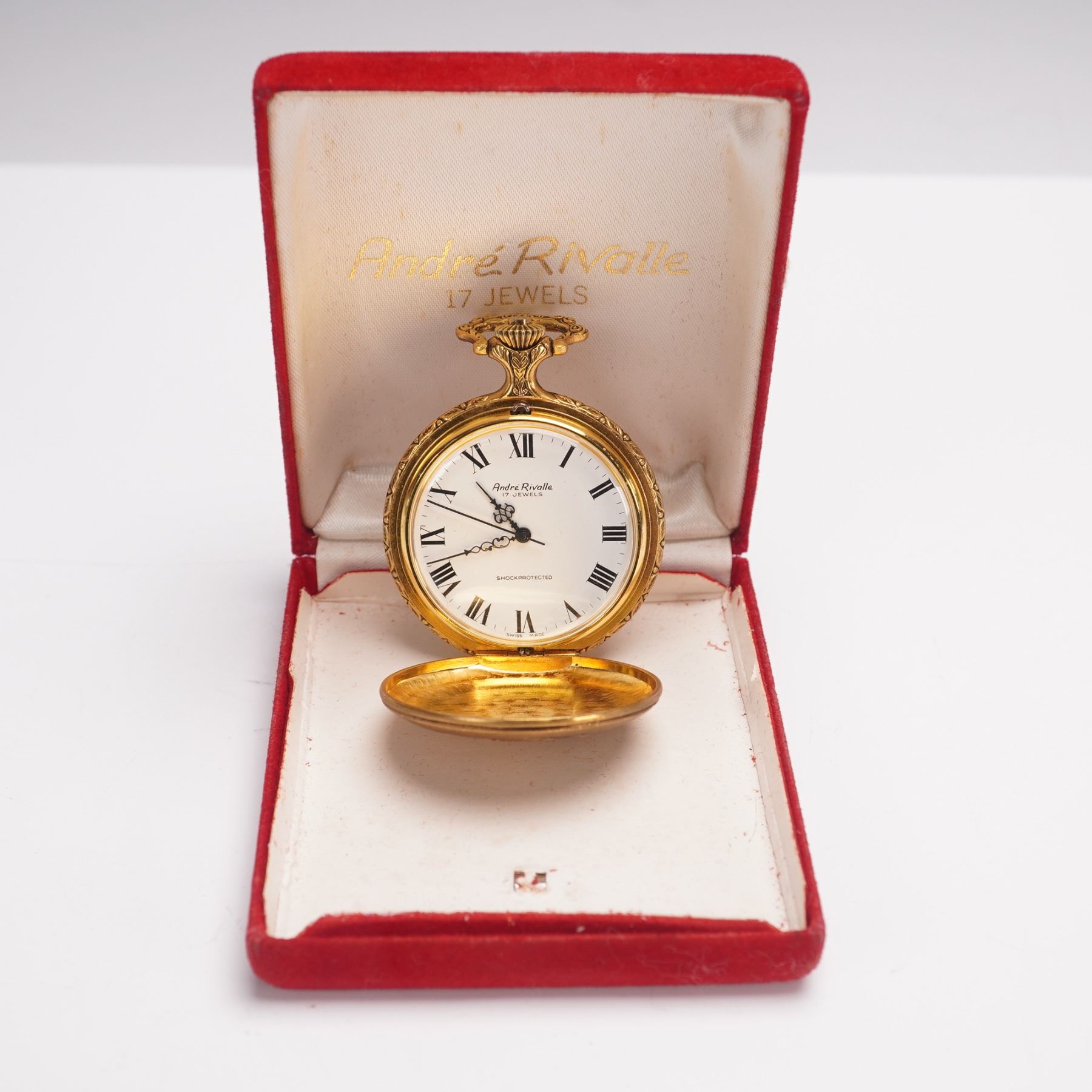 A group of six assorted vintage pocket watches including an Andre Rivale 17 jewels gold-tone hunter case watch with ornate floral and hunting scene designs, presented in its original red velvet box. The lot also features two Lucerne pieces, one with a textured gold-tone case and chain and another with a smaller decorative case and Roman numeral dial. A Dr. Scholls Walk Meter silver-tone pocket watch with Arabic numerals and subsidiary seconds is included, along with a Gruen silver-tone pocket watch displaying stylized numerals and subsidiary seconds dial. Completing the group is an additional pocket watch of unknown make, housed in a dark case with a classic white dial and Arabic numerals.