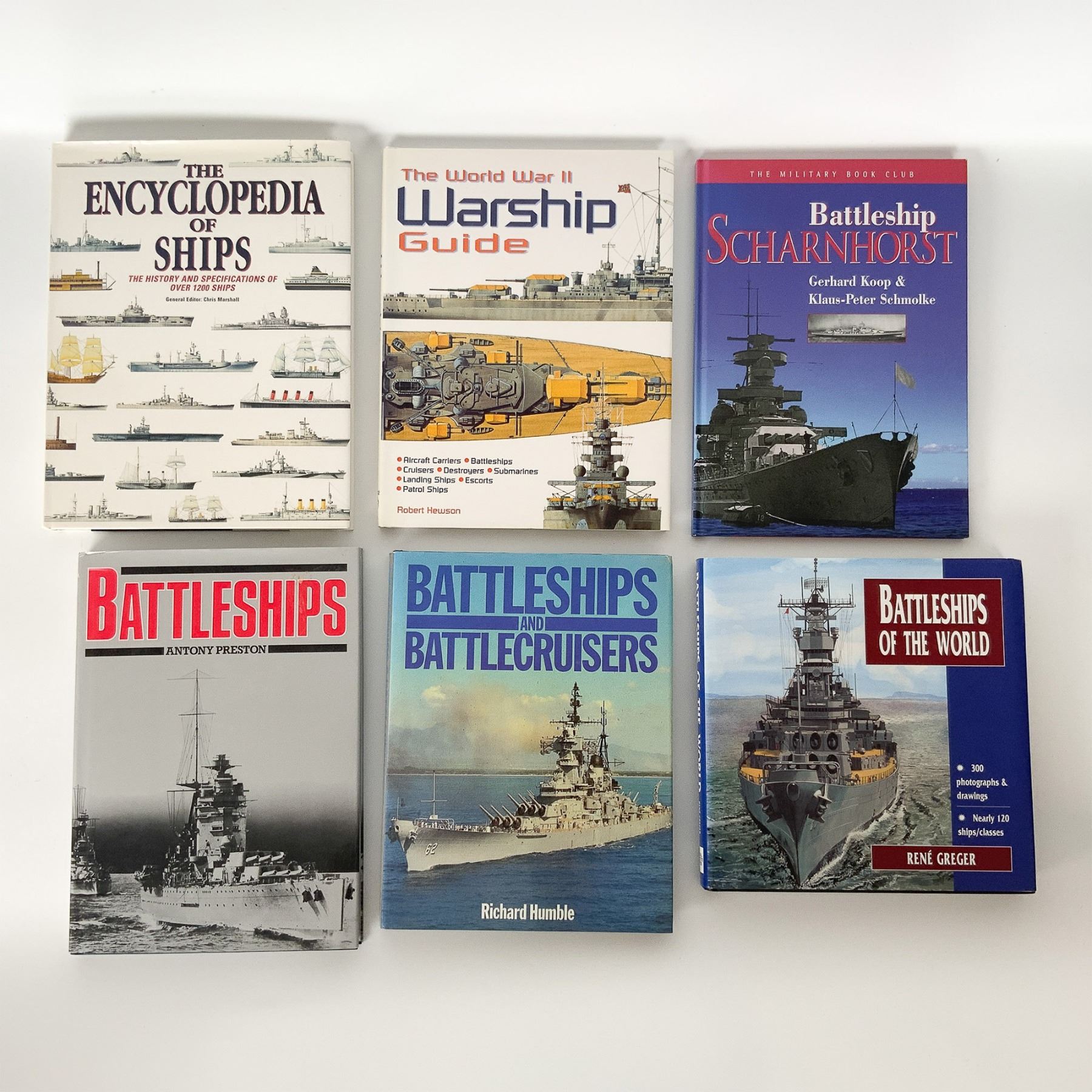 This collection includes six authoritative books covering battleships, warships, and naval history. Titles include Battleships of the World by Rene Greger, The Encyclopedia of Ships edited by Chris Marshall, The World War Two Warship Guide by Robert Hewson, Battleship Scharnhorst by Gerhard Koop and Klaus Peter Schmolke, Battleships by Antony Preston, and Battleships and Battlecruisers by Richard Humble. These books feature detailed illustrations, photographs, and historical accounts of famous naval vessels, ship classes, and their roles in maritime warfare. They provide a wealth of information for naval enthusiasts, historians, and collectors seeking insights into the evolution of battleship design, strategies, and engineering. Largest item measures: 9.25"L x 1"W x 12.25"H.