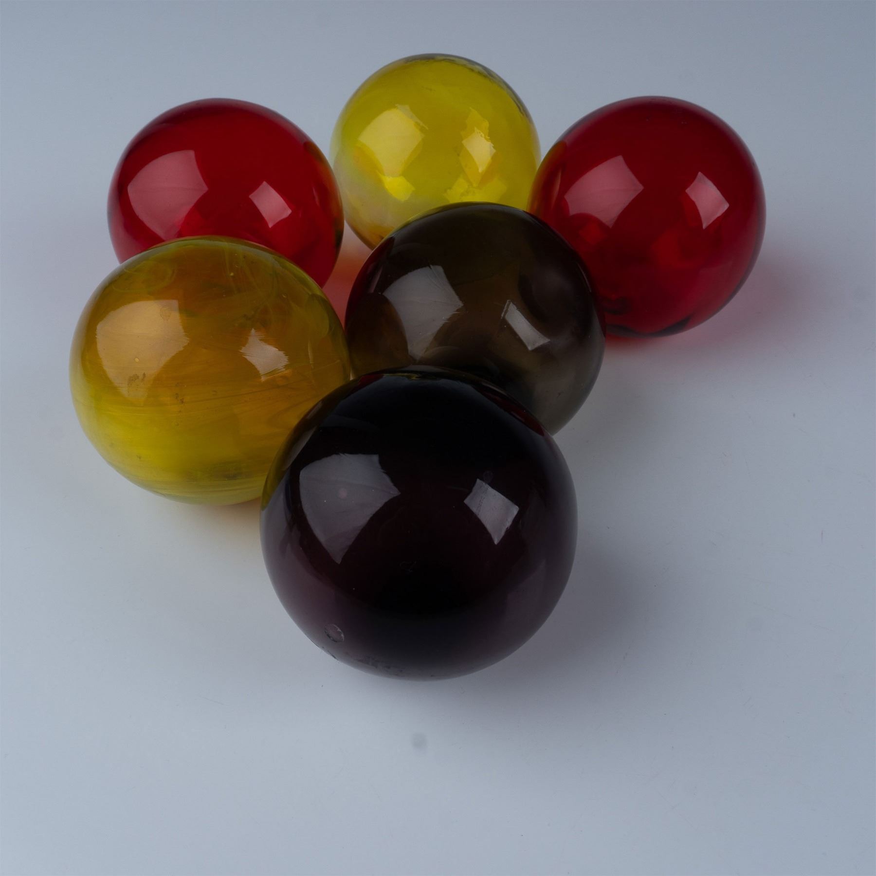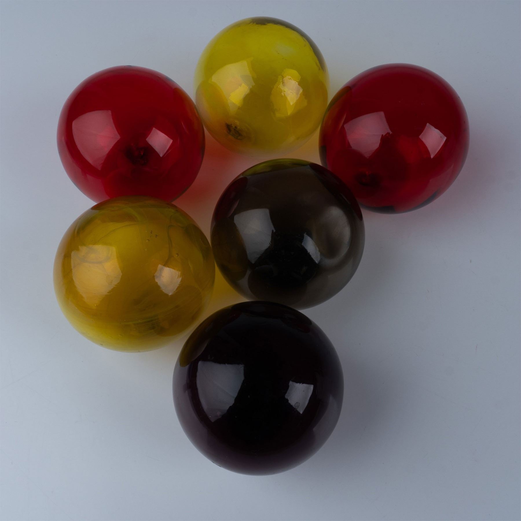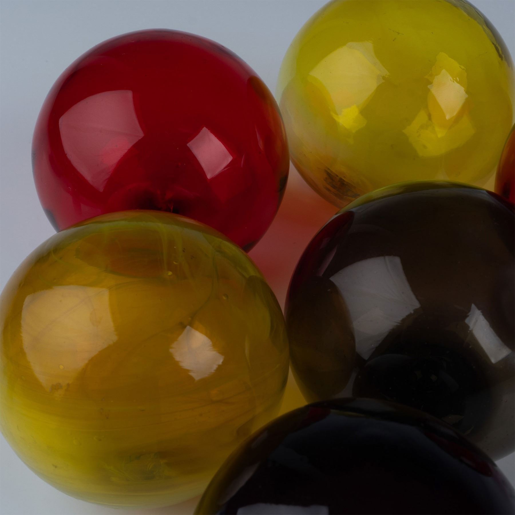 This set features six beautifully crafted blown glass spheres, each with a rich, translucent color, including red, yellow, and green. The spheres exhibit smooth, glossy finishes and a vibrant play of light, showcasing the craftsmanship of handblown glass. These unique decorative pieces are ideal for collectors or as eye-catching accents in various decorative displays. Each sphere measures approximately 3 inches in diameter.