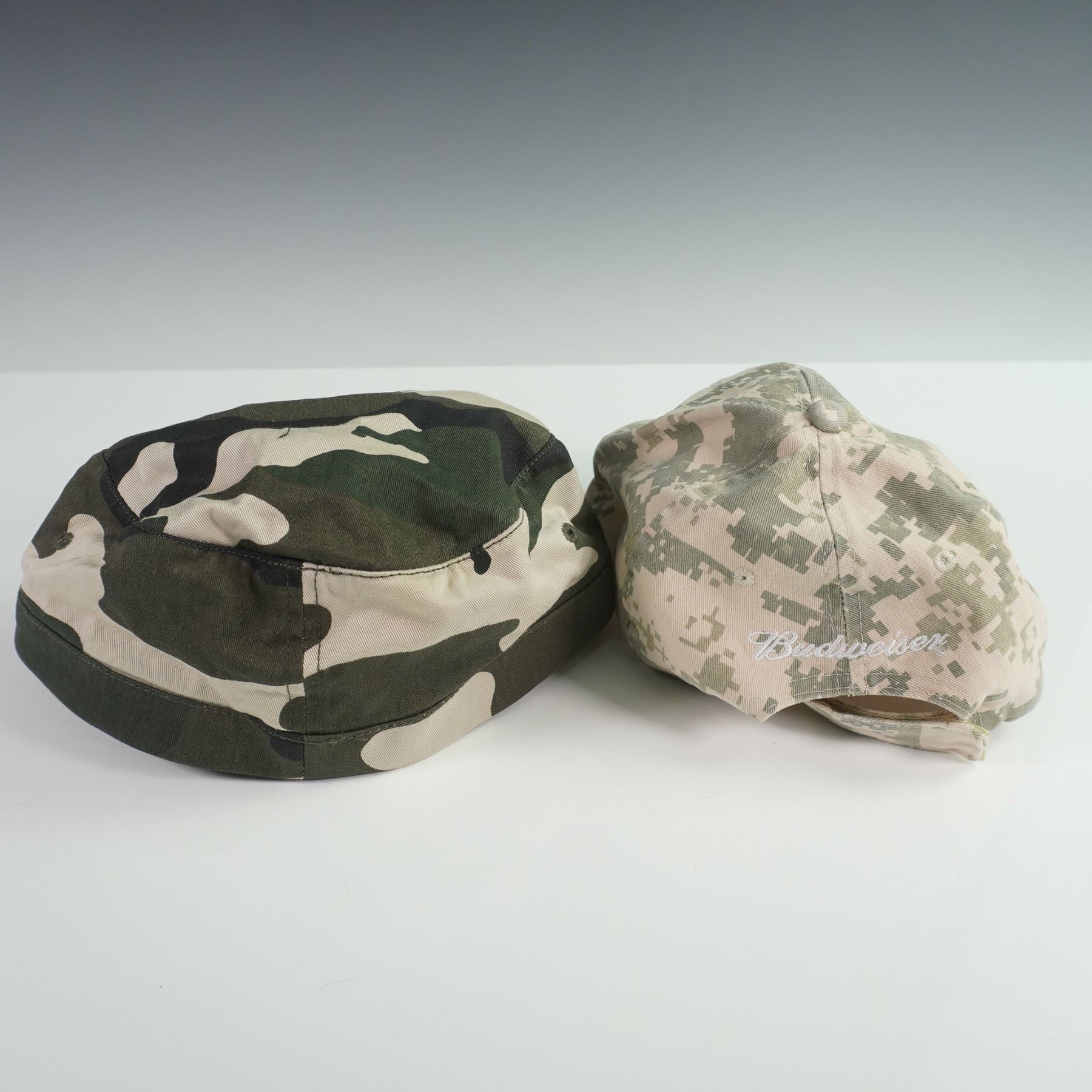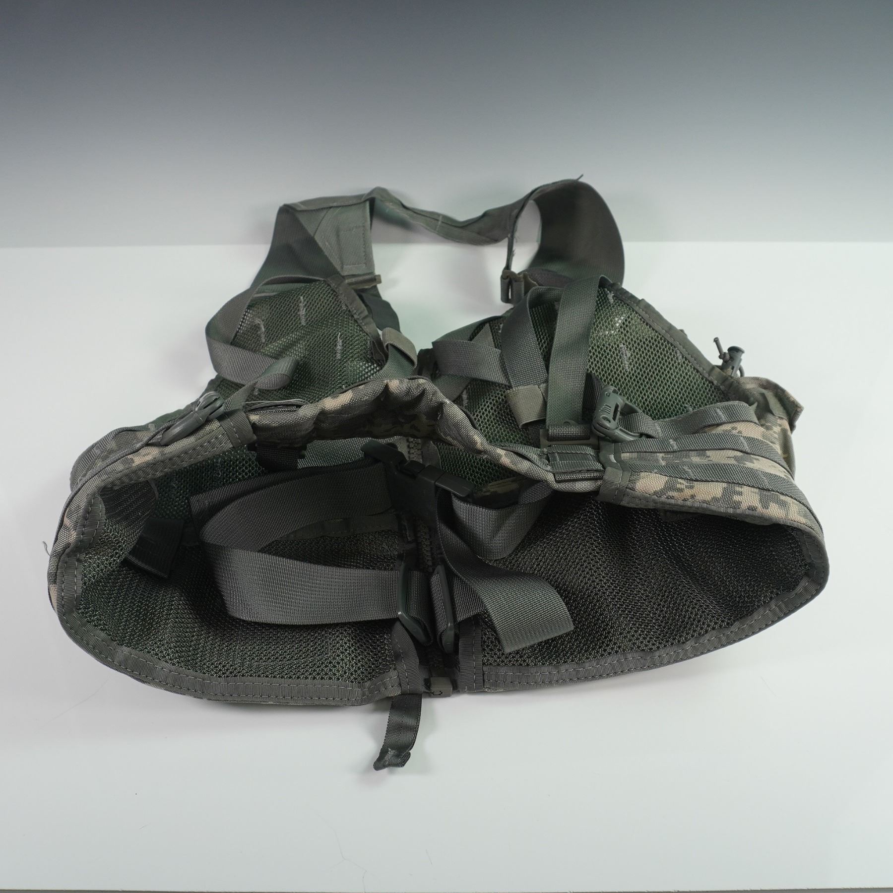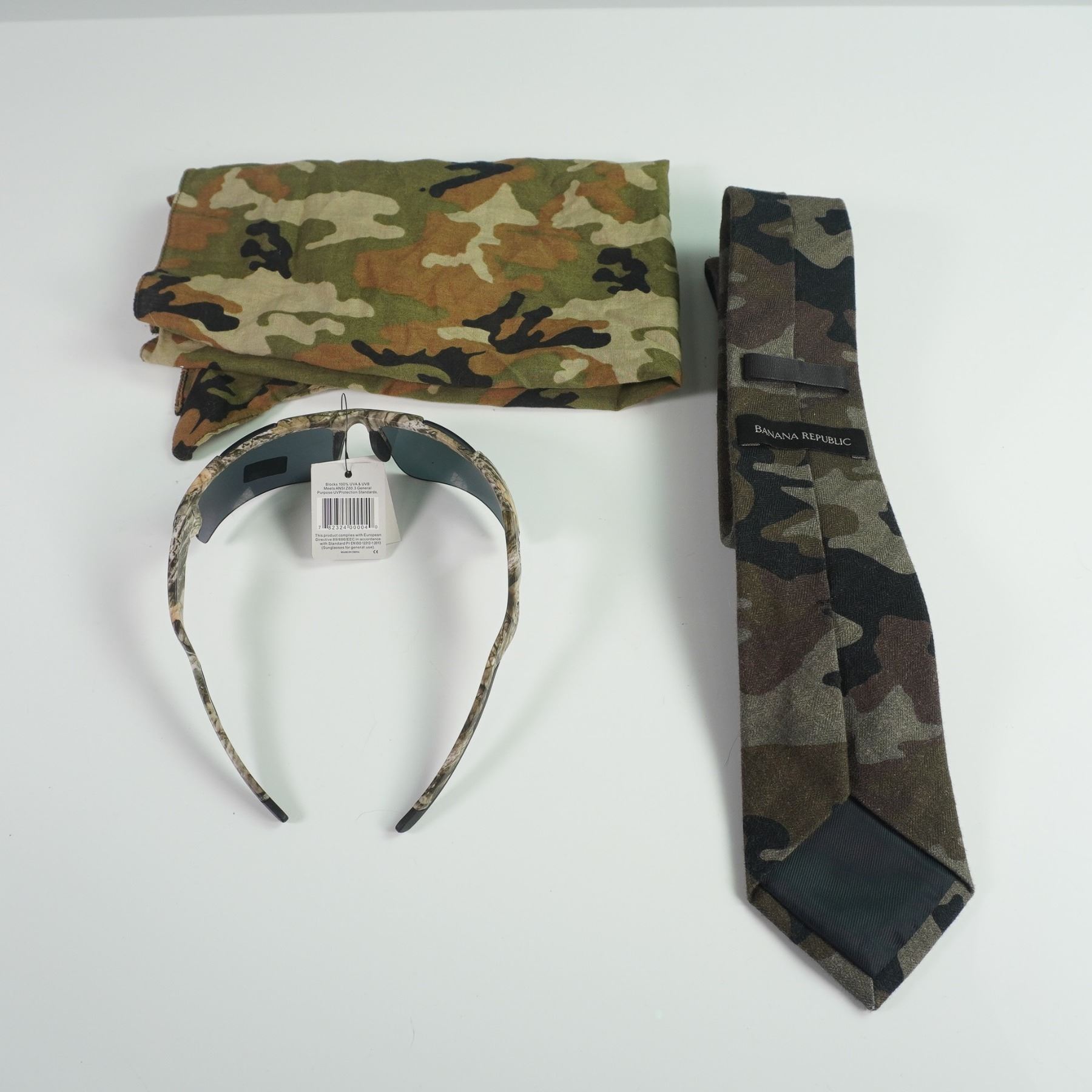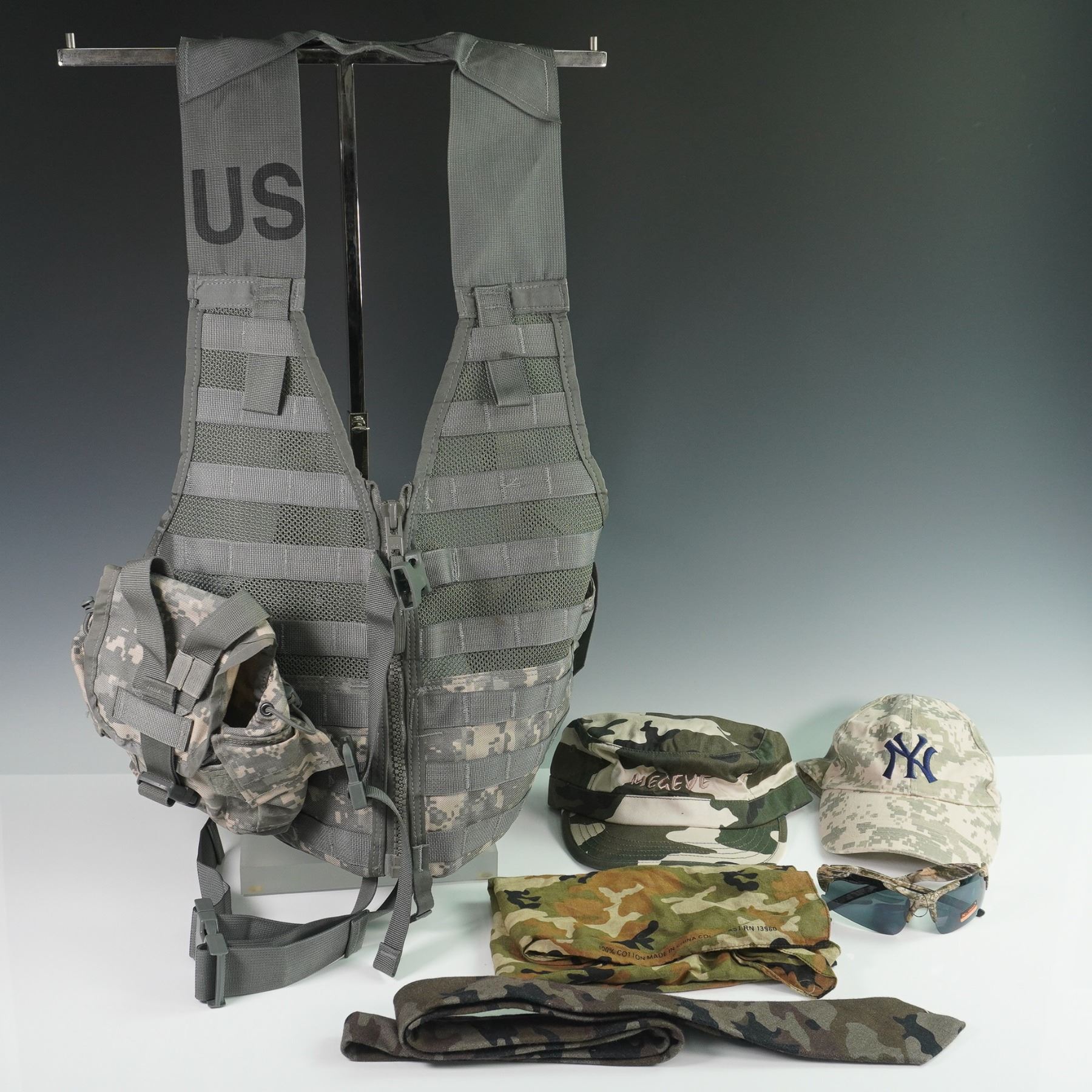 Collection of six military-style and fashion accessories, including a tactical MOLLE vest marked "US" with mesh paneling and strap webbing, featuring an attached ACU digital camouflage utility pouch. Also included are two camouflage hats—one with "MEGEVE" embroidery and the other with a navy NY Yankees logo—along with a camouflage-patterned bandana marked 100% cotton. The lot features a pair of wraparound camo-pattern sunglasses with tinted lenses, and a camouflage tie by Banana Republic.