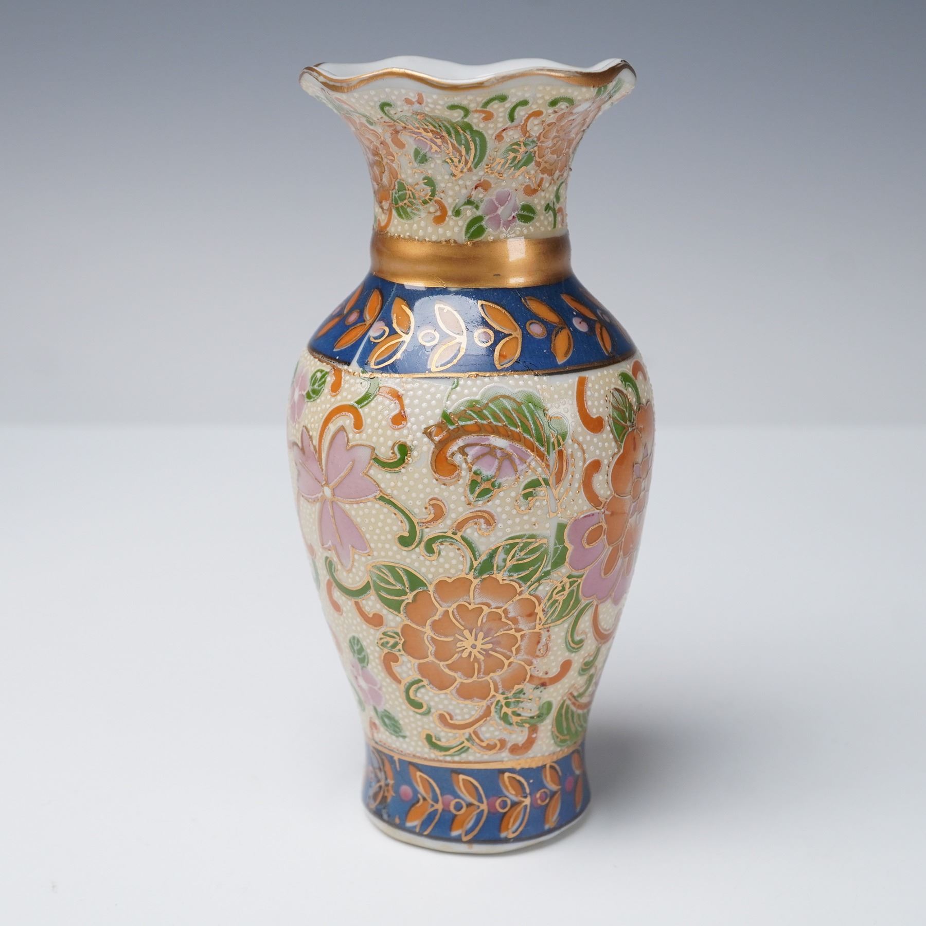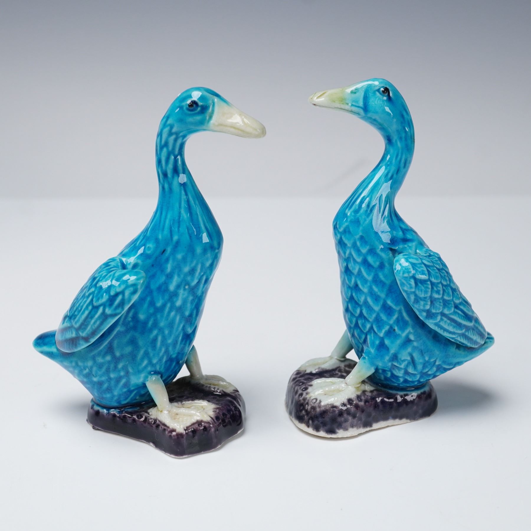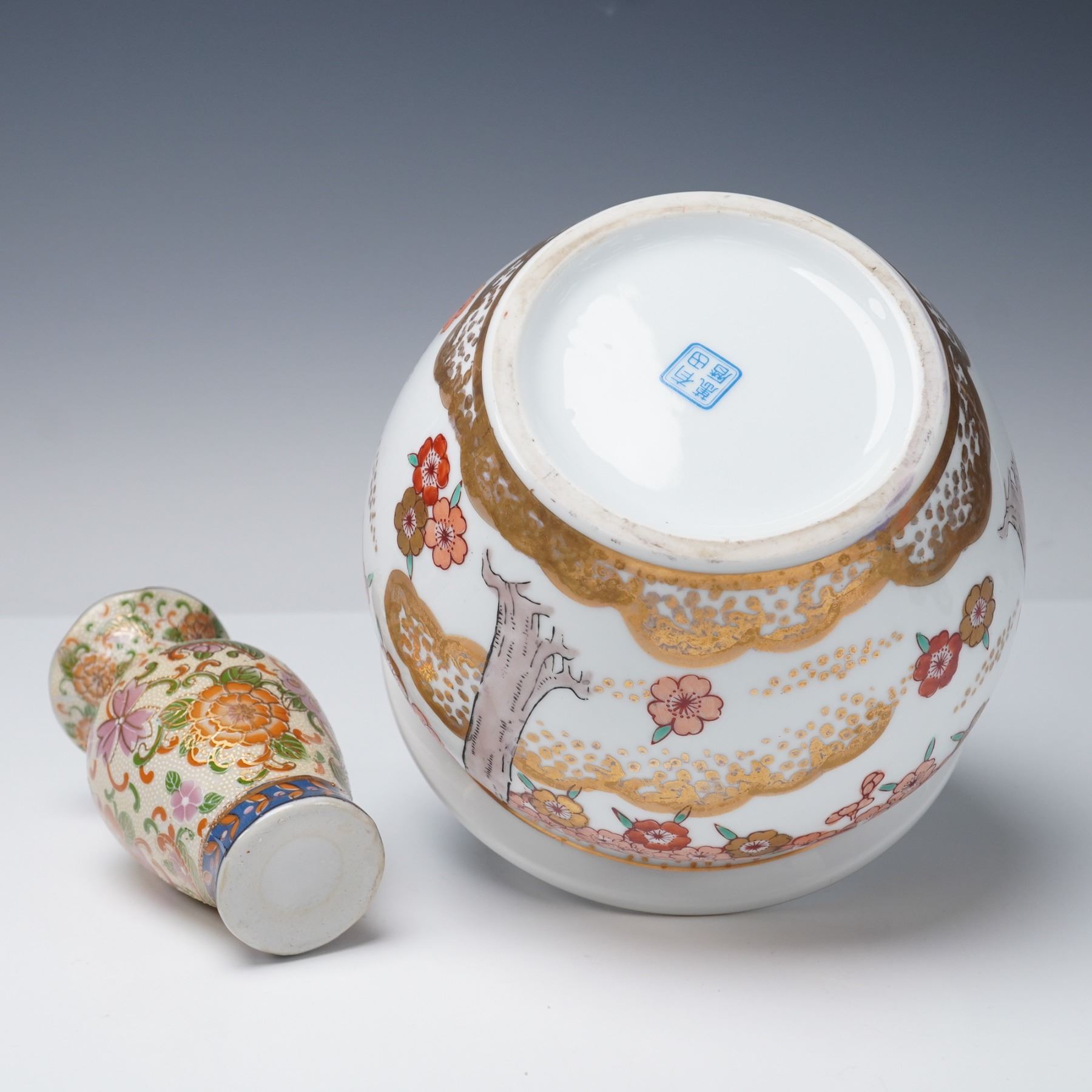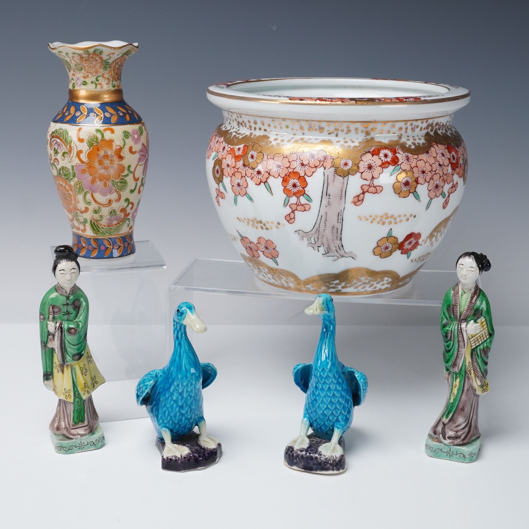 Collection includes two Chinese porcelain mudman-style figures depicting women in famille verte-style enamels with green, yellow, and purple accents. Also featured are two Chinese porcelain turquoise glaze ducks with detailed feather patterns, perched on dark purple glaze bases. The collection further includes a Japanese-style porcelain vase decorated in imitation of Satsuma with raised floral decoration and gilt highlights, and a Japanese-style porcelain planter decorated with red and pink floral blossoms accented in gilt with tree and landscape motifs.