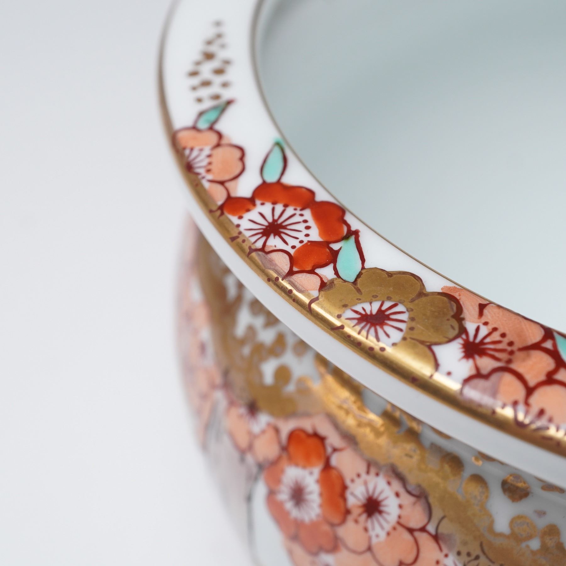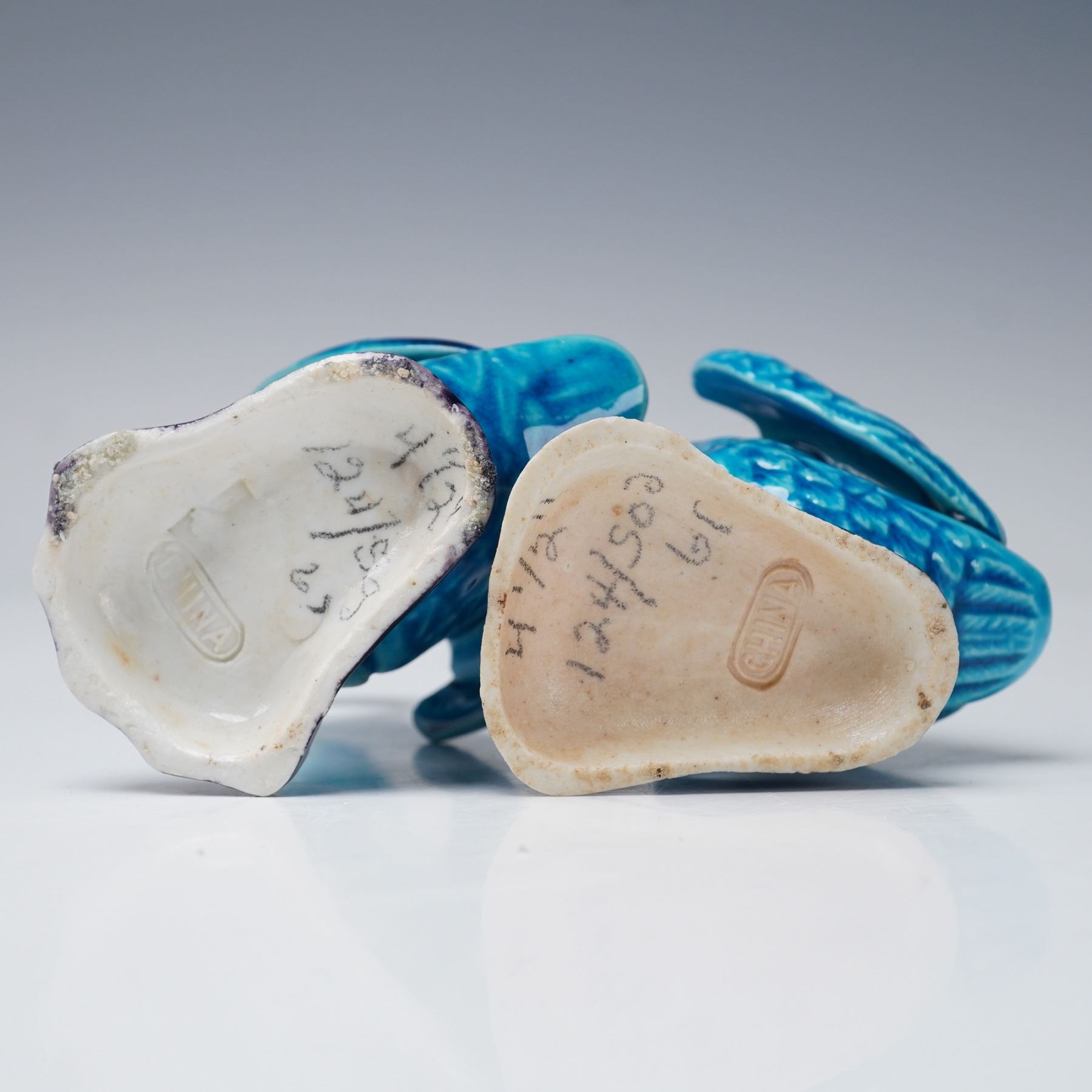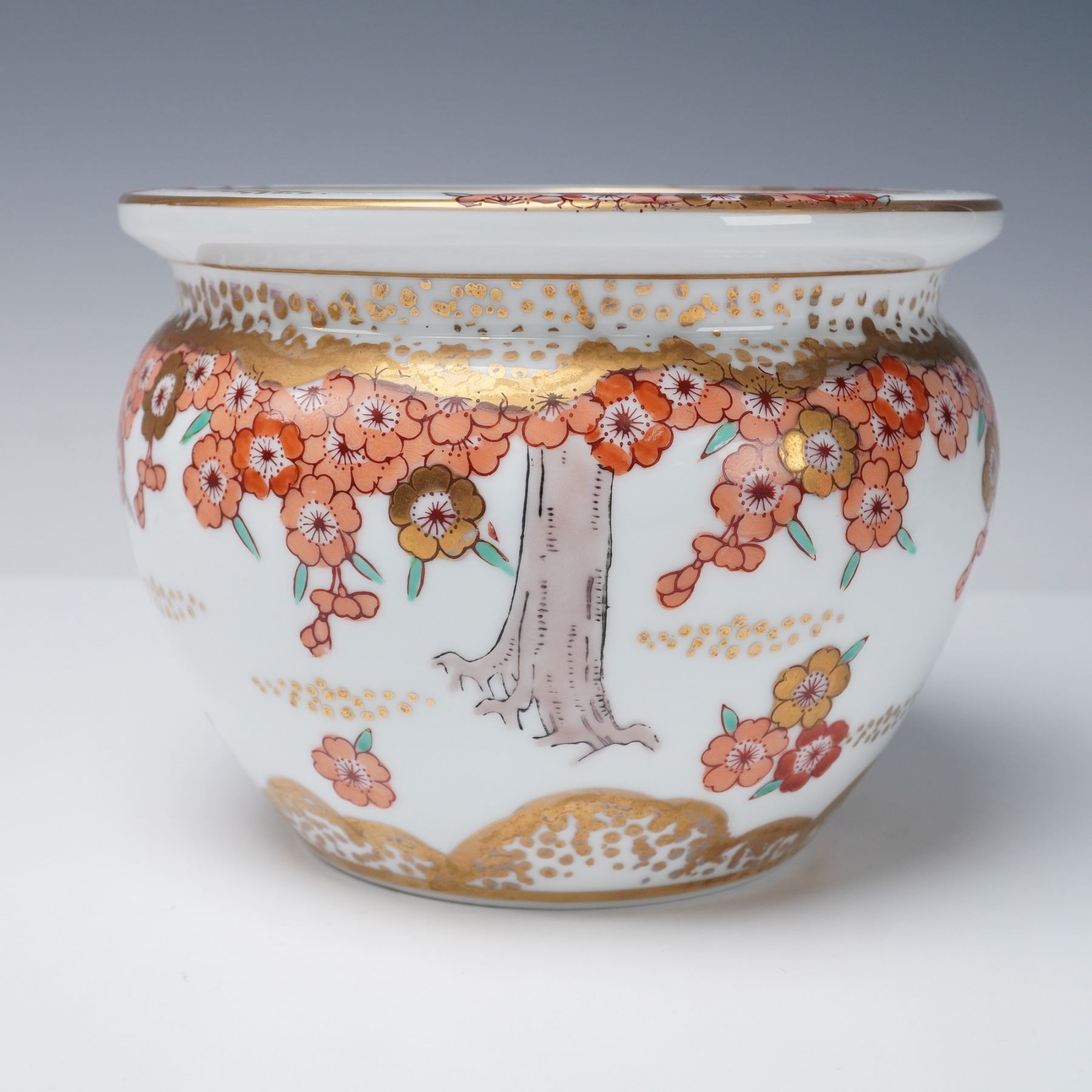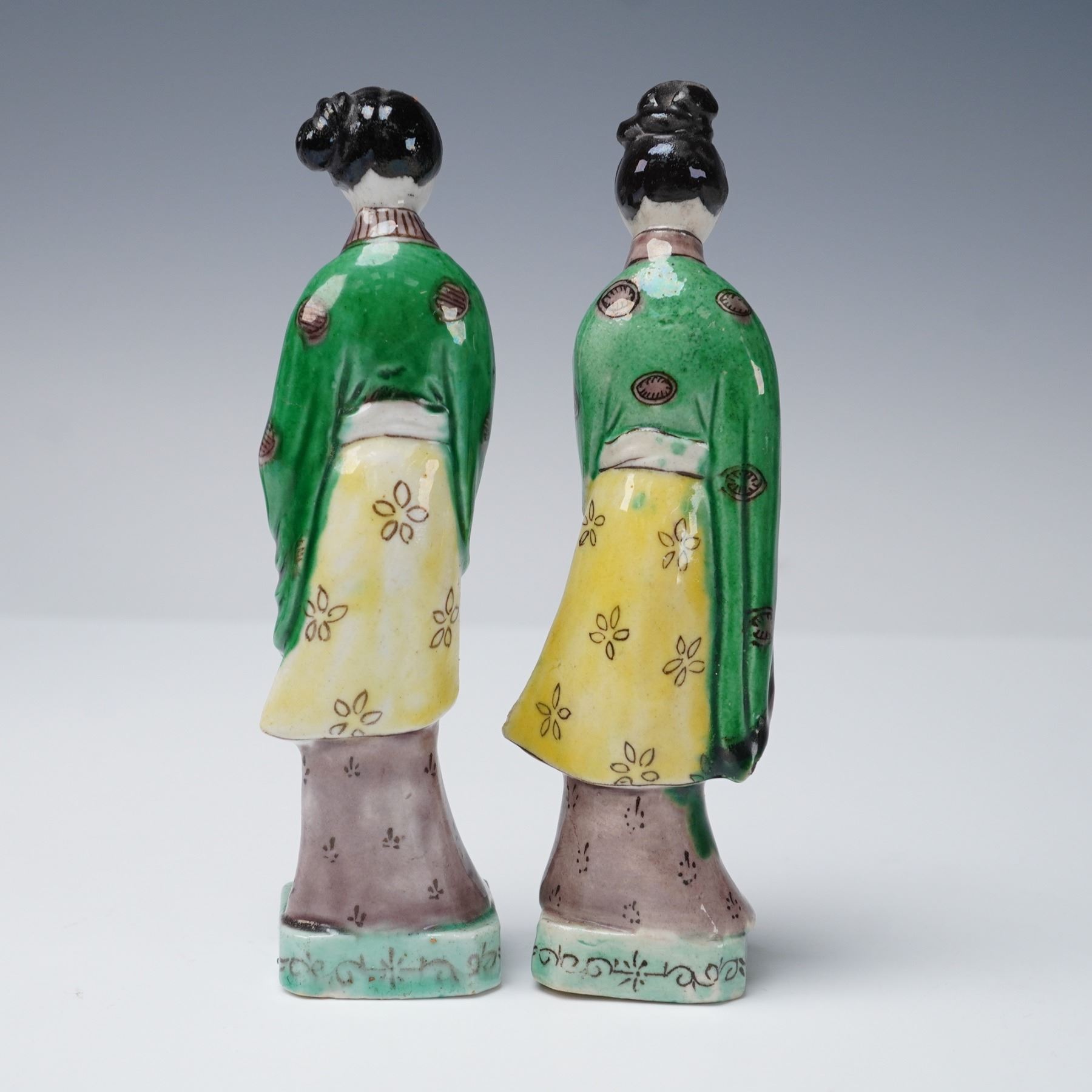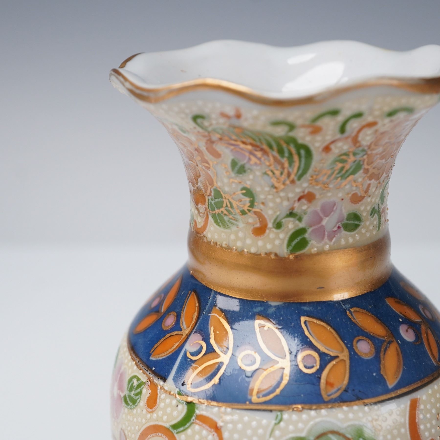 Collection includes two Chinese porcelain mudman-style figures depicting women in famille verte-style enamels with green, yellow, and purple accents. Also featured are two Chinese porcelain turquoise glaze ducks with detailed feather patterns, perched on dark purple glaze bases. The collection further includes a Japanese-style porcelain vase decorated in imitation of Satsuma with raised floral decoration and gilt highlights, and a Japanese-style porcelain planter decorated with red and pink floral blossoms accented in gilt with tree and landscape motifs.