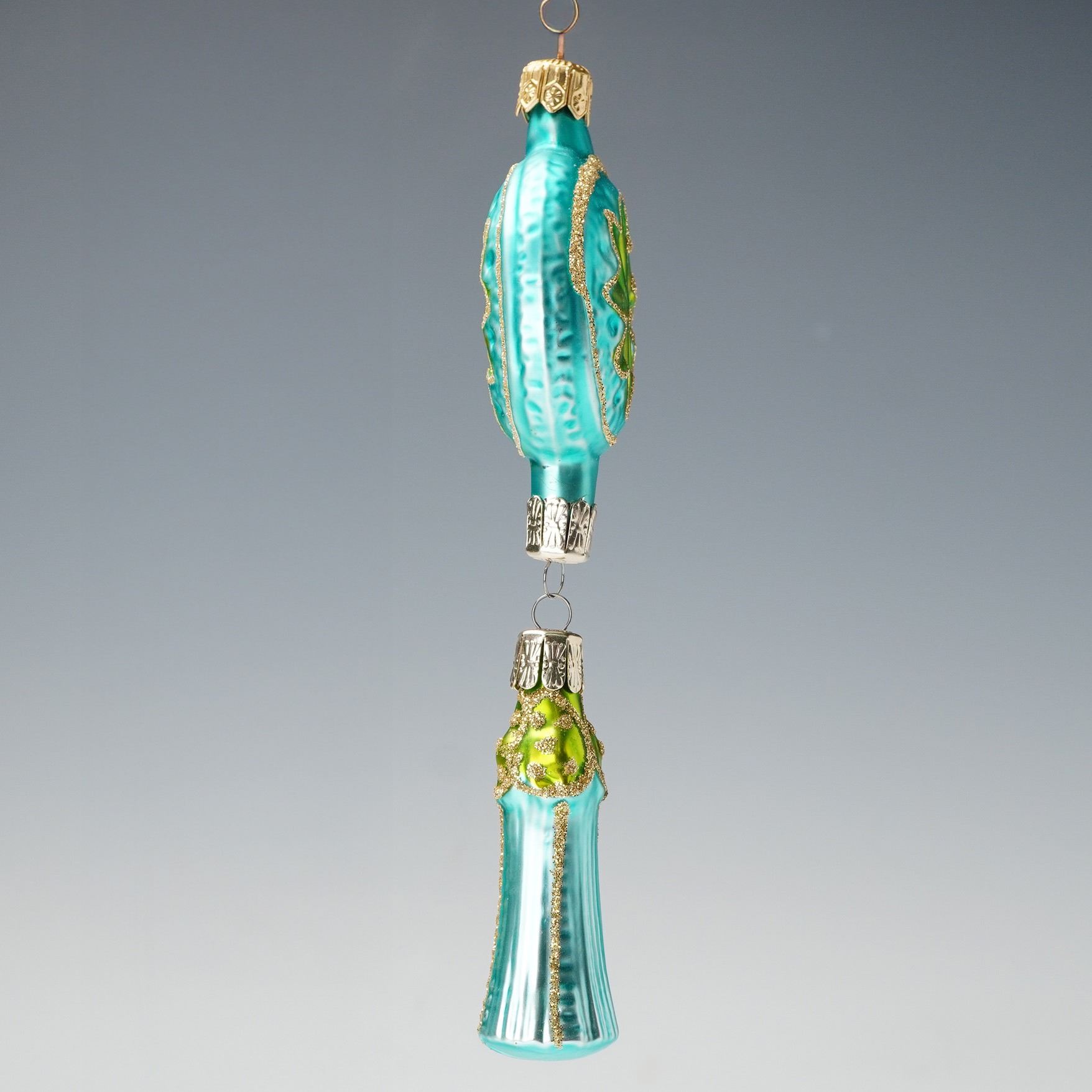 Set of six Christopher Radko glass Christmas ornaments in turquoise and green, each featuring a starburst design with a ribbed drop finial. The ornaments are hand-blown and hand-painted with metallic and glitter accents, finished with original Radko caps and hanging loops. A striking mid-century inspired design adding vibrant color and elegance to any holiday collection.