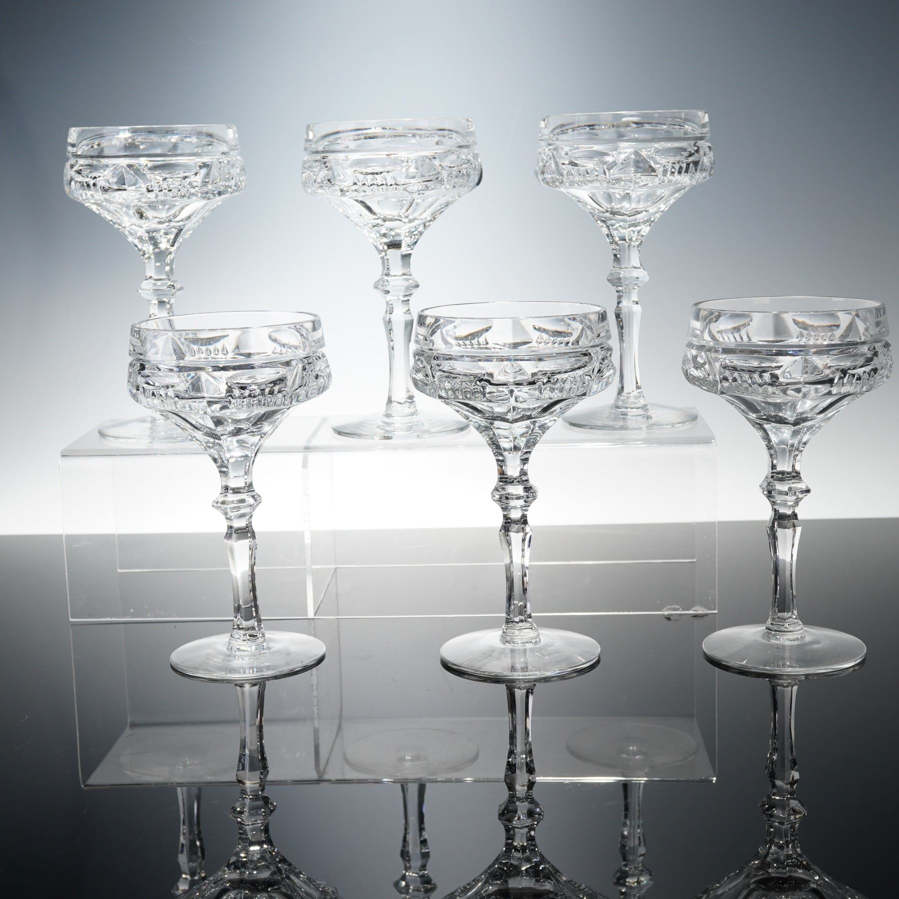 A fine set of six hand-cut crystal champagne coupes, each elegantly crafted with faceted bowls featuring geometric and floral-inspired motifs. The stems are beautifully detailed, tapering gracefully to wide circular feet. The craftsmanship displays remarkable clarity and brilliance, capturing and reflecting light with prismatic sparkle.