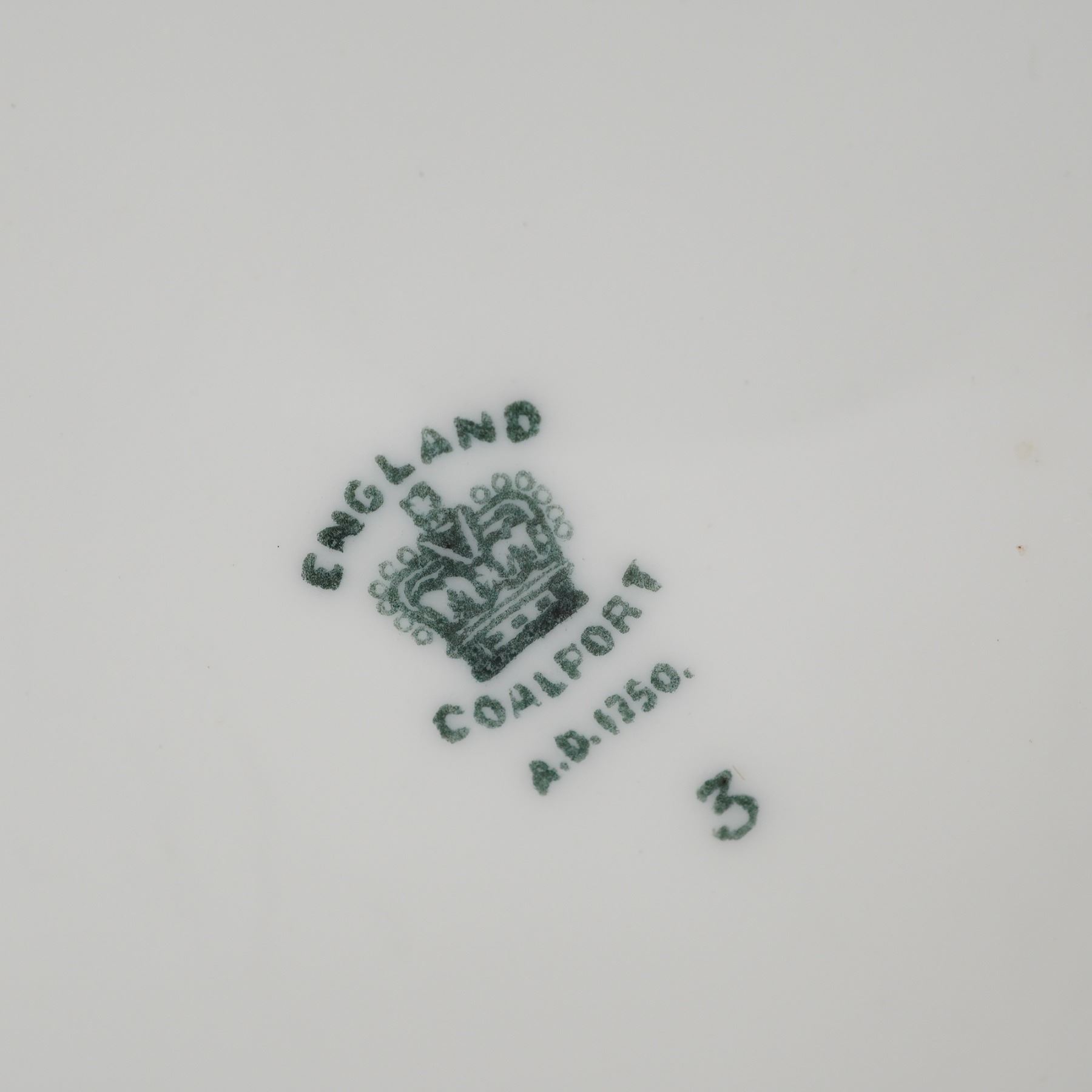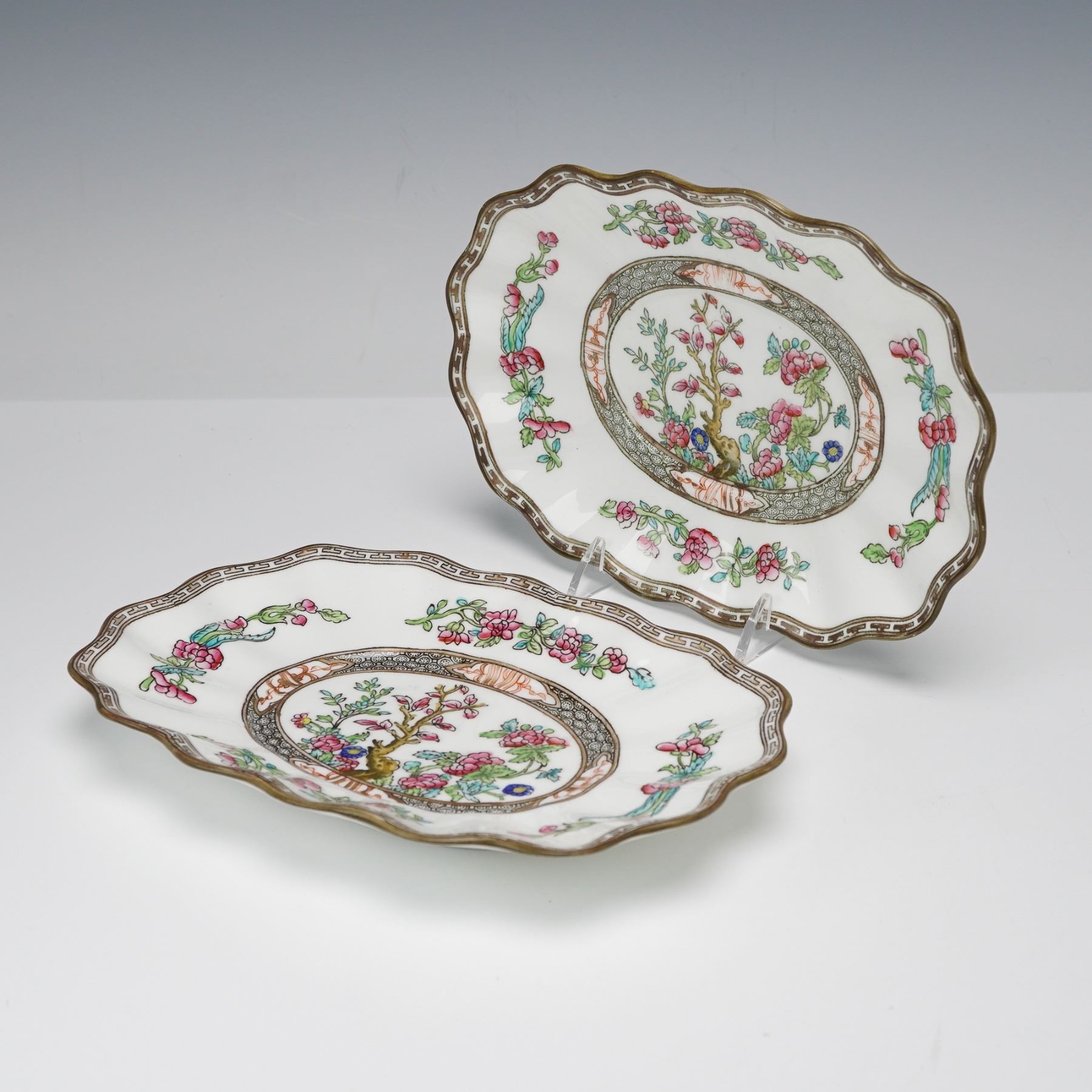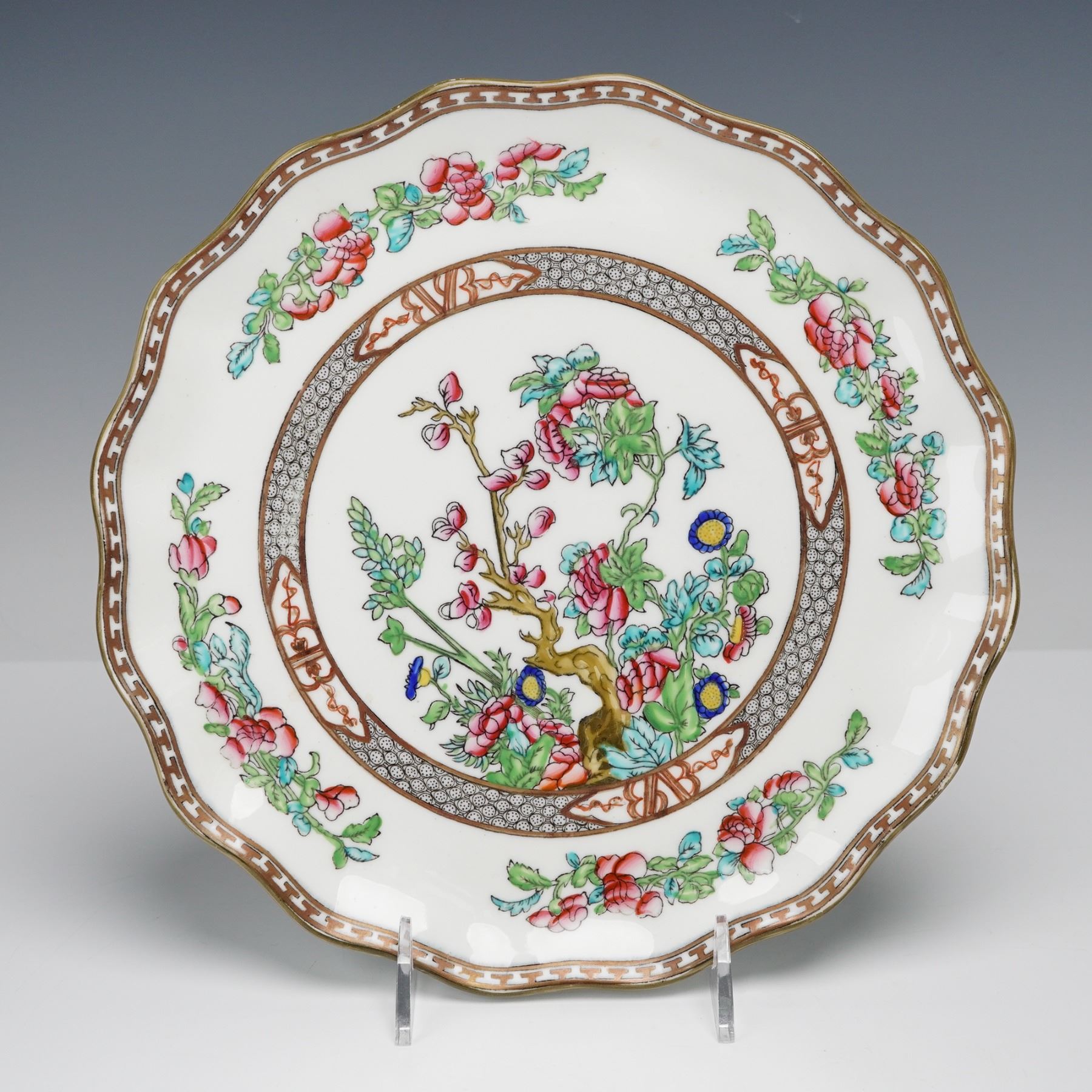 A fine six-piece assortment of porcelain in the beloved Indian Tree Multicolor pattern. The group includes two underplates, two scalloped plates, one bread and butter plate, and one round serving platter. Each piece is richly decorated with the signature multicolor Indian Tree motif, vibrant florals and foliage in pink, green, turquoise, and cobalt, set within gilt and geometric borders. Scalloped and round edges add visual variety to the coordinated grouping. All pieces are stamped Coalport England to the underside.