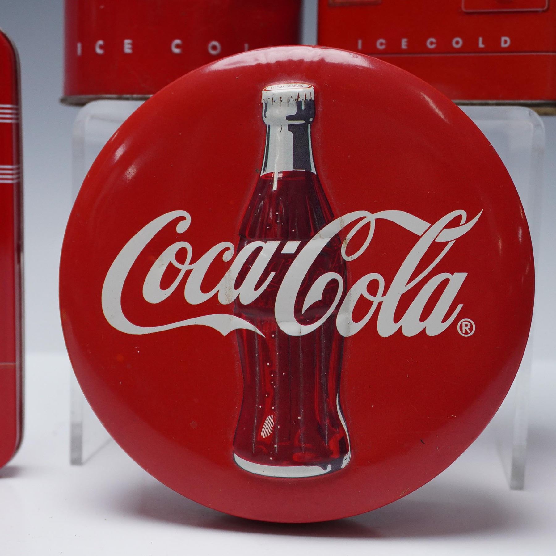 Collection of six Coca-Cola themed items, including five decorative storage tins and one limited edition miniature figurine from the Refreshing Coke Mini Machines Collection. The tins vary in size and design, with vintage-inspired graphics including classic Coca-Cola bottles, vending machines, and slogan artwork. The standout item is a red and white mini vending machine figurine, modeled after a 1930s Coke dispenser, marked N. A0139 and noted as being limited to just 95 casting days. The figurine features detailed molding and bright enamel-like finish, making it a standout for Coca-Cola memorabilia collectors. Largest item measures 9.25"H.