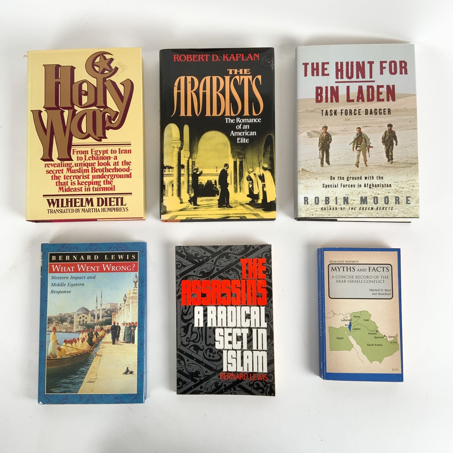 This collection of six books explores various aspects of Middle Eastern history, Islamic movements, and geopolitical conflicts. Included are The Arabists: The Romance of an American Elite by Robert D. Kaplan, which examines the role of American diplomats in shaping U.S. policy in the Middle East, and Holy War by Wilhelm Dietl, a revealing look at the underground operations of the Muslim Brotherhood. The Hunt for Bin Laden by Robin Moore provides an on-the-ground account of the U.S. Special Forces' pursuit of Osama bin Laden in Afghanistan, while What Went Wrong? Western Impact and Middle Eastern Response by Bernard Lewis offers an insightful historical analysis of the decline of Islamic civilization in response to Western influence. Also featured is The Assassins: A Radical Sect in Islam by Bernard Lewis, a scholarly examination of the medieval Islamic sect known for its secretive and politically motivated killings, and Myths and Facts: A Concise Record of the Arab-Israeli Conflict by Michael Curtis and Joseph Hirsch, which serves as a reference guide exploring key historical perspectives on the Arab-Israeli conflict. Largest book measures 9.5"H.
