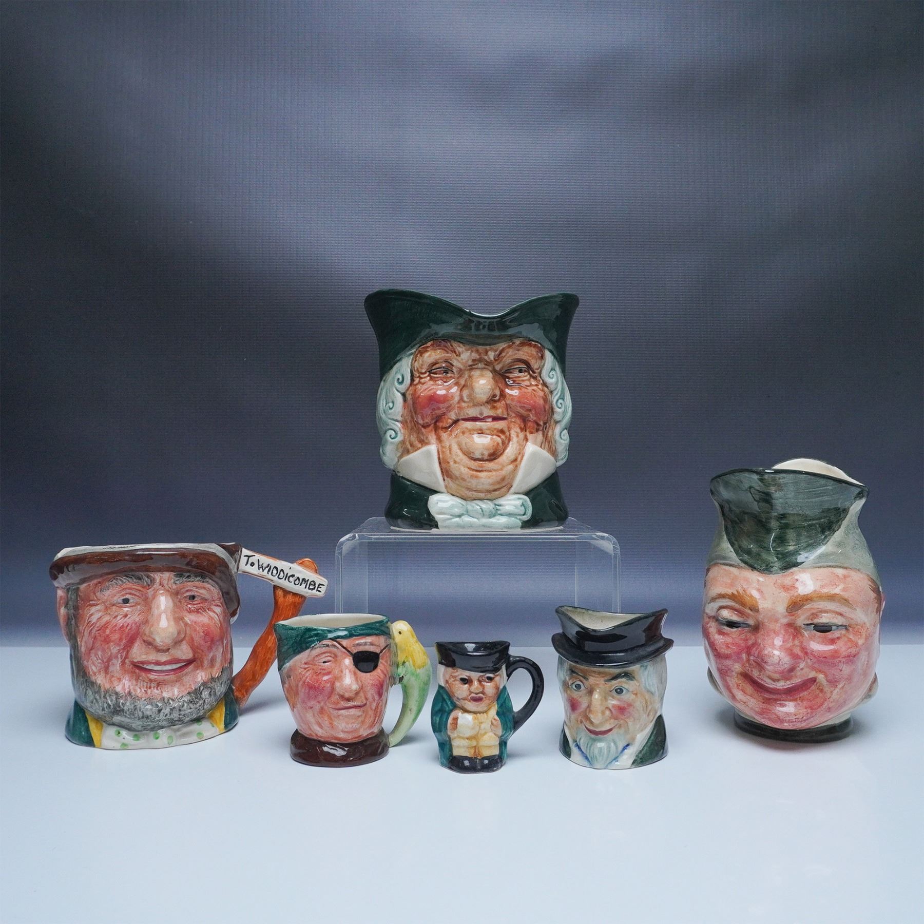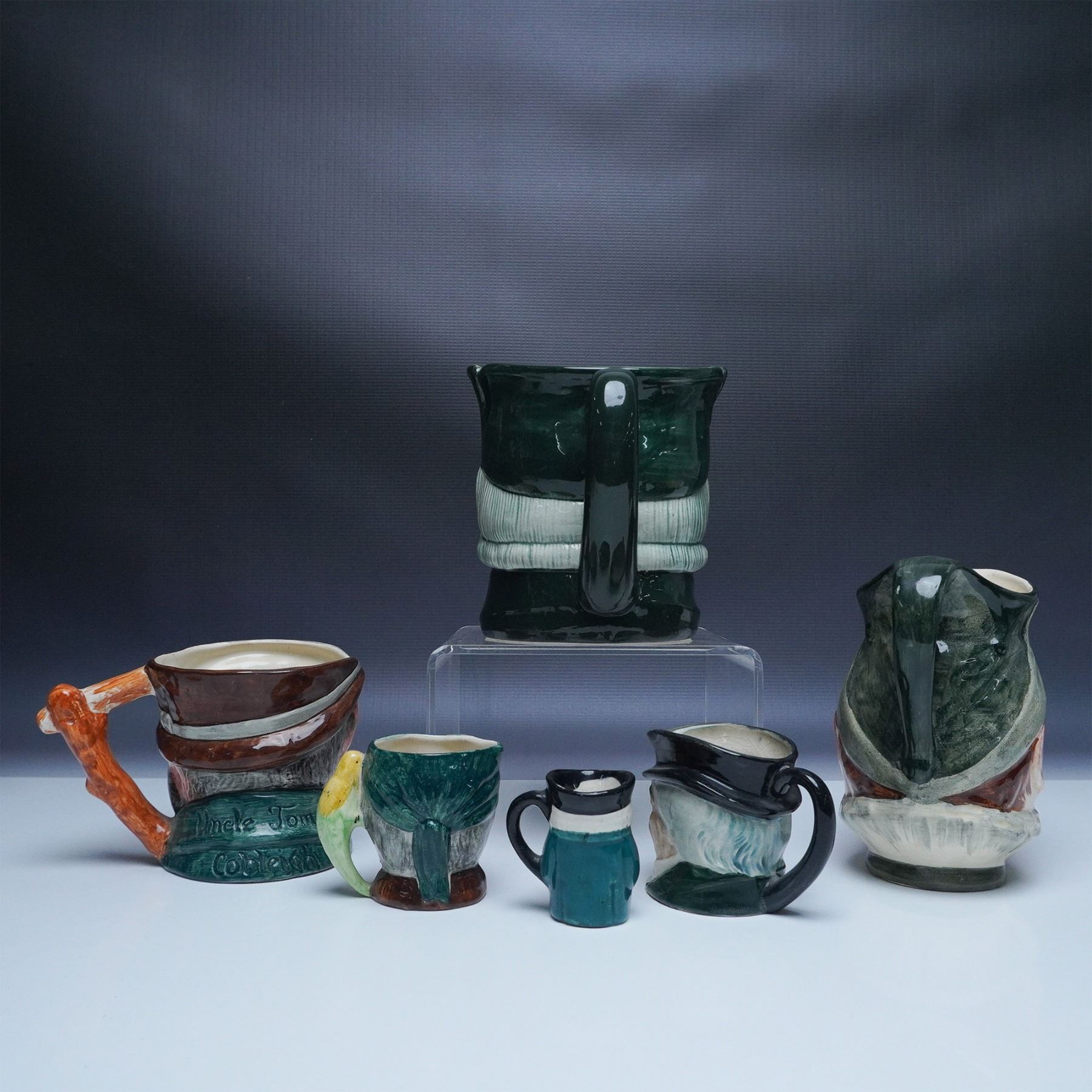 A collection of six character jugs featuring a variety of hand-painted designs with expressive faces and vibrant colors. This set includes both large and small jugs, each showcasing unique craftsmanship. Manufacturers include L & Sons Ltd, Lancasters Ltd, and Marutomoware, with some pieces marked with backstamps. These jugs represent a diverse range of early to mid-20th-century ceramic artistry, making them a great addition to any character jug collection. Largest item: 5"H.