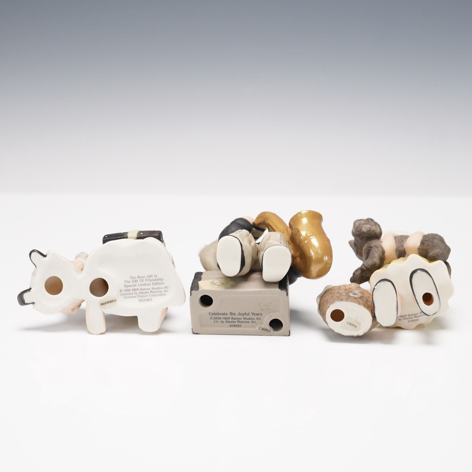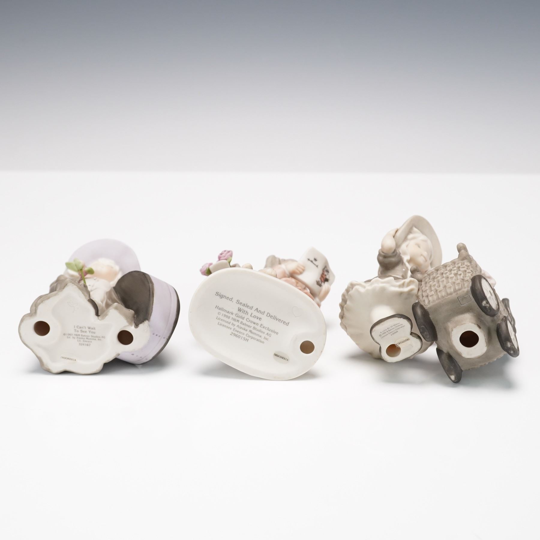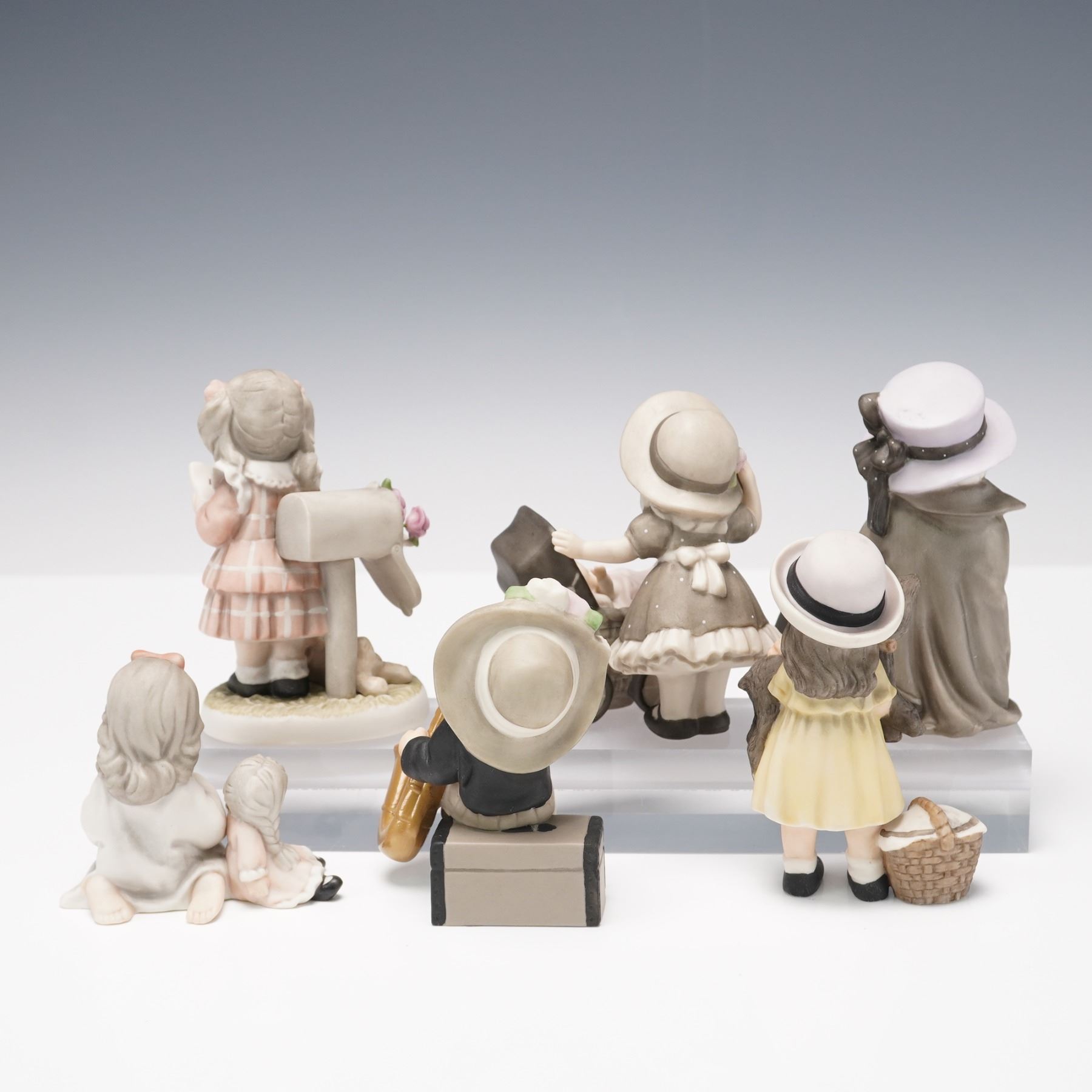 A collection of six bisque porcelain figurines designed by Kim Anderson and produced by NBM Bahner Studios AG, including A Little Bit of Heaven, I Can't Wait To See You, Signed, Sealed and Delivered with Love, celebrating Six Joyful Years, The Best Gift is The Gift of Friendship, and a young girl holding a Schnauzer dog. NBM Bahner backstamp.