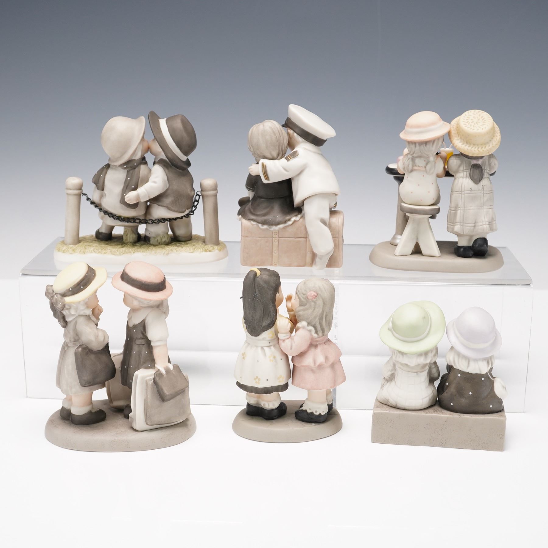 Set of six Enesco porcelain figurines produced in the 1990s. Each figurine captures tender moments between children in vintage-style outfits, posed in sweet and whimsical scenes such as kissing, whispering secrets, and sitting at a cafe. Includes titles like We're Two of a Kind and The Secret of Staying Close. Licensed through Enesco Corporation. A nostalgic and heartwarming collection ideal for display or gifting.