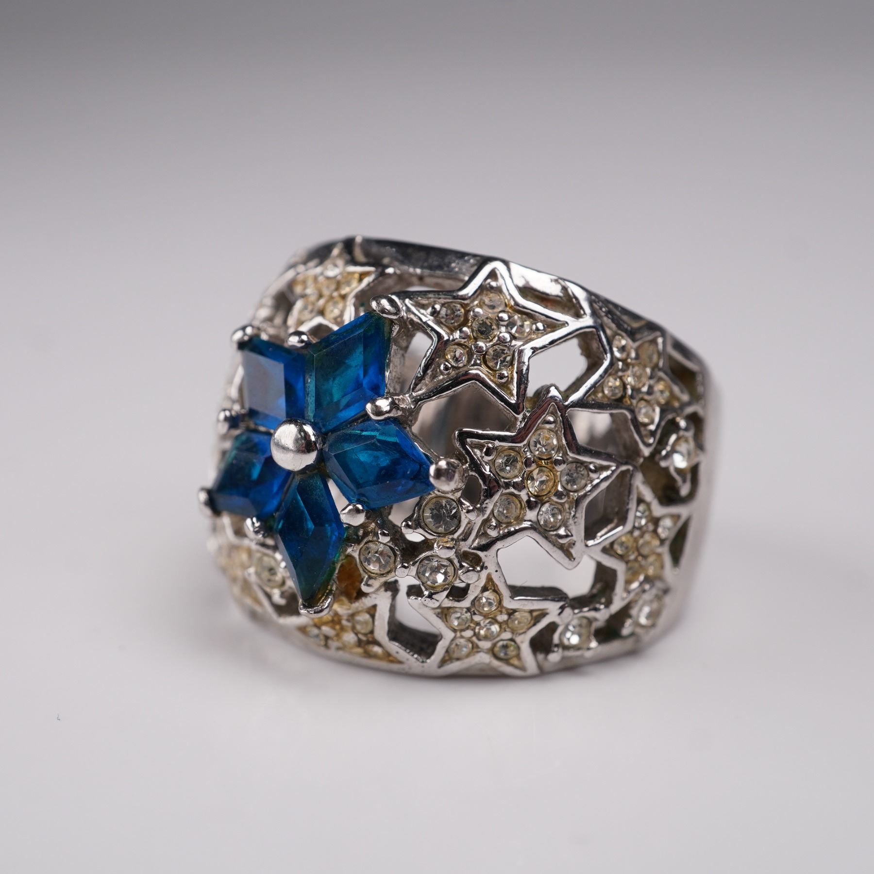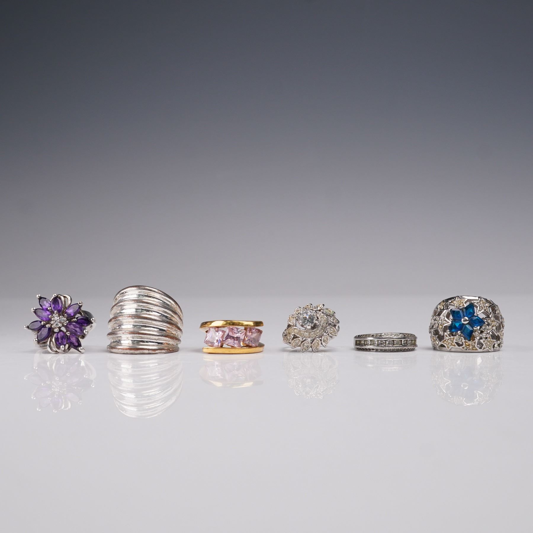 Group of six fashion rings showcasing a variety of colorful designs. Includes pieces set with clear, purple, pink, blue, and mixed stones in bold and decorative mountings. A diverse selection of costume rings with eye-catching styles, offered together as a lot. Combined total weight: 45.51g.