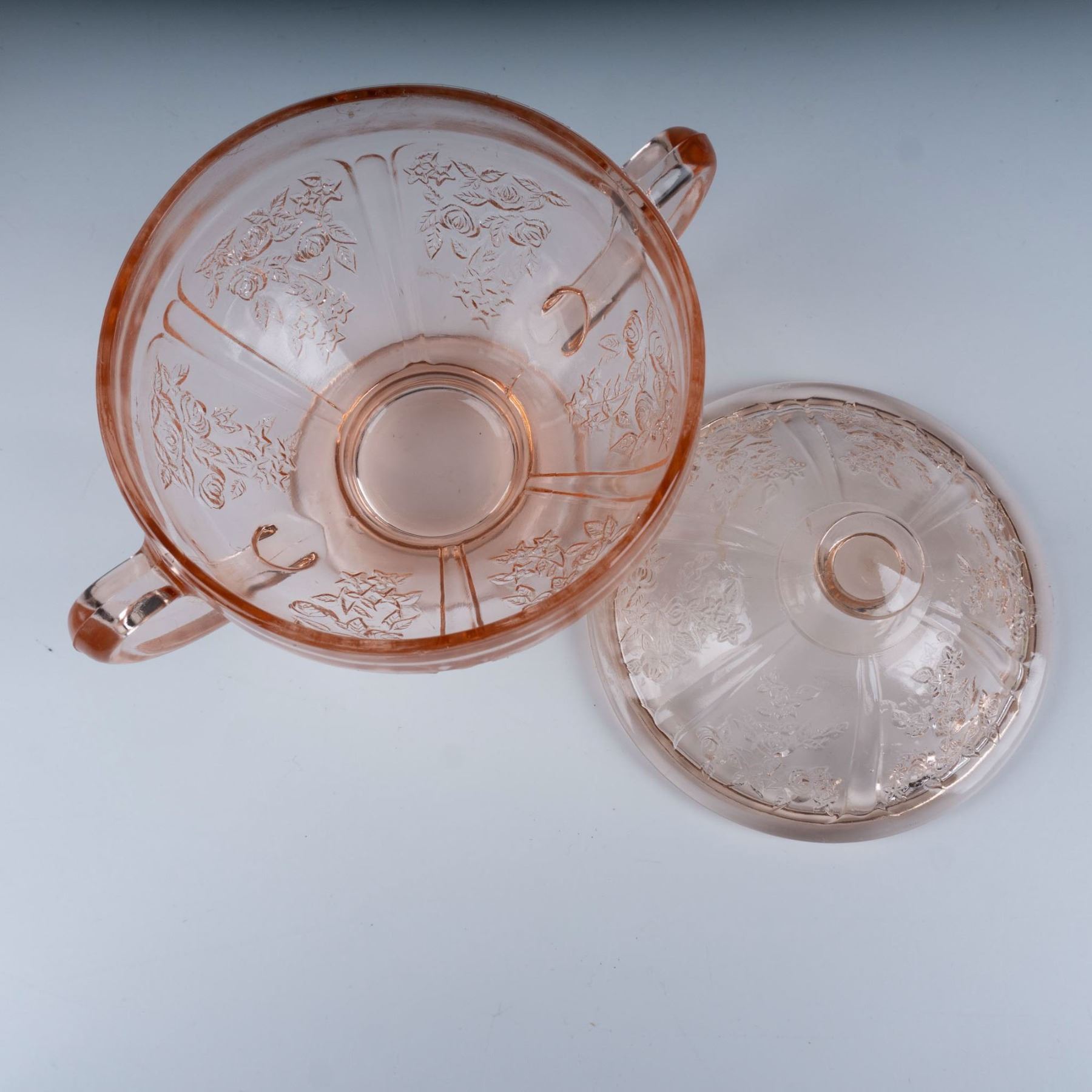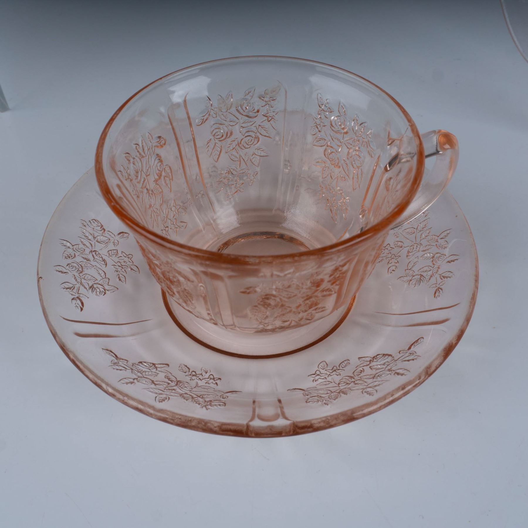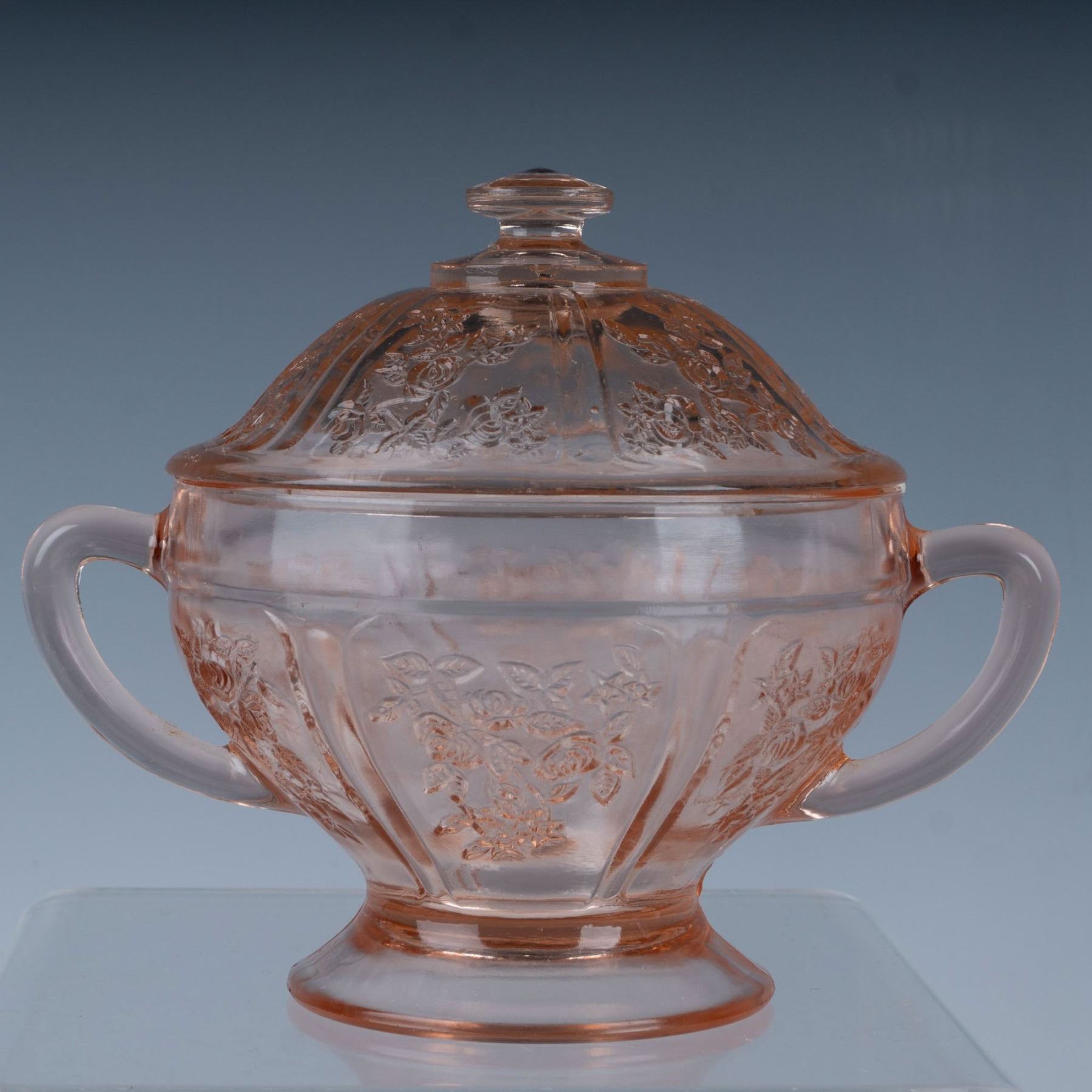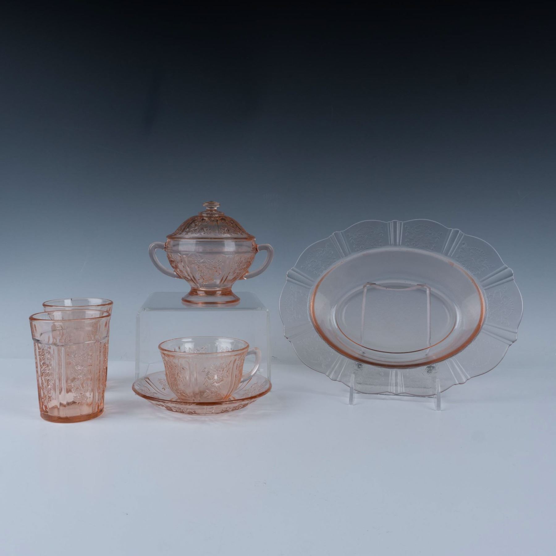 Fantastic collection of pink depression glass featuring the Rose of Sharon or the Cabbage Rose pattern which includes an oval serving bowl, a double handled sugar bowl with a lid, a teacup with a saucer, and two water tumblers. Largest item measures 11"L x 8.25"W x 2.5"H.